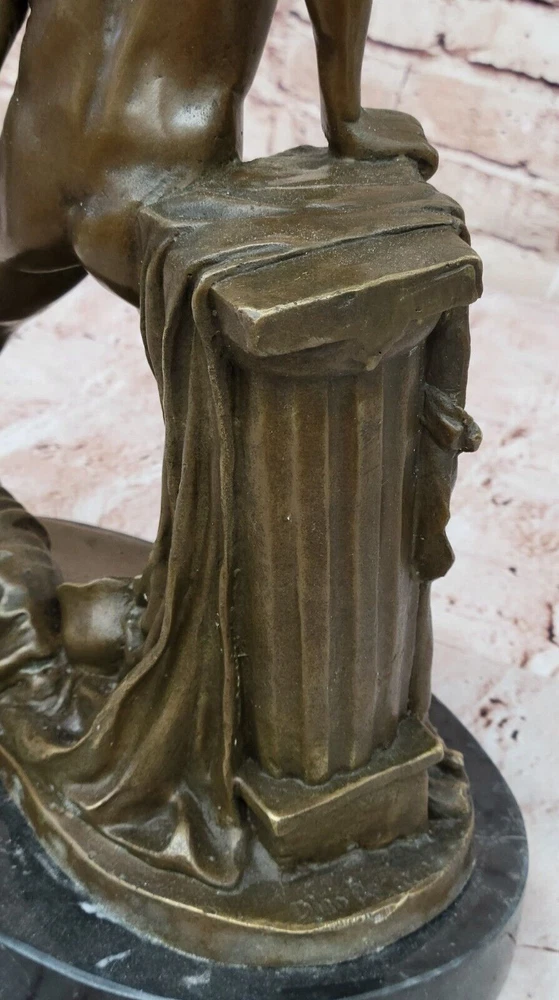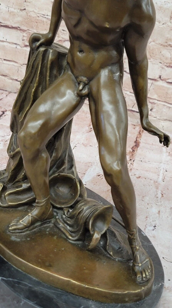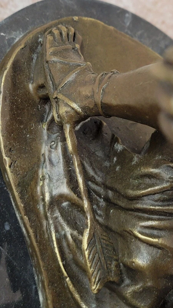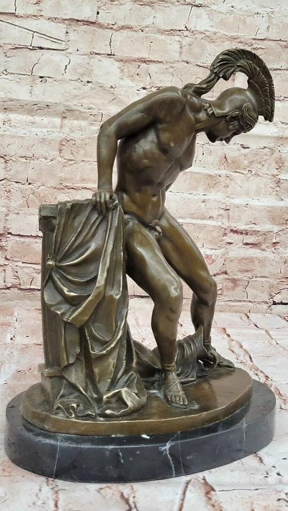 ACHILLES - ANCIENT GREEK WARRIOR SCULTURE FIGURINE IN HOT CAST BRONZE ARTWORK ACHILLES - ANCIENT GREEK WARRIOR SCULTURE FIGURINE IN HOT CAST BRONZE ARTWORK Condition : This sculpture is in perfect condition Bronze Dimensions with Marble Base: Height 14.5" X Width 10" Marble Dimensions: Diameter 10" Height without base:13.5" Weight:17 LBS Inventory:21XN22899212 Crafted by the skilled hands of Dino Decarlo, this bronze statue pays homage to the valor and triumph of ancient Greek warriors. Cast in a rich brown patina, the statue portrays a proud warrior, captured in a moment of triumph after a victorious battle. With one knee bent in a gesture of reverence and gratitude, he raises his spear high in salute to his homeland, his expression exuding exultation and pride. The intricate details of the warrior's chainmail garment, breastplate, helmet, and shield showcase the artist's meticulous craftsmanship, while the delicate patterns adorning his sandals and shin greaves add to the statue's regal aura. Every aspect of the warrior's attire and demeanor speaks to his unwavering courage and unwavering commitment to his country. As a testament to the enduring spirit of ancient Greek warriors, this bronze statue serves as a timeless symbol of bravery and resilience. Whether displayed as a centerpiece in a collector's home or as a focal point in a gallery, it commands attention and admiration, inviting viewers to reflect on the valor and legacy of those who came before us. Large Signed Dino Decarlo Greek Warrior Spartan Bronze Statue Sculpture Figurine www.bronzhaus.com Video will open in a new window Using the eBay App? Paste link into a browser window: [isdntekvideo] Shipping Terms : Most of our items are shipped via USPS (United States Postal Service) mail or UPS. Most orders are shipped within 24-48 hours of purchase. Please be aware that not all items are available for USPS shipping due to size and weight. We do ship to Hawaii, Alaska, Canada, Puerto Rico, APO/AE, and U.S. Virgin Islands, however, an additional charge may be required. Please contact us before making any purchases in these areas. For Non-USA customers, you may be responsible for all duty, tax, brokerage fees that may be due upon delivery (shipping costs cover freight charges only). We also ship internationally. Please refer to the "Shipping and Handling" chart for the rates for each area. Payment : We accept just about any form of payment. PayPal, Master Card, Visa or American Express credit cards. Money orders, cashiers checks, and even personal or business checks. For governmental institutions, we will also accept a purchase order. Please understand that for personal or business checks we have to wait for the check to clear (usually 7 days) before shipping. Condition : New Detailed Hand Crafted Hot Cast Bronze ~Not Resin~ Satisfaction Guaranteed. This is Stock Photo, Slight Color Variation!! Listing and template services provided by inkFrog