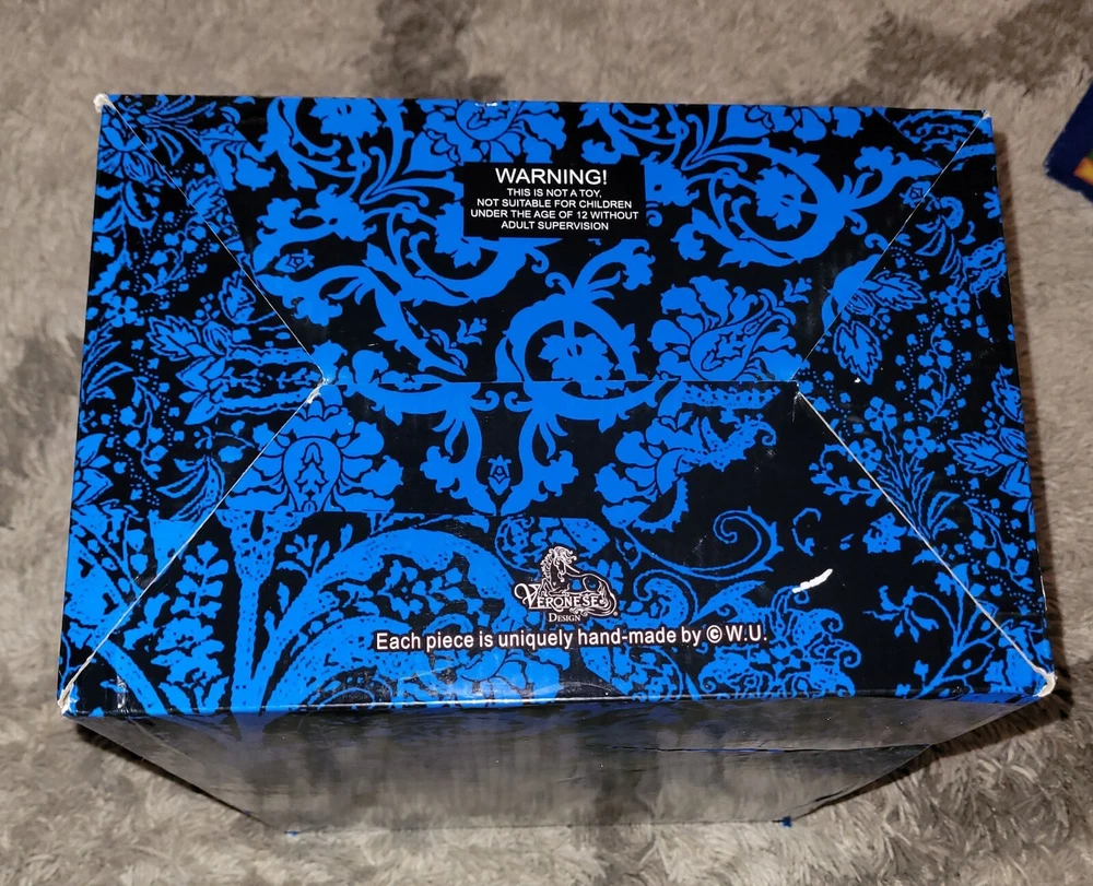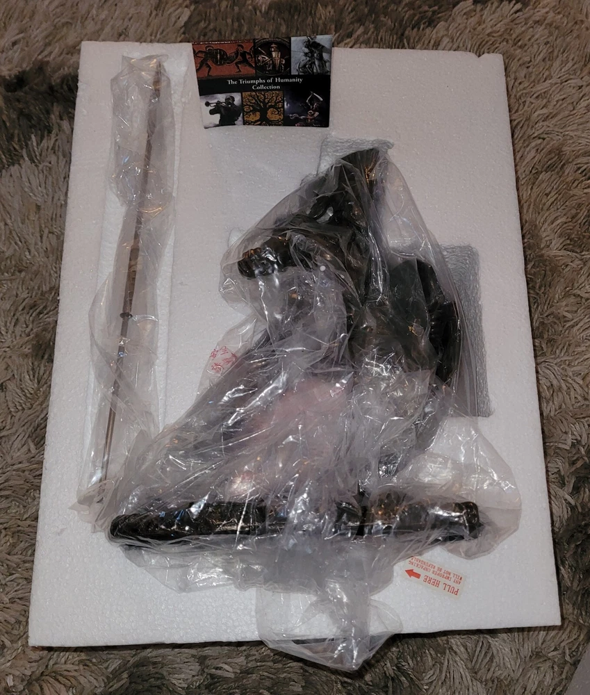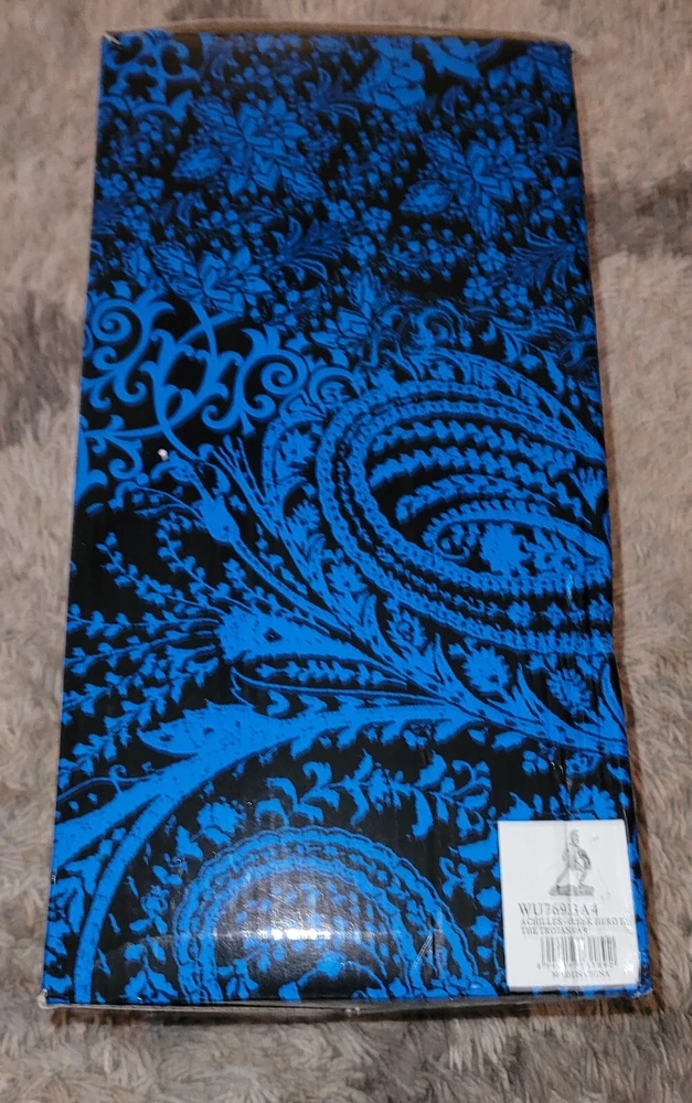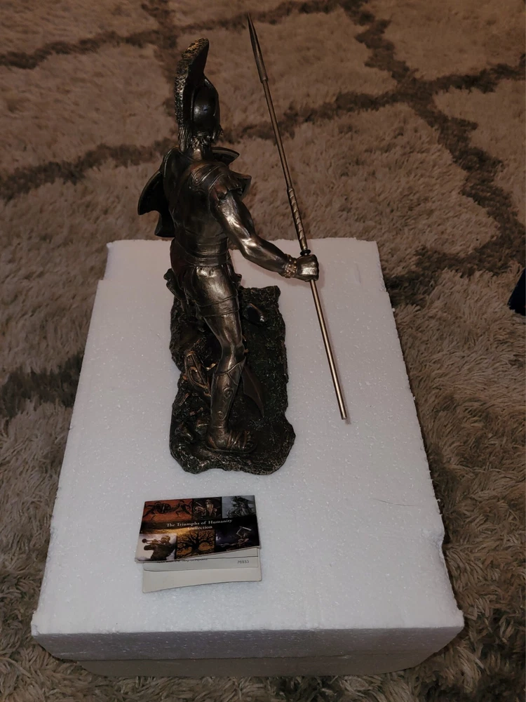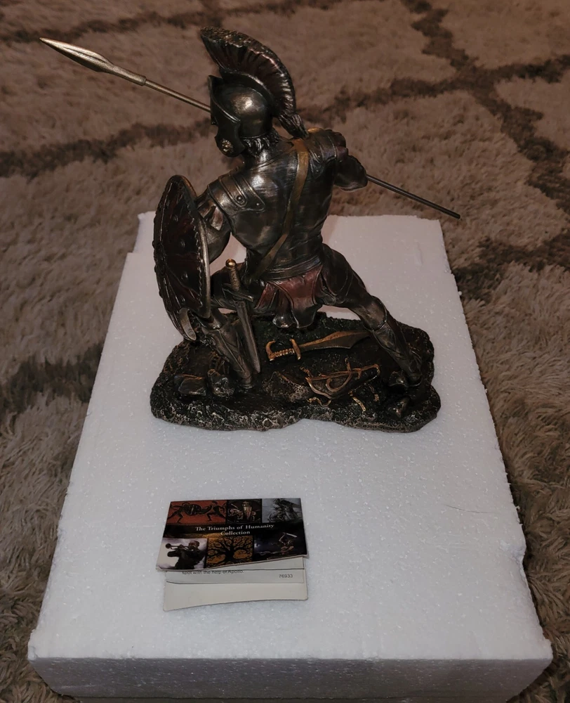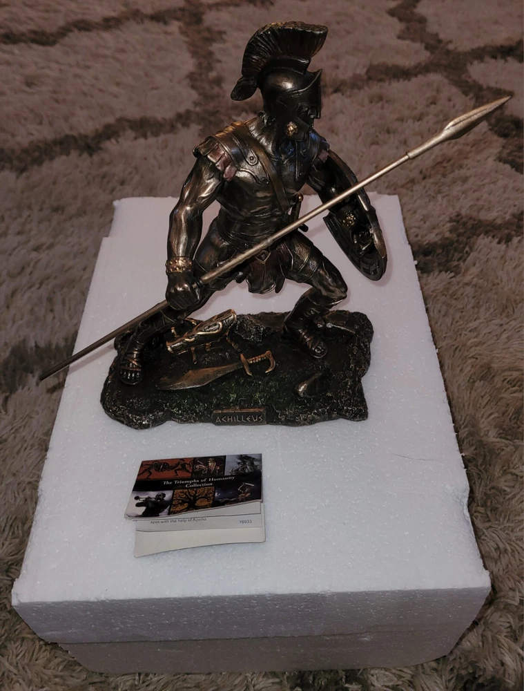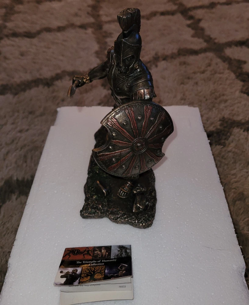 This exquisite sculpture statue depicts the legendary Greek hero, Achilles, with his spear and shield. Crafted by Veronese Design, this piece is a stunning addition to any collection of decorative collectibles. Measuring 9" high, 7" wide, and 3.5" thick, this statue has a beautiful antique bronze color that adds to its classic Greek style. The intricate details of the statue are a testament to the skill of the artisans who created it. Achilles is portrayed with exceptional accuracy and his spear and shield are elegantly designed to complement his heroic appearance. This statue is a must-have for any lover of Greek mythology and art. Shipped with USPS Ground Advantage. Box shows wear from storage.