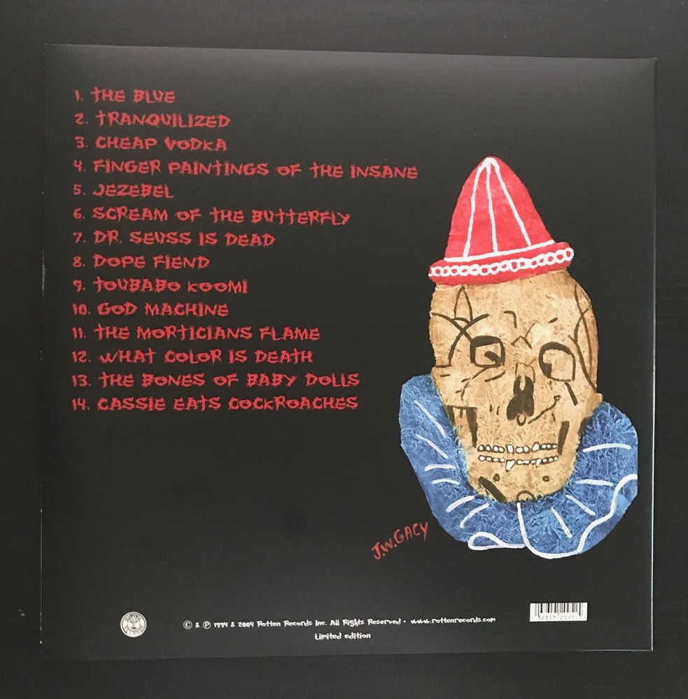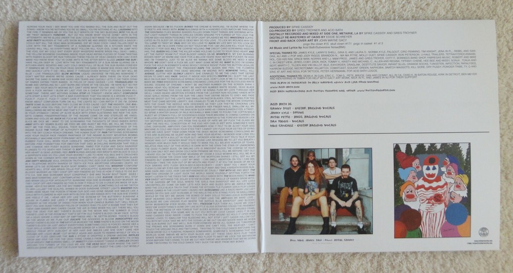 160 gram BLACK VINYL. ACID BATH 'WHEN THE KITE STRING POPS'. New, Mint and Sealed. Gatefold sleeve, double LP. YES WE COMBINE SHIPPING Track listing 1. The Blue 2. Tranquilized 3. Cheap Vodka 4. Finger Paintings of the Insane 5. Jezebel 6. Scream of the Butterfly 7. Dr. Seuss Is Dead 8. Dope Fiend 9. Toubabo Koomi 10. God Machine 11. Morticians Flame 12. What Color Is Death 13. Bones of Baby Dolls 14. Cassie Eats Cockroaches Album notes Acid Bath: Dax Riggs (vocals); Mike Sanchez (guitar, tambourine); Sammy Duet (guitar, background vocals); Audie Pitre (bass, background vocals); Jimmy Kyle (drums). Personnel: Dax Riggs (vocals); Sammy Pierre Duet, Mike Sanchez (guitar, background vocals); Jimmy Kyle (drums); Audie Pitre (background vocals). Recording information: Side One, Metairie, LA, CA. Photographer: Mike Wasco. Acid Bath's debut is a malicious and sometimes downright disturbing album that defies easy categorization. They stitch together elements of death metal, '70s hard rock, thrashing hardcore punk and Black Sabbath-esque sludge into multi-sectioned songs that are both intricate and often surprisingly melodic. The production, especially the compressed drums and often-processed vocals, adds an industrial feel that increases the album's menacing vibe. "The Blue" kicks things off with a bluesy swamp metal riff before smoothly winding its way through a maze of tempo and riff change-ups, while the closer, "Cassie Eats Cockroaches," weaves spoken word samples and screaming vocals in and out of complex, Southern-flavored death metal riffing and precision double-bass drumming. Elsewhere, the songs range from full-on assaults ("Cheap Vodka" and "Toubabo Koomi") to creepy ballads, namely the goth-tinged "Scream of the Butterfly" and the largely acoustic "The Bones of Baby Dolls." Vocalist Dax Riggs handles this diverse material well, switching between distorted screams and a melodic croon reminiscent of Jim Morrison or Glen Danzig. His not-for-the-squeamish lyrics address such topics as drug abuse, rape, abortion, death, and self-loathing, but for the most part do so in an artful, vividly poetic manner. While it would have been stronger if a few of the weaker songs had been left off, When the Kite String Pops is still an excellent, diverse metal album that remains unlike much else, even years after it release. ~ William York Editorial reviews The lyrics would turn even Trent Reznor's stomach. In fact, they make Nine Inch Nails immature dabbling in the darker side of human nature seem like a 9-year-old sneaking a peak at daddy's "Victoria's Secret" catalog. SUBJECTS: Death, keeping warm with burning bodies, death, cockroaches, death, necrophilia, death. Not recommended for dinner table conversations. It's not like you haven't been warned: two John Wayne "them's my spurs, little buddy" Gacy paintings grace the cover. GUITARS: (applicable to most of the vocals too) table saws chewing through nail-studded 12-by-12s; magnified electric razors; the rotors of a Jolly Green Giant helicopter slapping into seagulls. Then again, there's some very accomplished acoustic-flavored picking during the demonic lullabies. DRUMS: 100 car crashes in a minute. VOCALS: Medieval, heavy metal canticles floating like angels over a battlefield; choked-out screams(see Guitars above). The Louisiana bayou fiver brands disturbing, sinister metal into your chest so hard your heart might turn black. If hardcore is the sound of anger, this is the sound of evil. CATEGORY: Death metal gumbo(fins and intestinal casings included). The first pressing was on black vinyl (Skull Clown labels), second pressing on red and blue vinyl, third pressing on clear vinyl, fourth pressing on white vinyl, 5th pressing orange and purple vinyl (all 1,000 units each). 6th pressing on black with Rotten Records labels. 7th pressing on black Rotten (Made in Canada) labels. 8th pressing on black, Rotten (Made in Canada) labels, 160 gram, (1000 made) plus a limited edition of mystery colors 140 gram, (500 made)