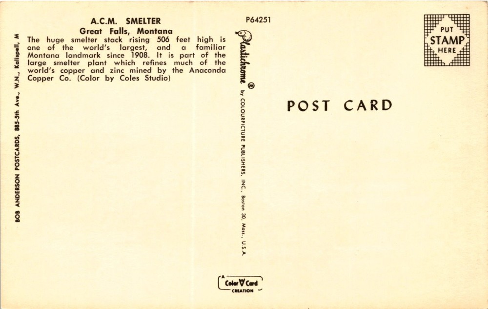 The postcard features an image of the A.C.M. Smelter in Great Falls, Montana, which includes a massive stack rising 506 feet high. This smelter has been a prominent landmark in Montana since 1908 and is one of the largest in the world.