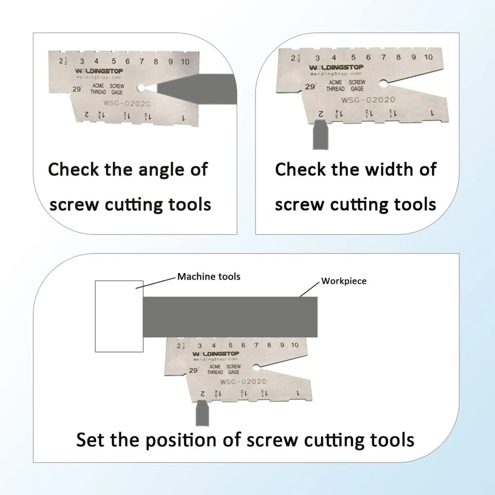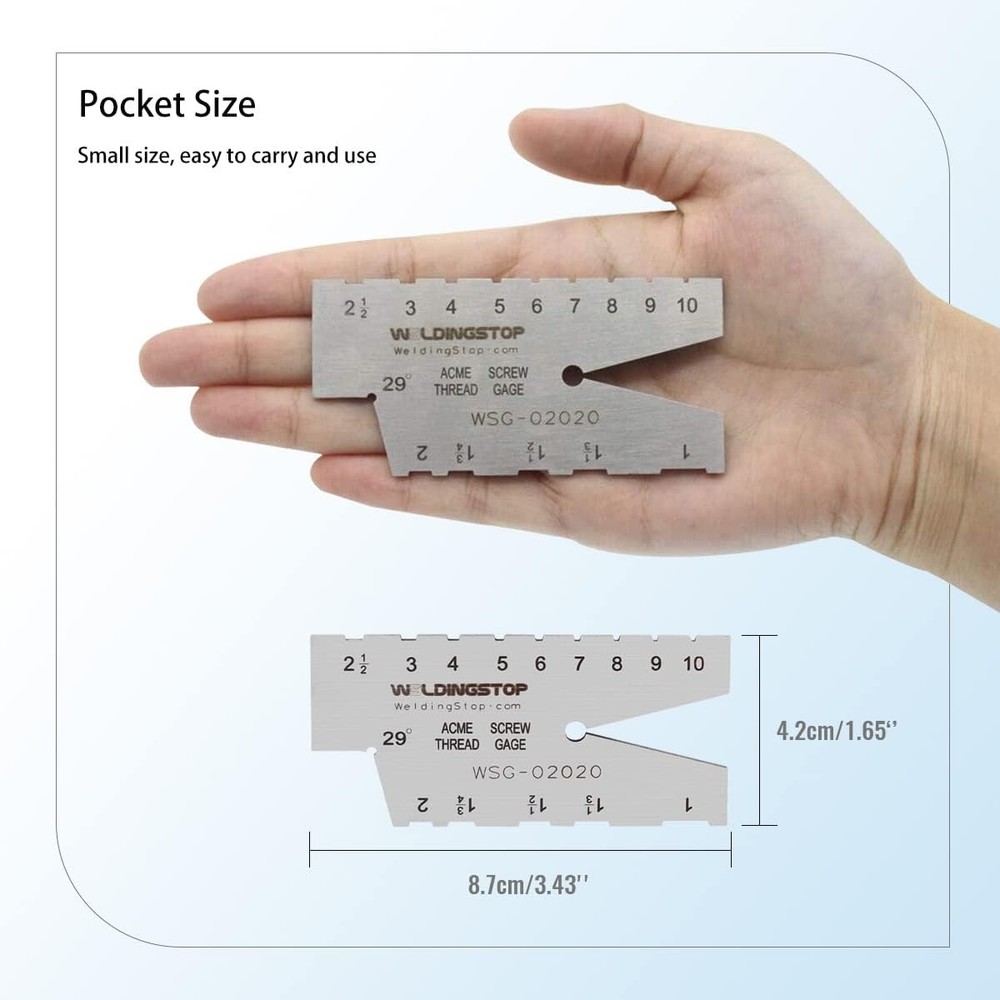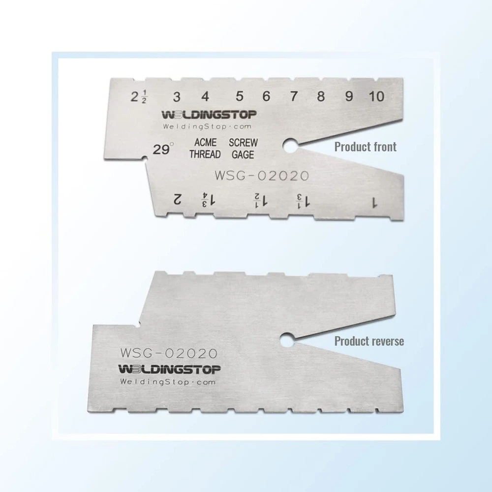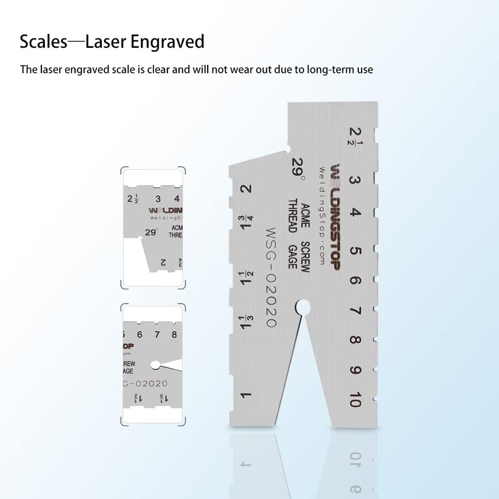 ACME SCREW THREAD GAUGE 29 DEGREE GRINDING GAGE TOOL Laser Engraving S/S Product Details Manufacturer: WeldingStop Item Weight: 1.58 ounces Package Dimensions: 3 x 1.3 x 0.1 inches Material: Stainless Steel Batteries Included?: No Batteries Required?: No Thread Gauge 29° ACME: The 29 degree stainless steel acme thread gauge is a single piece type and it is applied to measure thread and external thread tooth pitch. The acme thread gauge range:1-10TPI,the pitch:1,1-1/3,1-1/2,1-3/4,2,2-1/2,3,4,5,6,7,8,9,10. Suitable for-Standard gauge for check the angle of screw cutting tools: Check the width of screw cutting tools and set the position of screw cutting tools. Material of stainless steel-This acme thread gauge is made by stainless steel. Not easy to rust and not easy to bend. You needn’t to use anti-rust oil or take any anti-rust ways. Just put the 29 degree acme thread gauge in a dry place and it won’t rust. Clear scales-All the scales on the acme screw gauge are laser engraving, not painting and the acme thread gauge is not the copy of laser engraving. Doesn’t worry about the long friction will make the scale unclear.