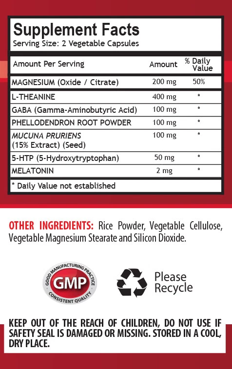 ADVANCED SLEEP FORMULA 952MG WITH: MUCUNA PRURIENS PHELLODENDRON L-THEANINE MELATONIN 5-HTP GABA 1 Bottle 60 Capsules ADVANCED SLEEP FORMULA 952MG: Our sleep support supplement has a superior formula to aid in healthy deep sleep. The natural ingredients that are included in the supplement are: Magnesium (Oxide/Citrate), L-Theanine, GABA (Gamma-Aminobutyric Acid), Phellodendron Root Powder, Mucuna Pruriens, 5-HTP, Melatonin. Brain Enhancer: L-theanine, an amino acid found in green tea, may reduce in the Brain while stimulating production of the inhibitory, relaxing GABA. L-theanine relieves stress in large part because it bears a close resemblance to the Brain-signaling compound glutamate. Studies suggest a potential role for L-theanine in supporting cognitive function. Studies such as these demonstrate that L-theanine can specifically reduce the molecular impacts of stress on Brain cells. Sleep Enhancer: GABA has a calming, sedative effect and may be able to help naturally induce sleep by reducing nerve excitability. Study found that taking GABA helped participants fall asleep quickly, shortening the amount of time it took to fall asleep by an average of five minutes. Besides using GABA for sleep, maintaining a regular sleep schedule, limiting your caffeine intake and taking magnesium to help promote GABA function can all also encourage better sleep. Emotional Health Support: In addition to decreasing and regulating sleep, the GABA neurotransmitter is also thought to play a central role in emotional well-being. Research has found that people with emotional problems tend to have lower levels of GABA than those without it. Mood swings also have been shown to be improved with GABA supplementation. Focus Tuner: Increasing GABA production may result in an improvement in energy to maintain sharp focus. Short attention spans may be lengthened as increased GABA levels help with focus and concentrative ability. GABA’s benefits consist of an inhibitory effect on over-excitation within the Brain has a calming and soothing effect which contributes to a person’s sense of well-being. Athletic Recovery Support: Phellodendron along with other many ingredients in this supplement work together to help athletes rest and repair, ready to hit their workouts the next day. Recovery after the workout will be much more effective for the athlete since the ingredients aid in fight off the stresses and at the same time have calming and can support Brain functions. Sexual Health Support: Mucuna pruriens is an aphrodisiac, bolstering healthy sexual energy and libido. Mucuna also can be benefical for supporting healthy sex drive and sexual enhancement in both male and female. The natural ingredient also may increase natural Testosterone levels. Slow Aging: The content of flavonoids in Mucuna Pruriens are also useful in stopping premature aging. Self-aging can occur because the skin is often exposed to air pollution and direct sunlight. The flavonoid will lift the dull skin and regenerate dead skin from these problems. In addition, flavonoid also may protect and maintain skin health. Supplement Facts Serving Size: 2 Vegetable Capsules MAGNESIUM (Oxide / Citrate) 200 mg 50% L-THEANINE 400 mg * GABA (Gamma-Aminobutyric Acid) 100 mg * PHELLODENDRON ROOT POWDER 100 mg * MUCUNA PRURIENS (15% Extract) (Seed) 100 mg * 5-HTP (5-Hydroxytryptophan) 50 mg * MELATONIN 2 mg * OTHER INGREDIENTS: Rice Powder, Vegetable Cellulose, Vegetable Magnesium Stearate and Silicon Dioxide. SUGGESTED USE: 1 to 2 capsules taken at bedtime or as directed by a healthcare professional. FOR RELIEF OF OCCASIONAL SLEEPLESSNESS ONLY. CAUTION: Do not exceed the recommended dose. This product is not intended for pregnant or nursing mothers, children under the age of 18, or individuals taking any prescription medication including anti-depressants. Avoid driving or performing other potentially dangerous tasks while taking this formula. If you have questions about the advisability of taking this product, consult a physician prior to use. This product is manufactured and packaged in a facility which may also process milk, soy, wheat, egg, peanuts, tree nuts, fish and crustacean shellfish. * These statements have not been evaluated by the Food and Drug Administration. This product is not intended to diagnose, treat, or prevent any disease. PREMIUM QUALITY PRODUCT