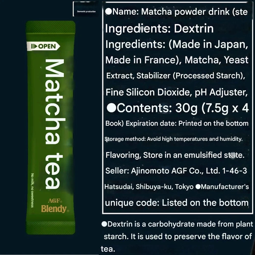Number in Pack: 8 Form: Powder Country/Region of Manufacture: Japan Food Aisle: Pantry Number of Servings: 2 Food Specifications: Sugar Free Regional Cuisine/Region: Japanese Brand: AGF UPC: 4901111665026 Type: Matcha Product: Tea & Infusion Item Weight: 30 g gtin13: 4901111665026