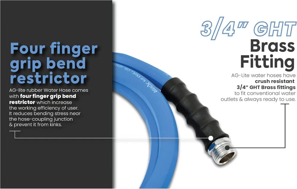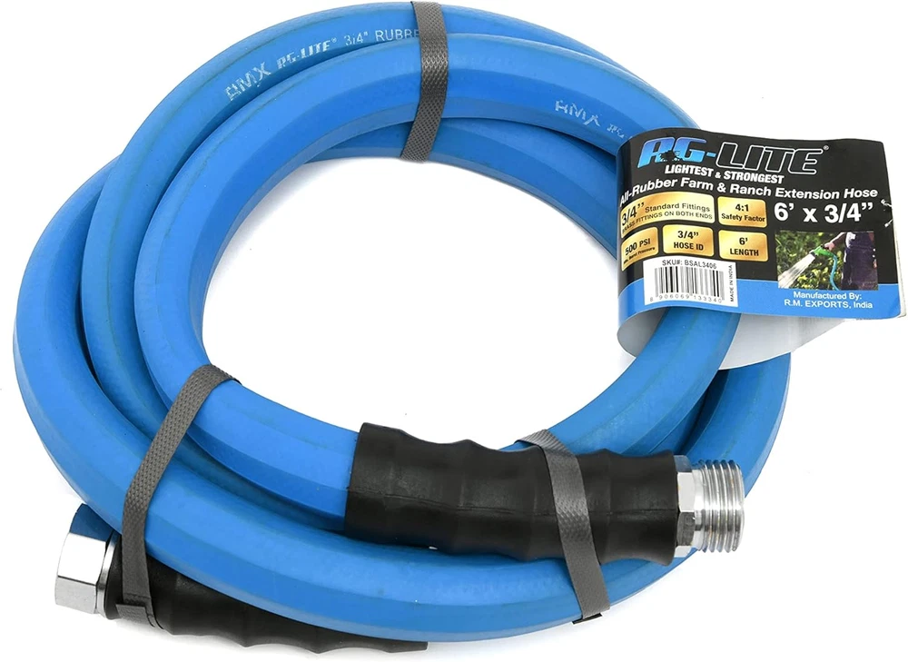 Store New Arrivals Add to Favorite View Feedback Contact AG-LITE BSAL3406 3/4" X 06' Hot/Cold Water Rubber Garden Hose, 100% Rubber, Ultra-Light, Super Strong, 500 PSI, 50F to 190F Degrees, High Strength Polyester Braided Description Item model number BLBBSAL3406 Warranty Description Call Vendor Power Source Hand Powered Country of Origin India Hose Length 6 Feet Batteries Included? No Batteries Required? No Material Rubber Item Length 72 Inches Outside Diameter 0.75 Inches Is Discontinued By Manufacturer No Item Package Quantity 1 Maximum Pressure 500 Pound per Square Inch Item Weight 1.54 Pounds Part Number BSAL3406 Color Blue Global Trade Identification Number 08906069133340 Included Components Garden Hose Product Dimensions 72"L x 0.75"W Size 3/4" x 6' LIGHTEST, STRONGEST: 30% lighter and still rubber, AG-Lite is a professional grade next-generation rubber hose with a 10-Year warranty. The lightest and strongest rubber garden hose on the market. HIGH STRENGTH AND PRESSURE: 500 PSI max pressure. Can run both hot and cold water. Hot water up to 200F. Ideal for both home, farm and ranch use. COLD WEATHER FLEXIBILITY: The best cold-weather flexibility in its category, down until -50F. No chance of cracks with an ozone resistant cover that provides protection from extreme weather and UV. Resistant to abrasion and kinks. FITTING: AG-Lite's revolutionary end fitting design fits all 3/4" GHT conventional style outlets and water equipment. EASE OF USE: Each hose comes with a 4 Finger-grip bend restrictor to avoid damage at ends. Product Description ABOUT US We offer the best prices around on high quality products. Our E-store includes media such as books, movies, music and games while offering electronics, toys, sporting apparel, clothing, tools, general home, garden items and more. SHIPPING We are always working hard to ensure your package arrives as soon as possible. Please understand that some factors like weather, high postal traffic, and the performance of shipping companies are outside of our control. We offer free shipping to the lower 48 states and ship within 2 business days of payment, usually sooner. We do not accept P.O. Boxes. Please provide a physical address. For shipping outside of the continental USA, we only use eBay's Global Shipping Program.The item is shipped to KY and then sent to the rest of the world. International customers are responsible for all duties and taxes. Continue to check out in order to calculate costs for shipping the item to your country. Messages regarding eBay's Global Shipping Program MUST be directed at eBay EXCLUSIVELY. RETURNS We offer a 30-Day Return Policy on items which you are not completely satisfied with. You have the option for a full-refund or an exchange of the item. No returns are available on items shipped outside of the USA. PAYMENT We accept PayPal. CONTACT US This page content is yet to come Please ad us to your favorite seller and visit again later Thank You CUSTOMER SATISFACTION We try our very best to make sure every customer is completely satisfied. If there's a problem, message us! We're happy to help. WE ACCEPT Copyright © 2021 AutoDS. | All Rights Reserved