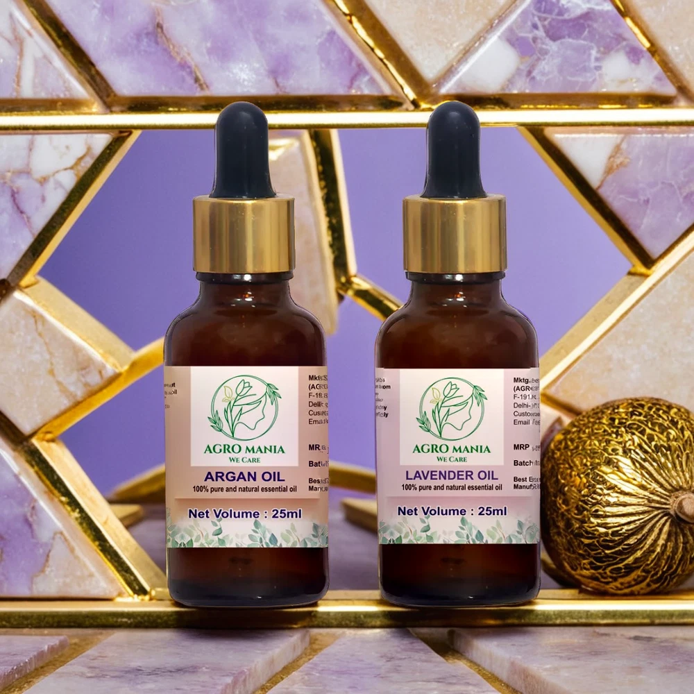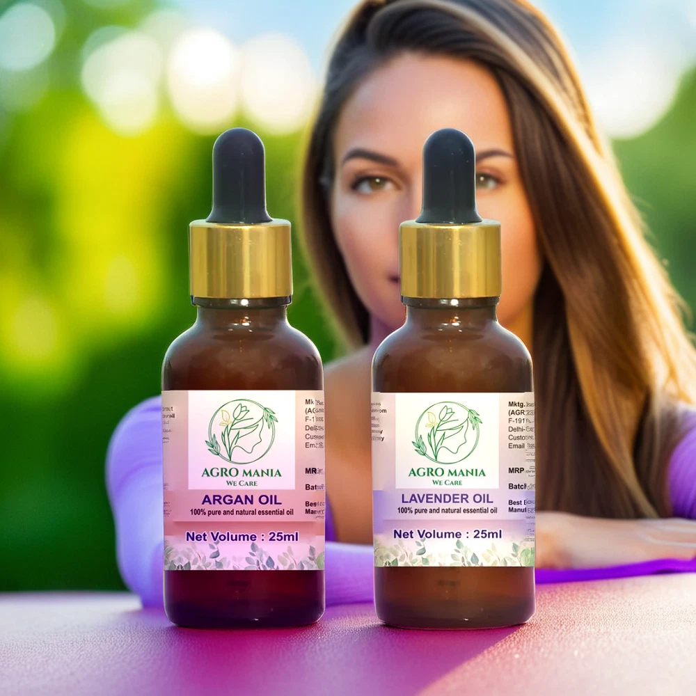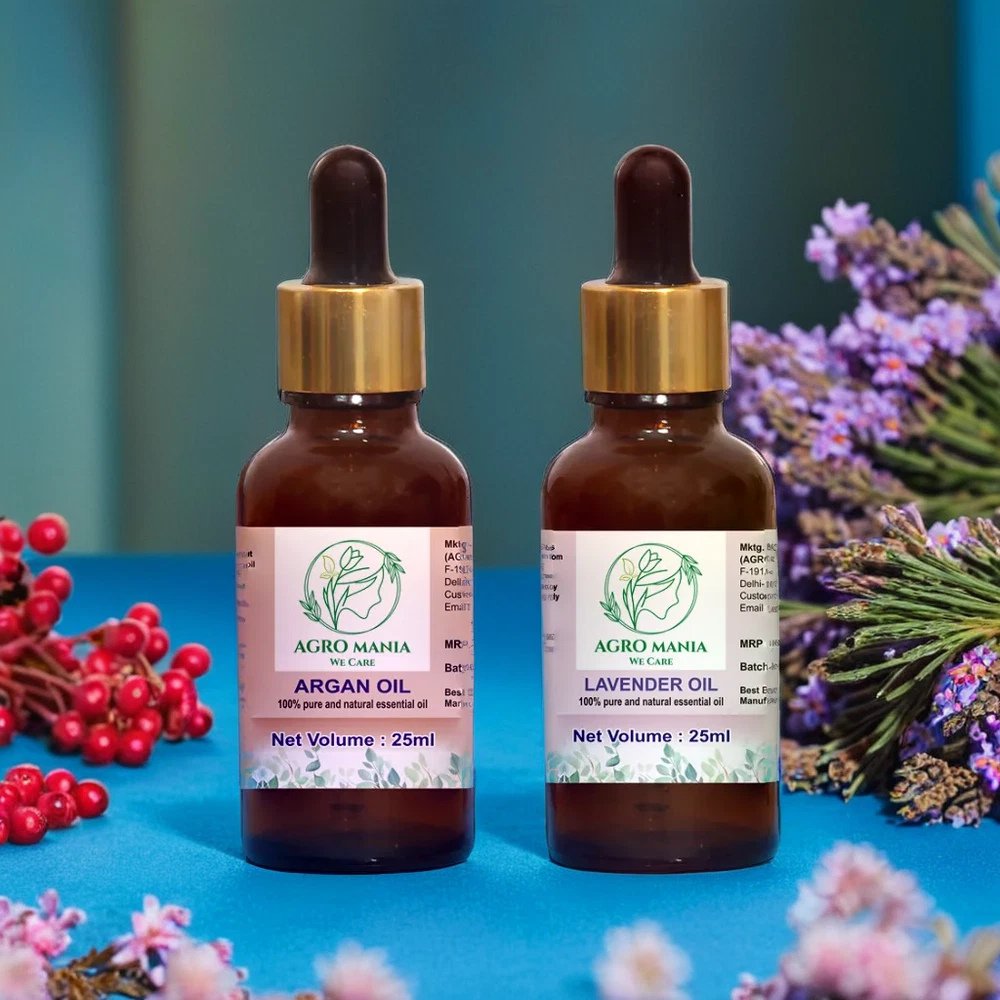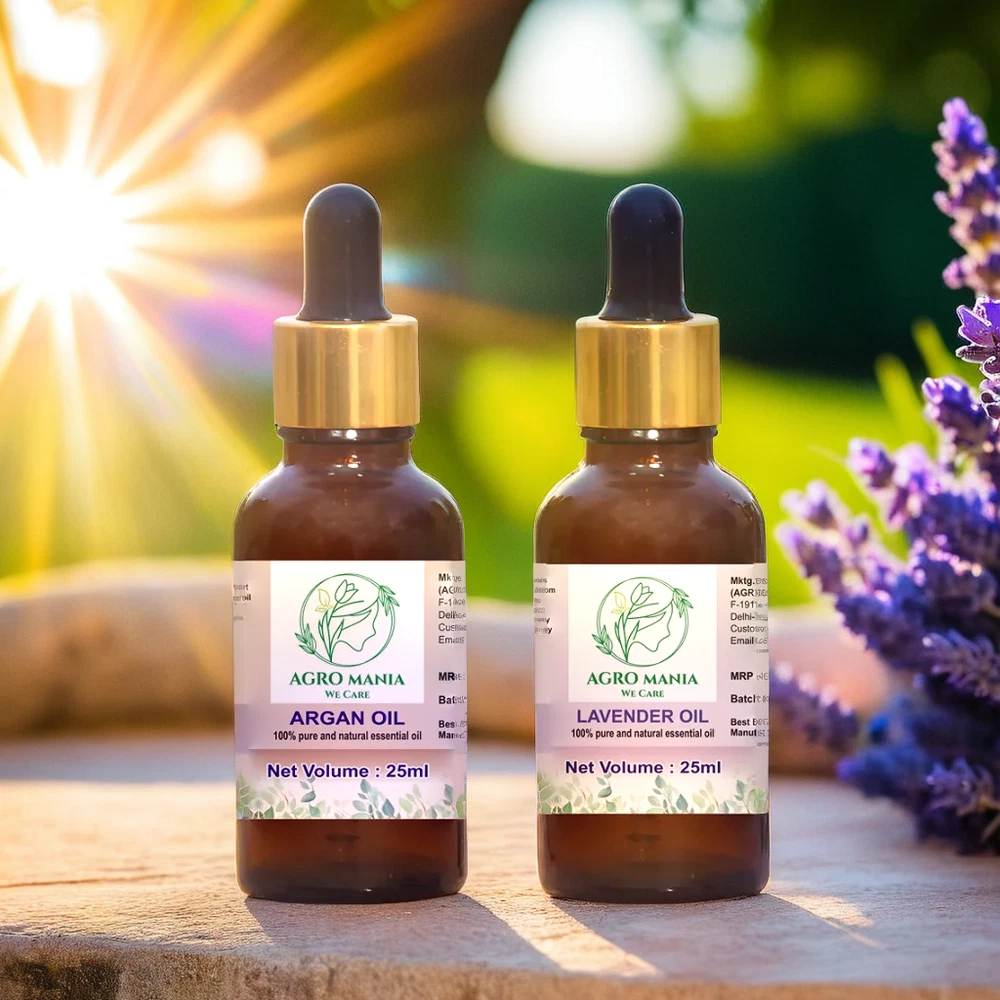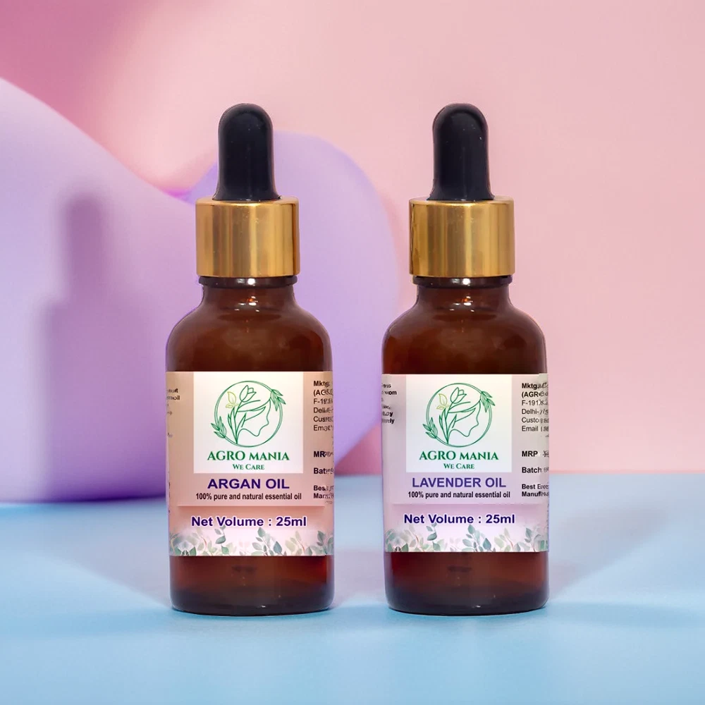 About this item AGRO MANIA 100% Pure & Natural Argan Carrier Oil & Lavender Essential OIl It is a unisex oil, for men and women All Body Moisturizer : Argan Oil Has Excellent Moisturizing Properties And Can Help People With Dry Skin. Ideal for Acne, Scalp Nourishment, Skin Moisturizing, Hair Growth & Aromatherapy. RELAXING SLEEP & HEADACHE RELIEF Add 2 drops of lavender oil on your pillow for a restful sleep. For headache relief, dilute a few drops with a Argan carrier oil. For external use only.