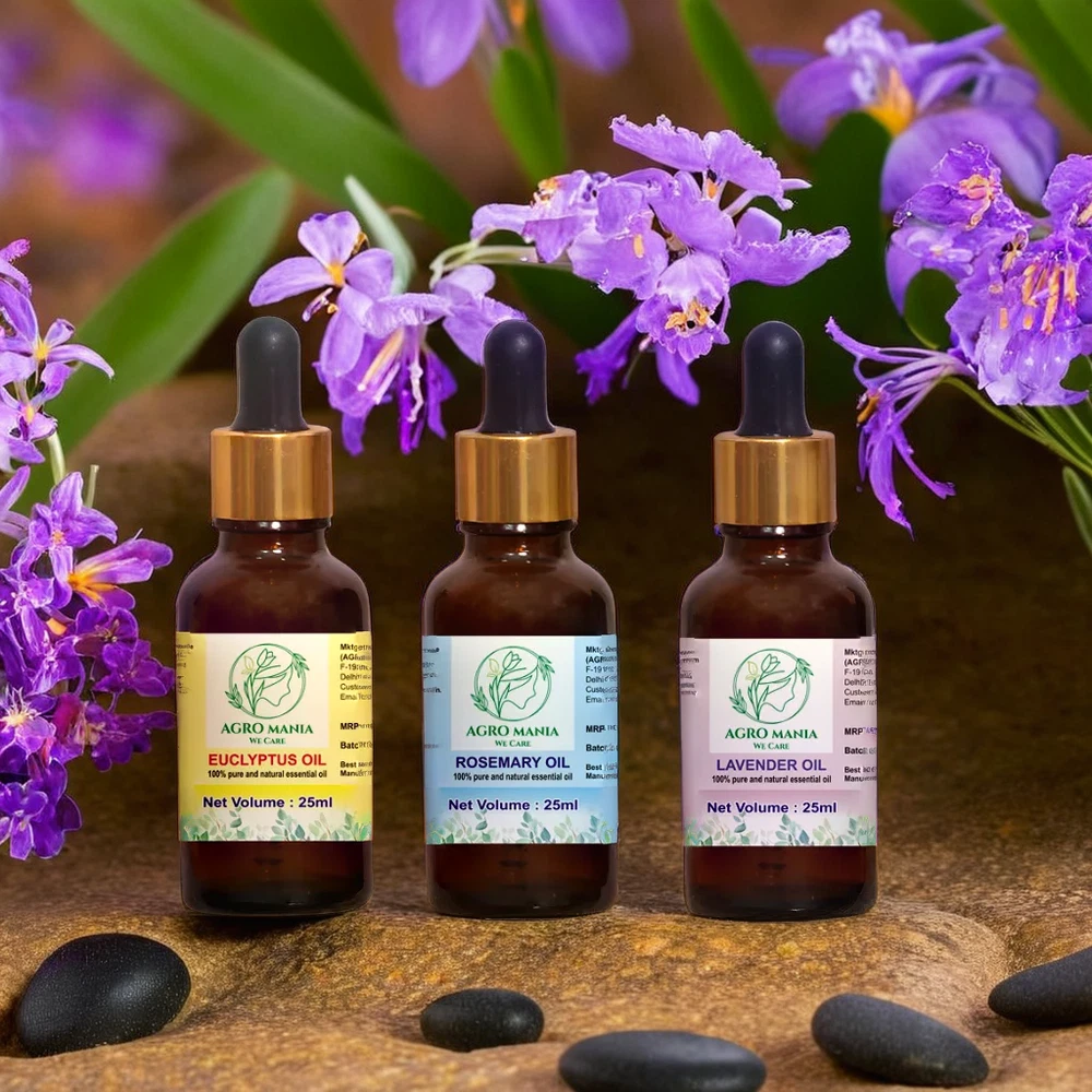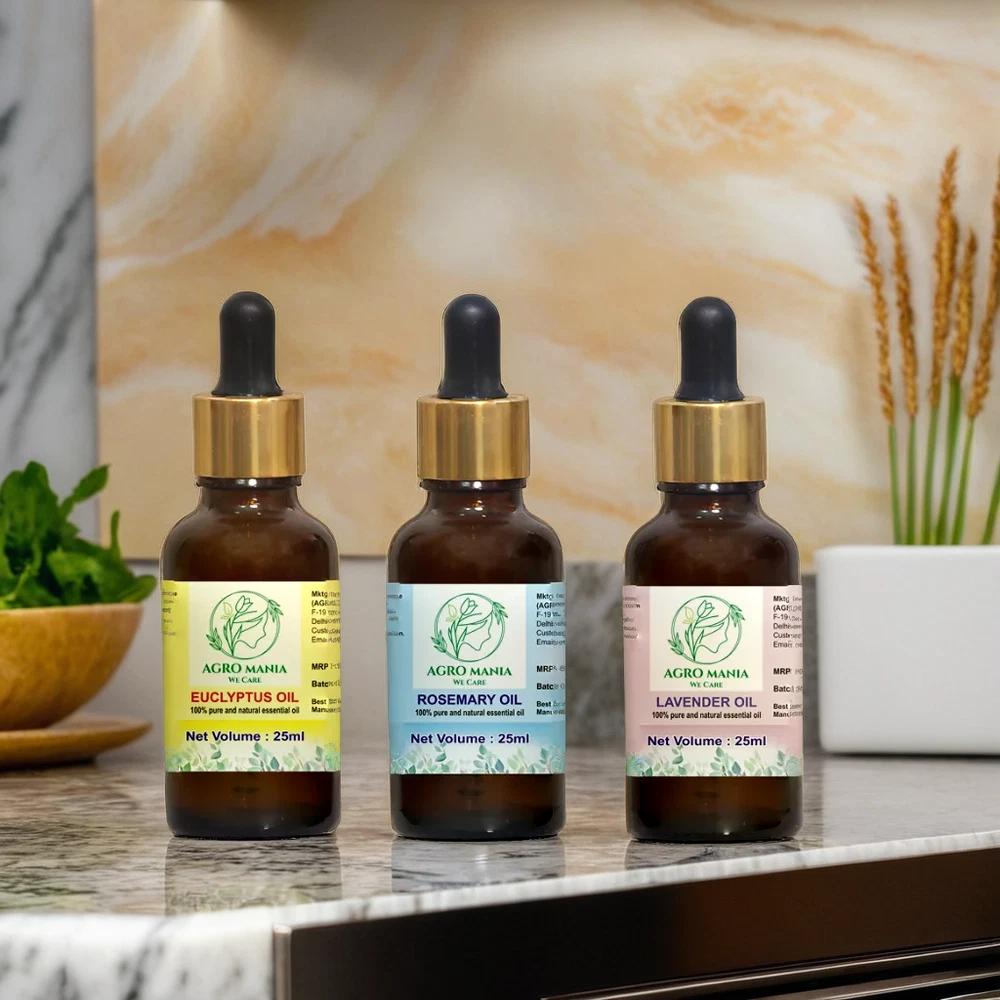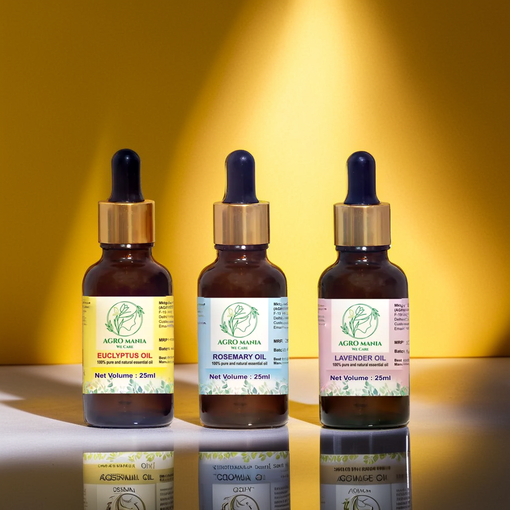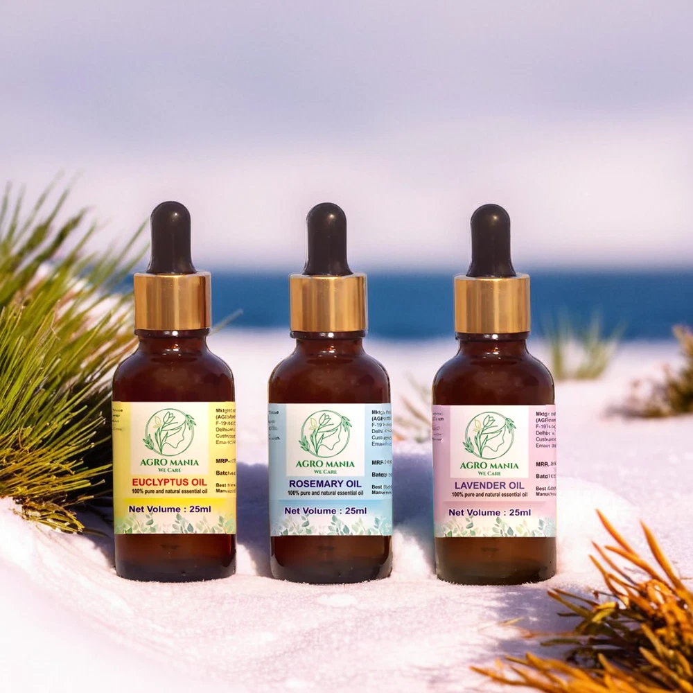 USE FOR HAIR CARE: Eucalyptus, lavender and rosemary essential oil can be useful for many hair and scalp related concerns as well. For getting the hair care benefits of eucalyptus, lavender and rosemary oil, the essential oils can be used in diluted form with carrier oils like coconut oil at the ratio of 1:12 drops or a few drops of the oil can be mixed with shampoos. NATURAL ESSENTIAL OILS: Eucalyptus, lavender & Rosemary essential oils are undiluted and can be diluted with various carrier oil like olive oil, coconut oil etc and used for various purposes . FOR GLOWING SKIN: The rosemary essential oil as well as the eucalyptus and lavender essential oils can be diluted with carrier oils like jojoba or argan oil at the ratio of 1:12 drops. This concoction can be used as a facial massage oil for glowing and smooth skin. AROMA THERAPY: The eucalyptus, lavender and rosemary essential oils are pure and undiluted form which is perfect for using in aroma therapy. A few drops of the eucalyptus, lavender and rosemary essential oils can be added to any aroma diffuser machine to provide a fresh scent to the home environment and provide a calming and soothing effect to the senses.