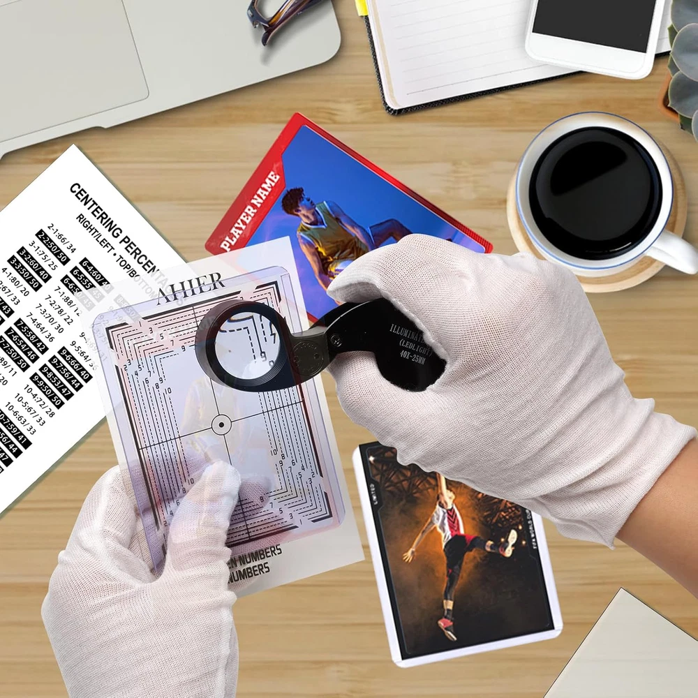 ???What Will Receive???You will receive a 139P card grading kit including a card centering tool with instructions, a 40x magnification tool, 25 PVC card holders, 100 clear card sleeves, 10 blue cleaning cloths, and a pair of dust-proof gloves. ???40x Magnification Tool???Made of a highly transparent glass lens and metal case, can provide clear illumination, 40x good magnification effect, a 360-degree rotating storage design, with a compact and portable storage box, and also suitable for collectors of antiques, coins, rocks, etc. ???Card Centering Tool???The card grading centering tool is easy to operate. Just place the test card in the card centering tool and refer to the centering tool percentage instructions to check the centering condition from left to right and top to bottom. ???Card Protection Holder???The 25P card holder is made of ultra-transparent PVC material, sturdy and durable, and can protect your beloved cards from scratches, dust stains, and ultraviolet. ???Wide Application???Use our card centering grading tool to help you get perfect grading, suitable for card collectors to collect various types of cards, including football, basketball sports cards, game cards trading cards, etc.