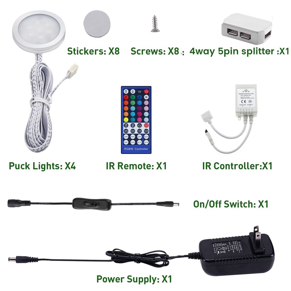 AIBOO RGBW RGB + White Color Changing Christmas Xmas Under Cabinet LED Lights Kit IR Remote Puck Lights for Kitchen Counter Shelf Furniture Ambiance Lighting (RGBW, 4 Lights, 12W) Product Details Color: RGBW Brand: AIBOO MPN: YK-300000007 UPC: 712411878320 EAN: 0712411878320 Brand: AIBOO Color: RGBW Material: Metal Style: Modern Light fixture form: Puck Is Discontinued By Manufacturer : No Product Dimensions : 7.87 x 5.91 x 2.76 inches; 1.08 Pounds Item model number : YK-300000007 Batteries : 1 CR2032 batteries required. Date First Available : September 8, 2016 Manufacturer : AIBOO Country of Origin : China Customer Reviews: 4.2 4.2 out of 5 stars 567 ratings Brand: AIBOO Color: RGBW Material: Metal Style: Modern Light fixture form: Puck Room Type: Kitchen, Bedroom, Home Office Product Dimensions: 2.3"L x 2.3"W x 0.3"H Specific Uses For Product: General purpose Indoor/Outdoor Usage: Indoor Power Source: Corded Electric Installation Type: Surface Mount Special Feature: Dimmable Control Method: Remote Light Source Type: LED Finish Type: Polished Shade Material: Plastic Number of Light Sources: 4 Voltage: 12 Volts Theme: Christmas Light Color: RGBW Shape: Round Lighting Method: Up/Down Light Item Weight: 1.08 Pounds Wattage: 12 watts Controller Type: Remote Control Unit Count: 1 Count Brightness: 800 Lumen Mounting Type: Adhesive,Under Cabinet Fixture Type: Non Removable Assembly Required: No Manufacturer: AIBOO UPC: 712411878320 Recommended Uses For Product: Mood Lighting Part Number: under-cabinet-rgbw-4 Item Weight: 1.08 pounds Country of Origin: China Item model number: YK-300000007 Batteries: 1 CR2032 batteries required. Is Discontinued By Manufacturer: No Finish types: Polished Maximum Compatible Wattage: 3 Watts Special Features: Dimmable Plug Format: A- US style Batteries Included?: No Batteries Required?: No Date First Available: September 8, 2016 RGBW is a combination of RGB and pure white light color, which can provide natural and comfortable white light rather than blue white light. The rgbw puck light kit comes with a 40-key IR remote control, providing a variety of lighting effects and dimmable modes to fulfill different requirements. Power adapter is 100/120Vac to 12Vdc, very safe to touch by hands. Up to 85% energy saving comparing to traditional lighting. Suggested applications: dinning room, kitchen, bedroom, furniture, counter, closet, drinks cabinet, party lighting.