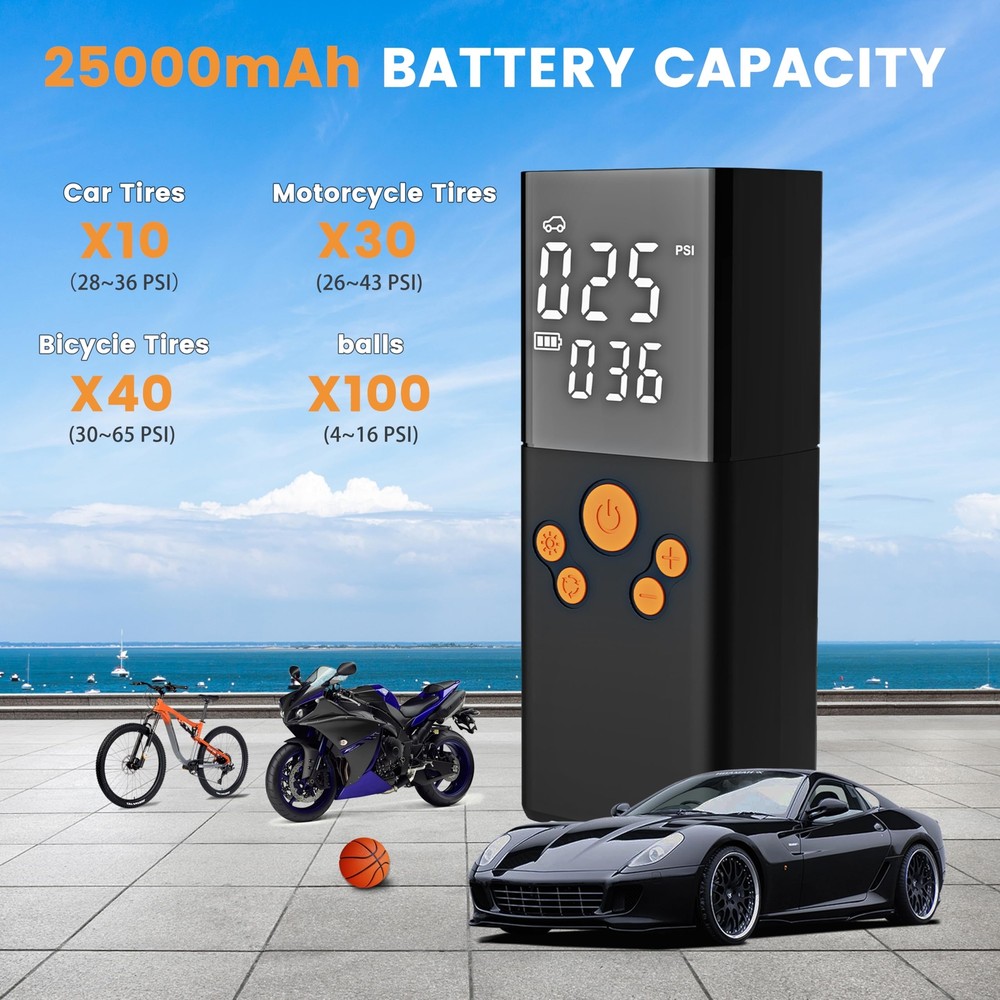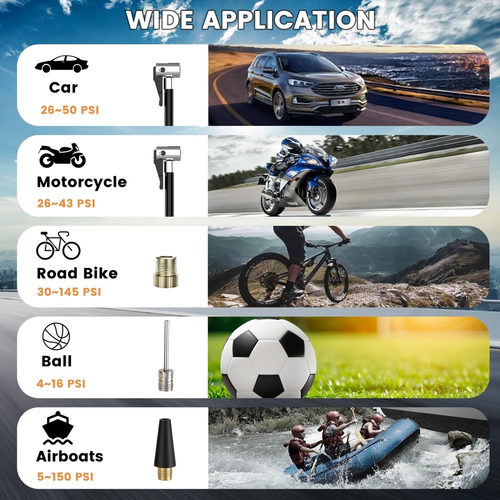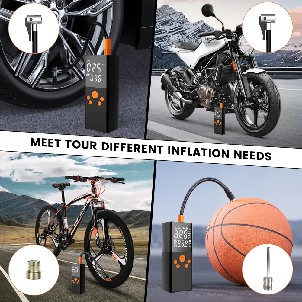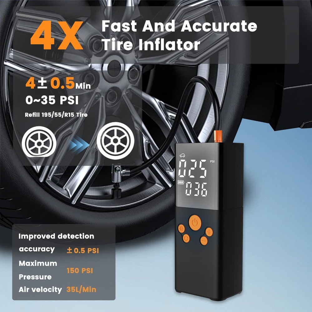 ALACOO Car Tire Air Pump Portable, Cordless Electric Air Compressor Cars Bike Pump Portable Car Tires Inflator with Digital Pressure Gauge, Power Bank and Flashlight,150PSI Auto inflador Accessories 4X Fast Air Pump for Car Tires:The car tire air pump has powerful functions and is very practical! The inflation speed of 36L/Min ensures efficient and fast filling of car tires, and inflating 195/65/R15 car tires from 0psi to 35psi can be completed in less than 5 minutes. And it has a precision guarantee of ± 1%, making the inflation process more accurate and reliable. In addition, it also has the function of preset and monitoring tire pressure, and can automatically turn off when the set pressure is reached, so you don't have to worry about over-inflation. Air Compressor:Portable Air Compressor, in addition to its inflation capability, it integrates emergency lighting and portable power functions. It offers three lighting modes: spotlight, strobe, and SOS signal. Equipped with 2000mAhx3 capacity, the air pressure pump for car tire lasts for 3 hours of continuous use and can be fully charged in just 5-6 hours, and the tire air compressor can be used in two ways, either wirelessly or using the car cord to inflate when the battery runs out.This air compressor has a small volume, light weight, does not occupy space and easy to carry, suitable for outdoor and travel use. Air Pump For Car Tires: This portable tire inflator air compressor comes pre-set with four pressure units: PSI, KPA, BAR, KG/CM ², which can meet the needs of different types of vehicles or inflatable objects, including bicycles, motorcycles, cars, balls, and custom settings. Through these modes, users can easily choose suitable settings to ensure more accurate and efficient inflation effects. Tire inflator portable air compresso:This tire inflator adopts upgraded noise reduction technology, with a noise reduction structure frequency as low as 40 decibels. The built-in control chip improves the heat dissipation speed, ensuring that the product will not overheat during inflation, thereby ensuring safety and stability. The extensive distribution of cooling holes also increases the heat dissipation area, further enhancing the product's heat dissipation effect and extending its service life. Tire inflator: In addition to being a portable tire pump for cars, it is also a multifunctional emergency tool. It has an LED light at the top that can be used to inflate in the dark, change tires, or warn other vehicles at night. There is also a 5V/2A USB output/input port at the bottom, which can be used as an emergency power supply for electronic devices This portable air compressor for car tires is conveniently stored in a glove box or garage and can be used whenever needed. This set includes 1 car tire inflator, 1 air hose, 1 atmospheric nozzle, 1 small air nozzle, 1 French adapter, 1 ball needle, and 1 USB charging cable. If you have any questions or doubts. 4X Fast Air Pump for Car Tires:The car tire air pump has powerful functions and is very practical! The inflation speed of 36L/Min ensures efficient and fast filling of car tires, and inflating 195/65/R15 car tires from 0psi to 35psi can be completed in less than 5 minutes. And it has a precision guarantee of ± 1%, making the inflation process more accurate and reliable. In addition, it also has the function of preset and monitoring tire pressure, and can automatically turn off when the set pressure is reached, so you don't have to worry about over-inflation. Air Compressor:Portable Air Compressor, in addition to its inflation capability, it integrates emergency lighting and portable power functions. It offers three lighting modes: spotlight, strobe, and SOS signal. Equipped with 2000mAhx3 capacity, the air pressure pump for car tire lasts for 3 hours of continuous use and can be fully charged in just 5-6 hours, and the tire air compressor can be used in two ways, either wirelessly or using the car cord to inflate when the battery runs out.This air compressor has a small volume, light weight, does not occupy space and easy to carry, suitable for outdoor and travel use. Air Pump For Car Tires: This portable tire inflator air compressor comes pre-set with four pressure units: PSI, KPA, BAR, KG/CM ², which can meet the needs of different types of vehicles or inflatable objects, including bicycles, motorcycles, cars, balls, and custom settings. Through these modes, users can easily choose suitable settings to ensure more accurate and efficient inflation effects. Tire inflator portable air compresso:This tire inflator adopts upgraded noise reduction technology, with a noise reduction structure frequency as low as 40 decibels. The built-in control chip improves the heat dissipation speed, ensuring that the product will not overheat during inflation, thereby ensuring safety and stability. The extensive distribution of cooling holes also increases the heat dissipation area, further enhancing the product's heat dissipation effect and extending its service life. Tire inflator: In addition to being a portable tire pump for cars, it is also a multifunctional emergency tool. It has an LED light at the top that can be used to inflate in the dark, change tires, or warn other vehicles at night. There is also a 5V/2A USB output/input port at the bottom, which can be used as an emergency power supply for electronic devices This portable air compressor for car tires is conveniently stored in a glove box or garage and can be used whenever needed. This set includes 1 car tire inflator, 1 air hose, 1 atmospheric nozzle, 1 small air nozzle, 1 French adapter, 1 ball needle, and 1 USB charging cable. If you have any questions or doubts. Shipping from the USA All of our products are shipped from the USA, ensuring quick delivery to your destination. Payment We offer the following payment methods: PayPal, credit card, bank transfer, and eBay's secure payment system. Free Shipping & Free Returns Shipping within