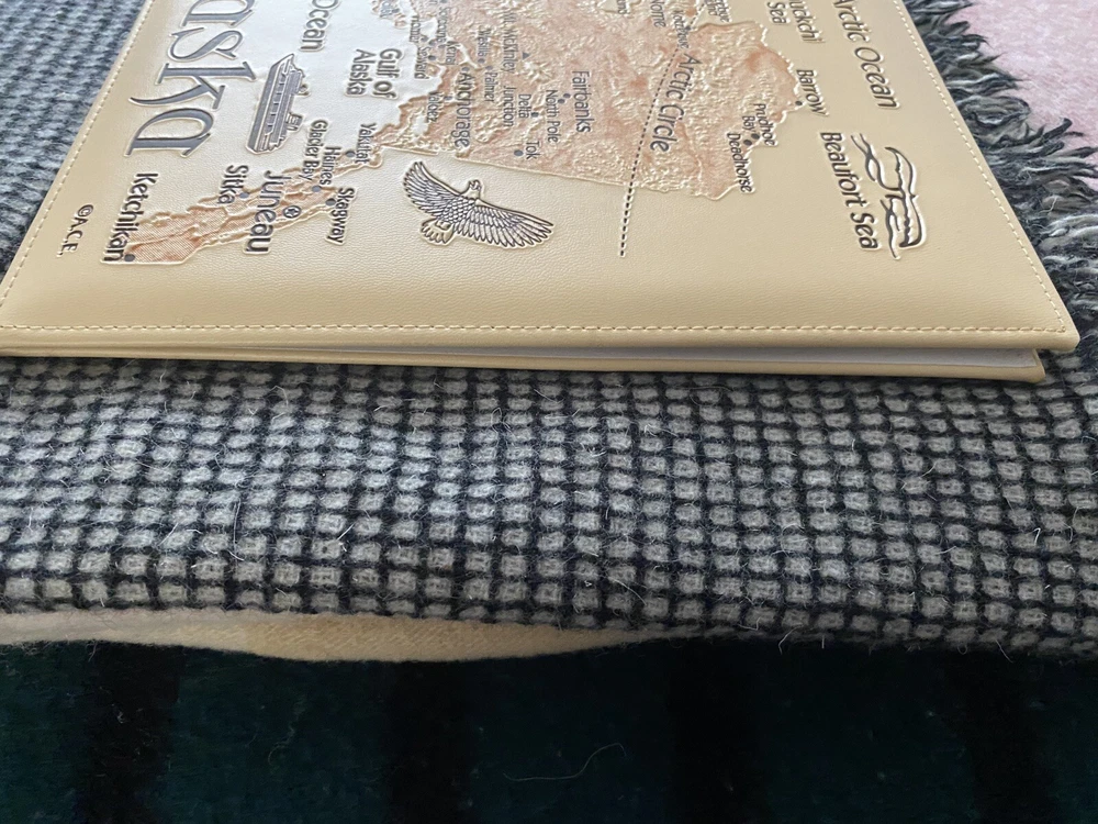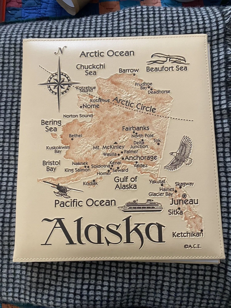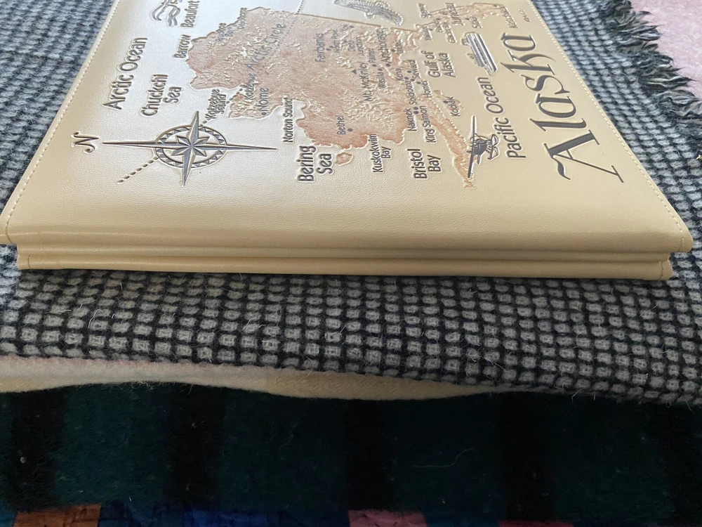 This is a photo album in beige with an Alaska map theme. It is an easy load, acid-free slip-in album designed for 8.5" x 11’’ photos. It is ideal for storing and displaying travel-themed photographs. Photo album Measures 10’’ x 11 1/2’’. Map is on front and back cover. Gently used. Comes from a smoke free home. Thank you for looking.