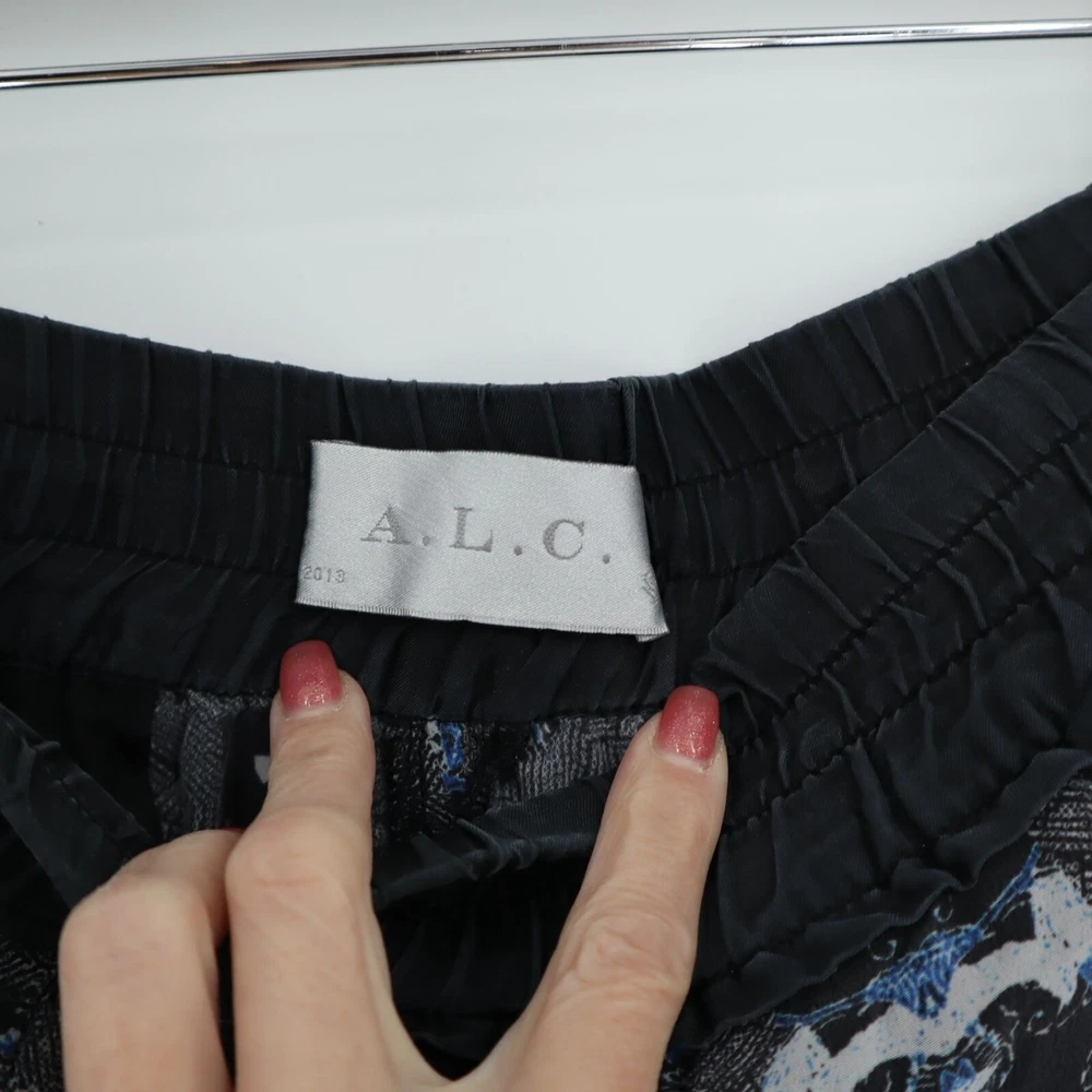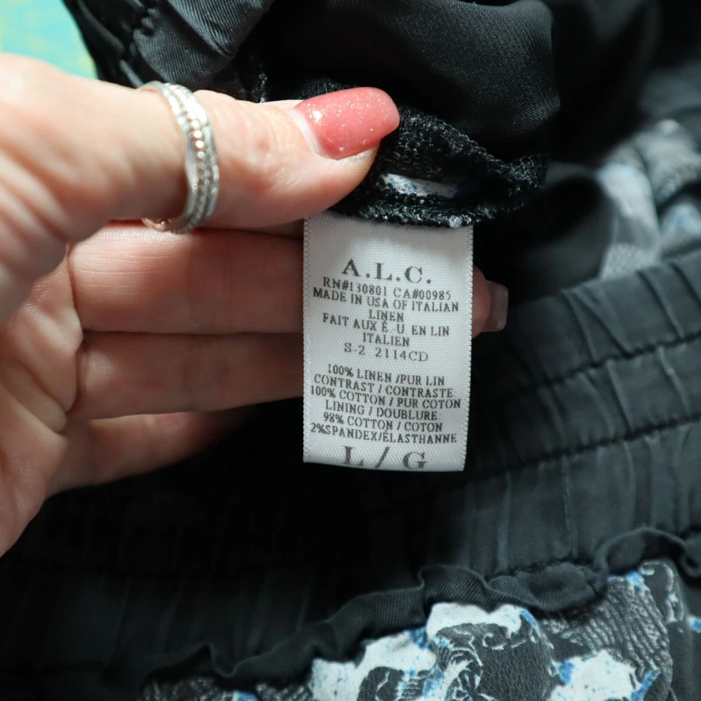 A.L.C. Kaleidoscope Jogger Pants Womens Size L 100% Linen Casual Comfort Weekend These pants are so comfy, you'll want to wear them to bed. But don't! They're too stylish for that. Unless it's a pajama party. • Elastic Waist • Abstract Pattern • 100% Linen • Made In USA • Size L *Marked as linen but feels like rayon. Features: • casual Size: Womens L Condition: Pre-Owned Good Missing the drawstring but the waist is elastic, so you don't need it.