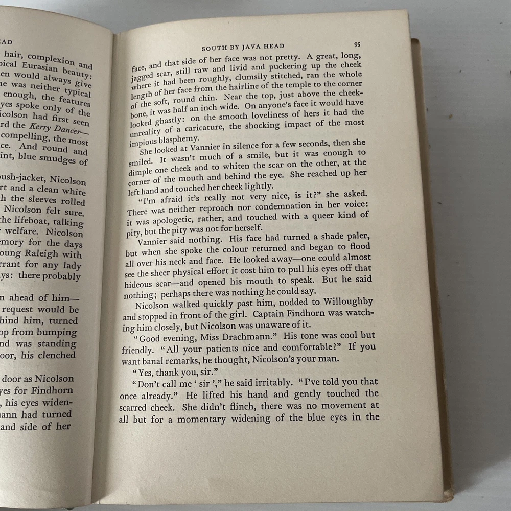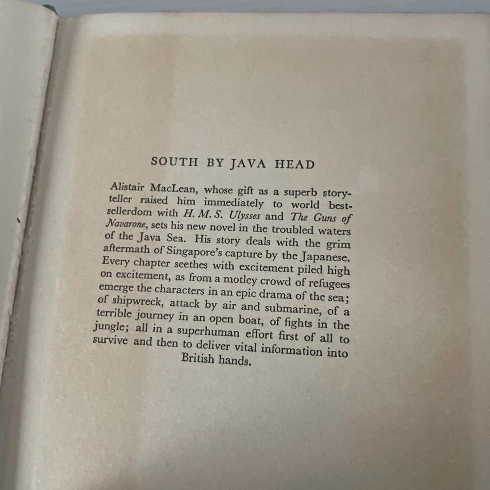 ALISTAIR MacLEAN South By Java Head - 1st ed 1958 Gripping World War II adventure novel published in 1958. The story is set in February 1942, during the fall of Singapore to the Japanese Army. A diverse group of survivors, including soldiers, nurses, and civilians, attempt to escape the city aboard a battered freighter called the Kerry Dancer. They face numerous challenges, including Japanese attacks, treacherous weather, and internal conflicts. Condition: GOOD - Photo's of Actual Product - See photos to confirm condition A book that has been read, but is in good condition. Minimal damage to the book cover eg. scuff marks, but no holes or tears. If this is a hard cover, the dust jacket may be missing. Binding has minimal wear. The majority of pages are undamaged with some creasing or tearing, and pencil underlining of text, but this is minimal. No highlighting of text, no writing in the margins, and no missing pages. ------------------- Please See my eBay shop for more Modern & Vintage Books Add as a favourite seller, new stock added daily Thanks for looking