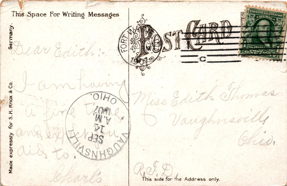 MAKE AN OFFER. THE MORE YOU BUY THE BETTER DEAL I WILL ACCEPT The postcard is from Charlotte, featuring a picture of the Allen County Courthouse in Fort Wayne, Indiana. The sender mentions they are having a good time and addresses the recipient as Miss Edith Thomas in Vaughnsville, Ohio. The postcard was made for S. H. Knox & Co.