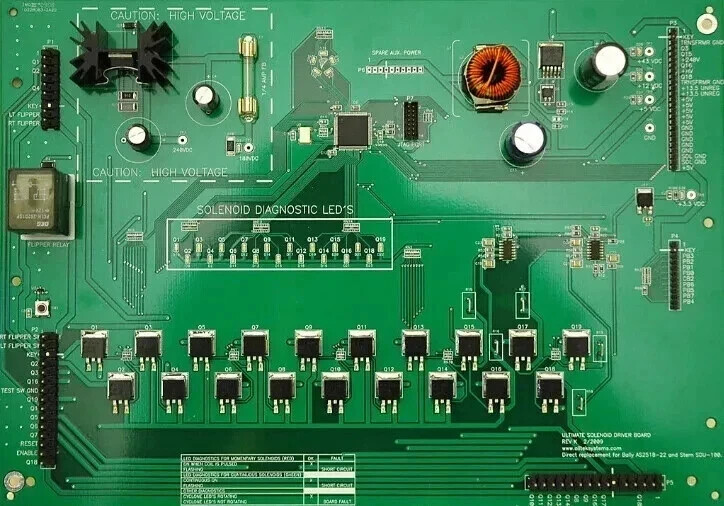 From the makers of the world famous ULTIMATE MPU Board for pre 1984 Bally & Stern electronic pinball machines, comes the ULTIMATE SOLENOID DRIVER Board. The new ULTSDB Replaces old Bally AS-2518-16, AS-2518-22, AS-2518-25 and Stern SDU-100/B-432 solenoid driver boards with a new high tech, high power, "bullet-proof" design that is so reliable it comes with a lifetime warranty. Features include: High Voltage 180 Volt DC @ 50 watts like the original design for games with extra displays. Short circuit protection on the low voltage power supplies. +5vdc @ 5amp low voltage power supply. Extra power for popular LED style displays. LED status indicators on all voltages. Using the latest MOSFET devices for solenoid drivers. Lower 'on' resistance MOSFET drivers means more responsive coils – better, faster solenoid action. All Solenoid MOSFET drivers have dual function LED indicators that indicate proper operation as well as indicating a fault condition such as a shorted coil. Makes game repairs fast and easy. MPU fault protection circuit. Protects solenoid drivers and coils from shorts. Caused by a faulted MPU which locks on a solenoid. Pulsing 'Heartbeat' status LED's. No obsolete components used. Lifetime warranty comes with the best support in the business-- email, web, and phone. Reference: ULTSDB Replaces Bally AS-2518-16 Replaces Bally AS-2518-22 Replaces Bally AS-2518-25 Replaces Stern B-432 Replaces Stern SDU-100 Other Games: Black Sheep Squadron Sexy Girl