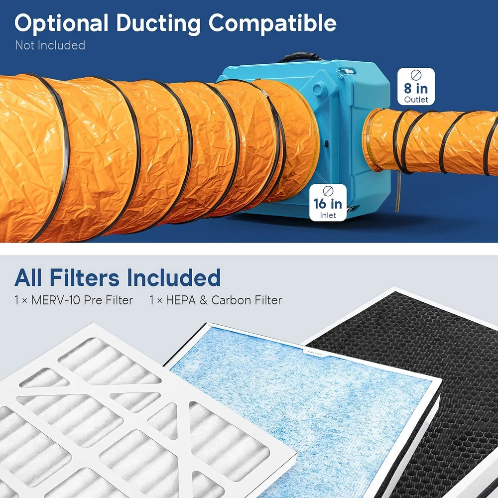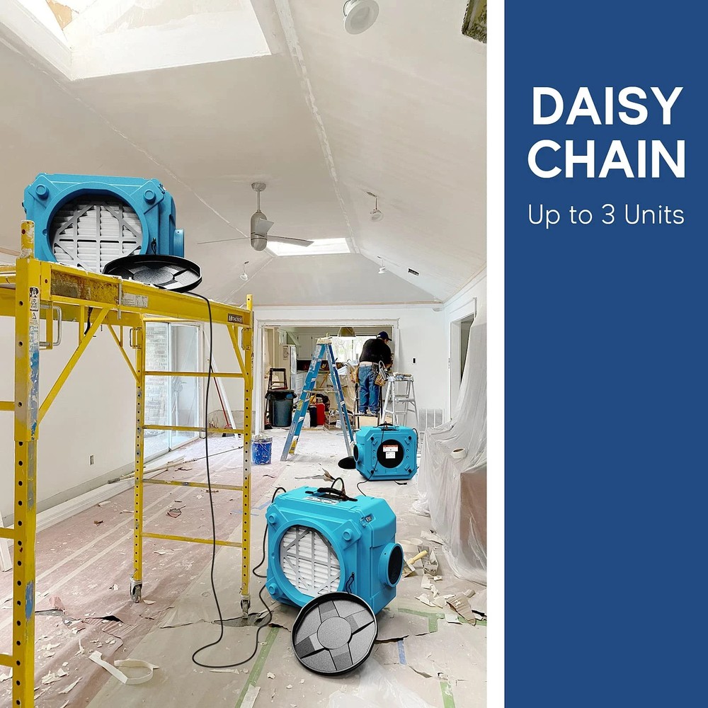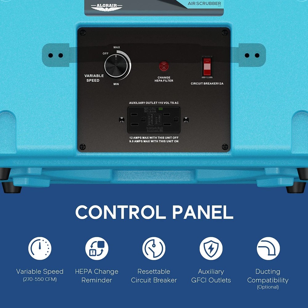 Description The ALORAIR 550 CFM Air Scrubber is the ultimate air filtration solution for homes, construction sites, and remediation projects. Featuring a 3-stage filtration system —including a MERV-10 filter, Activated Carbon filter for odor removal, and a HEPA filter to capture 99.5% of particles larger than 0.3 microns —this machine provides superior air cleaning for environments plagued by dust, mold, smoke, and allergens. With its heavy-duty rotomolded polyethylene shell , this air scrubber is built to withstand tough conditions, whether you're in a home repair, sewage cleanup, water damage restoration, or industrial setting. The air scrubber features adjustable airflow (270–550 CFM) and stackability , allowing you to daisy-chain up to three units to purify a larger area, making it ideal for large spaces or multiple room coverage. For ease of use, the filter replacement indicator light alerts you when it's time to change filters, and the control panel lets you easily adjust settings. The unit is also designed for portability , with a convenient handle for easy transportation. Plus, it can be ducted (optional accessories) to meet different ventilation needs. Perfect for areas up to 800 sq.ft. , this air scrubber will keep your environment free of harmful contaminants while improving air quality during and after renovations, repairs, and restorations. Specifications Airflow : 270–550 CFM (max) Coverage Area : Up to 800 sq.ft. Filtration : MERV-10 Filter (Large particles) Activated Carbon Filter (Smoke, pet odor) HEPA Filter (99.5% of particles larger than 0.3 microns) Sound Level : 65 dB Weight : 39.6 lbs Dimensions : 24.8” D x 21.6” W x 14.5” H Stacking Capability : Stack up to 3 units (1,650 CFM total) Duct Compatibility : 16" air inlet, 8" air outlet (ducts not included) Voltage : 115V Power : 2.5A Warranty : 10 years (with ETL certification) Key Features 3-Stage Filtration System : Includes MERV-10, Activated Carbon, and HEPA filters for comprehensive filtration, capturing large particles, smoke, pet odors, and 99.5% of particles larger than 0.3 microns. Heavy-Duty Construction : Durable rotomolded polyethylene shell designed for rugged environments. Built for home repairs, construction sites, sewage remediation, water & fire damage restoration, and more. High Airflow : Max airflow of 550 CFM covers 800 sq.ft. , making it perfect for areas with high contaminant levels and requiring efficient air purification. Stackable & Daisy Chain : Stack up to 3 units to achieve a combined airflow of 1,650 CFM . Daisy-chain multiple machines for large-scale air purification needs. Portable Design : Compact size ( 24.8” D x 21.6” W x 14.5” H ), lightweight (39.6 lbs), and built-in handle for easy transport. Duct compatibility (optional 16” air inlet, 8” air outlet) for flexible setup. Filter Replacement Indicator : Easy-to-use control panel with indicator light to notify when filters need replacing, ensuring optimal performance. Quiet Operation : Operating sound level of 65 dB , ideal for use in various environments without disrupting work. 10-Year Warranty : Long-term support with a 5-year warranty and professional customer support team. Why Choose ALORAIR 550 CFM Air Scrubber : Comprehensive Filtration : Removes dust, mold spores, allergens, smoke, and odors with HEPA , activated carbon , and MERV-10 filters. Heavy-Duty & Durable : Built for tough environments with a robust rotomolded polyethylene shell. Portability & Stackability : Easy to transport with a handle and stackable design for customizable airflow coverage. Adjustable Airflow : Perfect for different room sizes and air quality needs with airflow ranging from 270 to 550 CFM . 10-Year Warranty : Enjoy long-term peace of mind with an extensive 5 -year warranty and dedicated customer support. The ALORAIR 550 CFM Air Scrubber is your ultimate choice for effective air purification in renovation, remediation, and industrial environments. Whether you're dealing with water damage, fire restoration, or general air quality improvement, this machine will ensure your air is clean, safe, and breathable. Gift: Buy Now and Get 5pcs Replacement Filters for Free. Previous page Next page Previous page