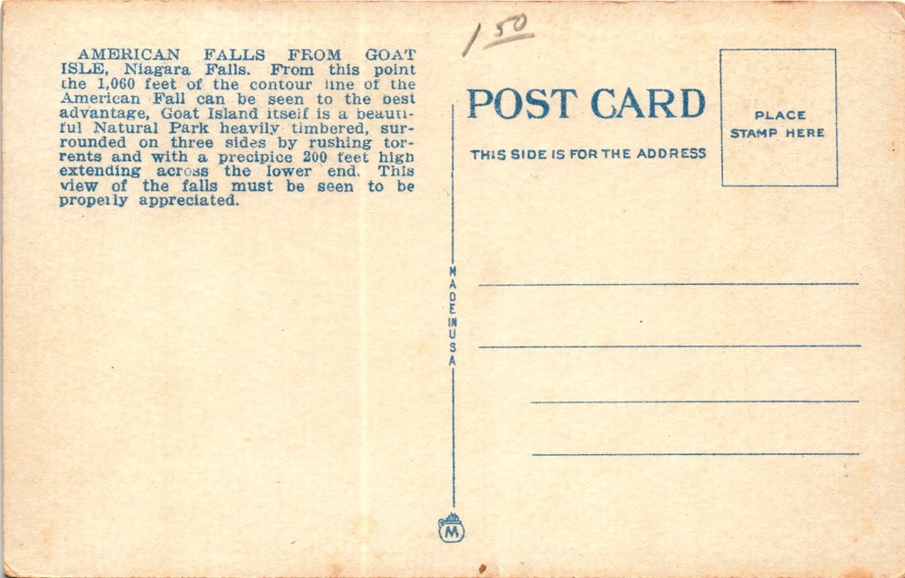 MAKE AN OFFER. THE MORE YOU BUY THE BETTER DEAL I WILL ACCEPT The postcard features a view of the American Falls from Goat Island at Niagara Falls. Goat Island is described as a beautiful natural park with dense vegetation, surrounded by rushing torrents on three sides, and a 200-foot-high precipice at the lower end.