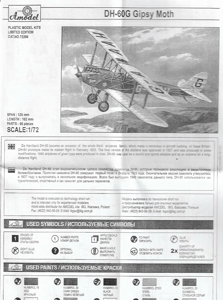 Plastic model kit High-quality details. Scale: 1:72 High-quality details. Manufacturer: AMODEL (Ukraine) Country/Region of Manufacture: Ukraine Composition: Plastic Model Kit Material: Plastic Paint: Unpainted, Unassembled, Kit do not contain paints and glue. Condition: New in Box Features: Kit Aircraft scale model Model length, mm: 102 AMODEL 72286 de Havilland DH.60G Gipsy Moth Scale Aircraft Biplane 1/72 Plastic model kit The kit includes: 56 plastic parts decal (sticker) scheme for coloring the model detailed instructions in English and Russian Glue, paint not included Quality set, simple assembly. Suitable for experienced modelers, as well as for beginners. Due to the use of modern production technologies, all the details of the model fit perfectly, thanks to this, you can get an excellent result with minimal effort. ----------- This is a plastic model kit. Assembly and painting is required. Paint and glue is NOT included. Item Type: Scale model kit Commodity Attribute: Assembly The model is a plastic assembly model and needs to be assembled and painted by yourself You need an extra purchase of the glue, paint and so on!