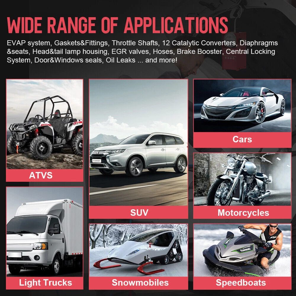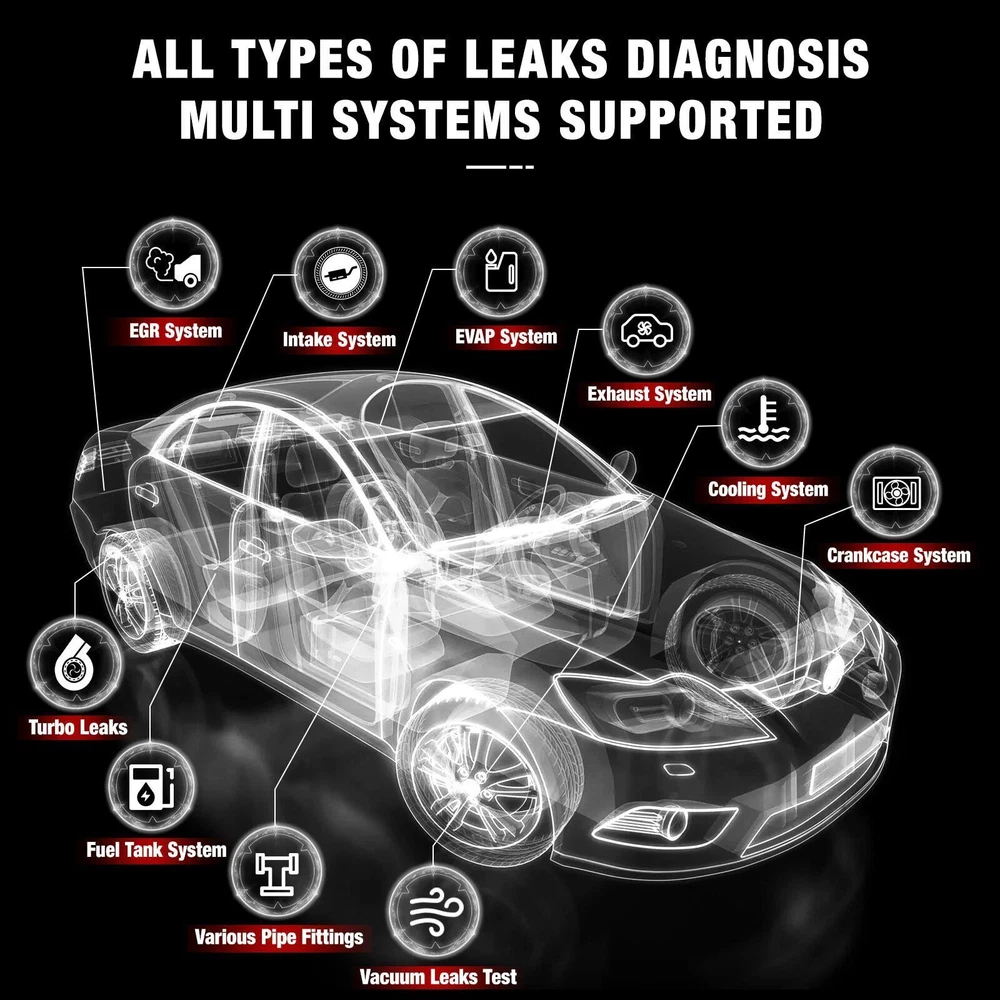 ANCEL S3000 Auto EVAP Smoke Machine Vacuum Leakage Detector Fuel Pipe Diagnostic ANCEL S3000 Car Motorcycle Smoke Leak Detector Gas Pipe Leakage Analyzer Oil Pipe Generator EVAP Vacuum Leakage Diagnostic Tool ANCEL S3000 Smoke Leak Detector is a universal and professional automobile pipe leakage smoke tester. It will help us position cars motorcycles leakage on pipe system quickly and exactly ,such as : Crankcase System Test; Intake System Test; Car Sealing Test; Fuel Tank System Test; Turbo System Test; EVAP System Test; Exhaust System Test; Various Pipe Fittings Test,It allows you to determine the leak points more quickly within a few minutes. By observing the pressure indicator, the leakage is clear at a glance. Why choose ANCEL S3000? 1.【Support Various System Test】Crankcase System Test; Intake System Test; Car Sealing Test; Fuel Tank System Test; Turbo System Test; EVAP System Test; Exhaust System Test; Various Pipe Fittings Test. (Note: Not applicable to air conditioning system piping) It can quick to find evap leaks 2.【Wide Compatibility】Used to detect leakage of pipe systems on automobiles, motorcycles, snowmobiles, ATVs, ATVs, light trucks, and speedboats. The fuel line leak diagnosis machine is suitable for all makes and models of cars. 3.【Powerful Function】Air-tightness Check, Evaporating Fuel Leakage Check, and Over-heat & Anti-frost protection. If it exceeds the working limit (Over 167°F) it will power off automatically. The evap smoke machine has its own air pump. It does not rely on other air machine and connect the detector with DC12V battery. 4.【Easy To Use】The Smoke Machine Automotive with easy-use function and portable design, can help mechanic produce lots of smoke within 30s to detect the leaks in pipe system (by heating up baby oil). Dramatically reducing diagnostic time. 5.【Main Unit 3 Year Warranty】To ensure your high-quality shopping experience. There are 3 years’ warranty of the main unit from the date of the customer received the product and 1year warranty for accessories. (longer than competing machines). ANCEL S3000 Advanced Technology ▶Crankcase System Test ▶Intake System Test ▶Car Sealing Test ▶Fuel Tank System Test ▶Turbo System Test ▶EVAP System Test ▶Exhaust System Test ▶Various Pipe Fittings Test. How to do leakage test? 1. Fill 20ml baby oil to the detector for the first time. Open the engine cover, and hang the detector in the cover. 2. Disconnect the pipe that needs to be connected with detector. 3. Connect detector with DC12V battery, turn on the power switch, and the detector starts to work. 4. In about 30 seconds, the pipe will be filled with smoke. Check the leak points. Please use head lamp if necessary. Indenpendent switch control design Wide Range Of Applications For detecting the leakage of pipe systems on cars,motorcycles,snowmobiles,off-road vehlicles, ATVS,light trucks and speedboats,Suitable for all car models. OVERHEAT & ANTI-FROST PROTECTION For detecting the leakage of pipe systems on cars,motorcycles,snowmobiles,off-road vehlicles, ATVS,light trucks and speedboats,Suitable for all car models. Overheat Protection When the temperature of the device exceeds 75℃, power protection will be intelligently activated to turn it off. Anti-frost Protection The device can also work normally at -20℃. Product Specification Product details ANCEL S3000 Packing Lists Brand ANCEL Manufacturer Part Number ANCEL S3000 Type Smoke Leak Detector OBD Interface CAN, EOBD, OBDII Supported System Crankcase System, Intake System, Car Sealing, Fuel Tank System, Turbo System, EVAP System, Exhaust System, Various Pipe Fittings Vehicle Type Passenger Vehicle, Heavy Duty/Commercial, ATV, Motorcycle Warranty 3 Year Function 1 Crankcase System Test Function 2 Intake System Test Function 3 Car Sealing Test Function 4 Fuel Tank System Test Function 5 Turbo System Test Function 6 EVAP System Test Function 7 Exhaust System Test Function 8 Various Pipe Fittings Test. Item Weight 5.4 lbs Package 12.20 x9.25 x 4.52 inches Model ANCEL S3000 what to use to produce smoke Liquid paraffin and baby oil are OK Voltage DC 12V Smoke output value 6l/min Feature Autos Pipe Systems Smoke Leakage Detector Support for Check the tightness of the pipeline or other obj output pressure 10-13psi Air pressure output Built-in air pump