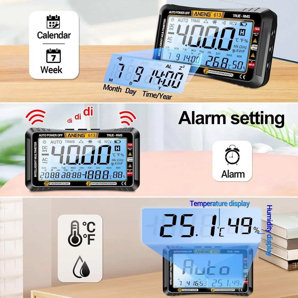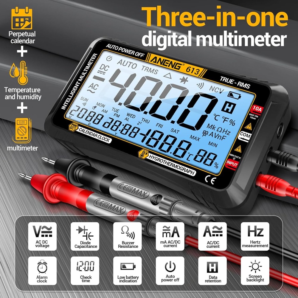 Free eBay listing template designed by dewiso.com ANENG Digital Multimeter Tester,4000 Counts Voltage Tester,Auto-Ranging TRMS Volt Meter,Large LCD Ohm Meter Measures AC/DC Current,Voltage,Resistance, Diode,Continuity,Capacitance,Temperature FREE AND FAST SHIPPING! About this item 【Large LCD Digital Multimeter Tester】ANENG 613 voltmeter with large LCD screen display,make it easy to read even in strong light or dark environment.its auto mode function allow you to quickly switch all measurement tasks,including AC/DC voltage,current,ohm,resistance,continuity,capacitor without selecting a mode or range. With data hold, low battery indicator, backlight display.Would be a great gift for househould DIY beginners and advanced professionals 【Special and Reliable】Aneng electricity tester not only provides essential measurement functions but also features a calendar and alarm clock, allowing you to keep track of time while you work. Additionally, it offers real-time temperature display, enabling you to monitor environmental changes.These convenient extra features make this ohm meter multimeter a versatile and reliable tool to provide reliable readings every time for your work 【Troubleshooting with Accuracy】ANENG circuit tester is easy to use, support data hold, low battery indicator and continuity buzzer. Includes Convenient feature like LCD Backlit Screen,you are no afraid of the dark when you work,makes it easy to use in dimly light areas or at night 【User-Friendly Interface】The voltage meter features an intuitive interface that is easy to use, even for beginners.Pocket multimeter is small and portable.If there is no test action, the LCD screen will automatically enter the hibernation state. Whether the job is a quick DIY continuity check or a complex problem, with well design and consistent readings pair well for a both long days in the field or tinkering in the garage,you will never worry about power problem 【Considerate Service】The package of this capacitor tester included 1*volt meters and multimeters,1*electrical tester kit(4*connection socket,2*PVC cable,2*copper needle,2*U-shaped insert,2*meter pen,2*alligator clips),1* multimetro test lead,2*1.5V AAA Battery,1* Instruction Manual and 1*storage bag. ANNENG electrical tester tools provides service and technical support Product We offer a 30-Day Return Policy on items which you are not completely satisfied with. You have the option for a full-refund or an exchange of the item. No returns are available on items shipped outside of the US . Shipping We offer Free Shipping to the US and ship within 2 business days of payment, usually sooner. We use UPS express shipping. That's why your products are usually delivered within 3 days . Contact We try our very best to make sure every customer is completely satisfied. If there's a problem , message us! We're happy to help. 24/7 live chat available.