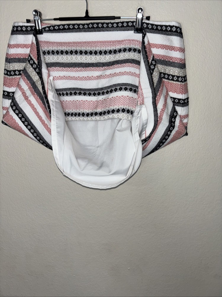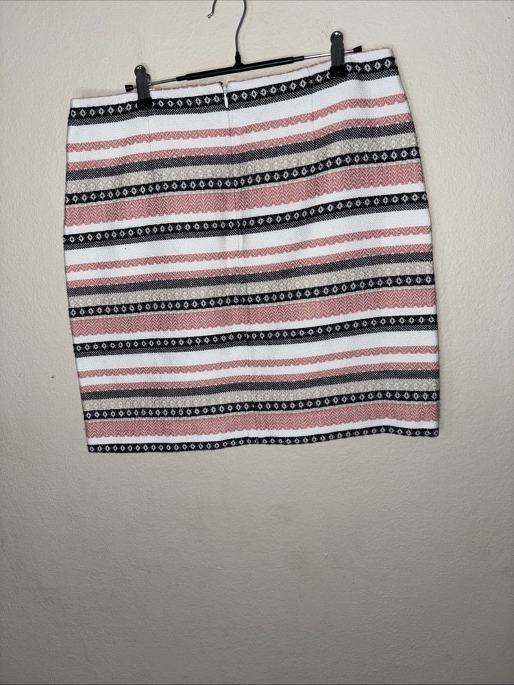 This product is a women's multicolor striped skirt from ANN TAYLOR LOFT in size 12. The skirt features a hook and eye closure, making it suitable for casual and business occasions. Made from a blend of polyester, rayon, and cotton, it is machine washable for easy care. The skirt is knee-length with a straight and pencil style, and is lined for added comfort. It also includes zipper and hook and eye accents, adding to its functionality and style.