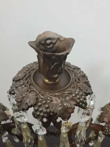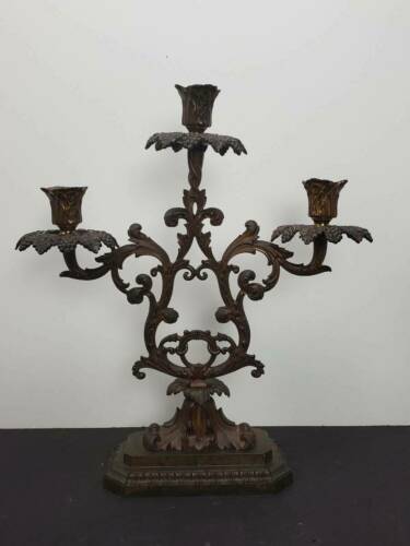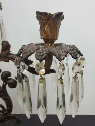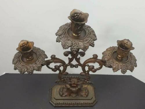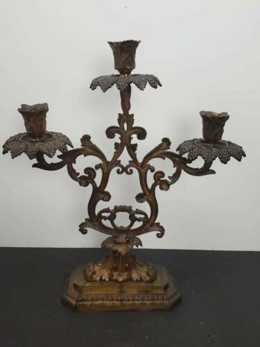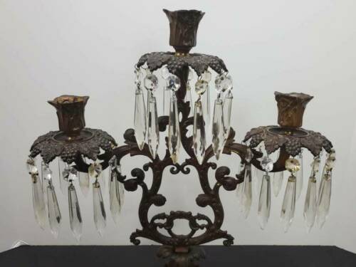 ANTIQUE BRONZE THREE ARM CANDLELABRA BLAKES PATENT, 19TH CENTURY Available for your consideration is this lovely three arm candelabra by Blake. Circa 19th century. This beautiful candelabra is either cast brass or bronze. It is decorated with leaf shaped holders and grape leaf and fruit bobeches. Each bobeche has x prisms. Marked "BLAKES PATENT" on the lower back side. The candelabra measures approx. 16 1/2" tall and 14 3/4" wide. Base measures approx. 8" wide and 4" deep. In very good antique condition. Bronze has been orange oiled. No chips, cracks, breaks or repairs found. Shed find, prisms may need a better cleaning. The pictures are an important part of this listing. Please use them as a condition aid. If you require additional photos or have questions please email before bidding. Thank you for looking. ATTENTION INTERNATIONAL BUYERS: Please understand that all international shipments will be shipped with full value declared. We will not falsify customs documents for any reason. It is illegal. I sell Vintage and Antique items therefore it is not always possible to include all scratches, imperfections etc. *COLORS ARE OUR BEST JUDGEMENT, SO PLEASE SEE PICTURES Please be aware my photos are considered part of the listing description and the description is based on my own knowledge, experience, and research. Statements regarding maker, age, origin, etc. particularly on unmarked pieces, should be evaluated and confirmed by you the buyer, as you are the final judge. Please ask questions that will help you in these evaluations. I also encourage and gladly accept opinions from knowledgeable buyers which only helps to make me a better seller and serve you better. Descriptions are as inclusive as possible but i f I miss something that is important to you please email me prior to bidding. I am always willing to combine shipping when practical. CT residents must add 6.35% sales tax. See my other listings for more great items! We accept PayPal and certified checks only. Shipping is generally the day following the receipt of payment via USPS or FedEx. If you have a preferred shipper please let me know. txzj pxzj24187 txzj-11 txzj85 txzj115