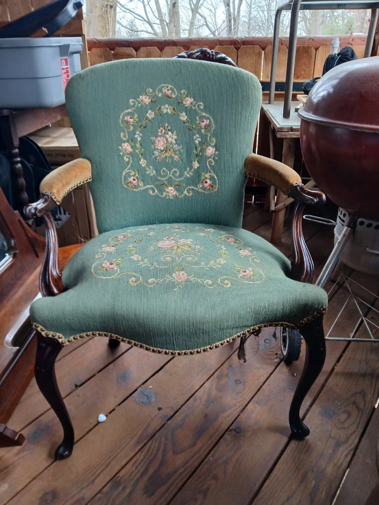 This beautiful antique armchair is a true Victorian treasure. Its intricately carved floral tapestry design is a stunning addition to any parlor or indoor space. The chair is fully assembled and requires no additional parts, making it a hassle-free addition to your collection. Crafted from high-quality wood, this armchair is both sturdy and elegant. Its needle point upholstery adds a touch of luxury to its already impressive features. The chair is a original piece and is not a licensed reproduction. It weighs 29 lbs and measures 24 inches in length, 23.5 inches in width, and 41 inches in height. This armchair is perfect for anyone looking for a unique and beautiful piece of furniture. The cushion underside needs attention.