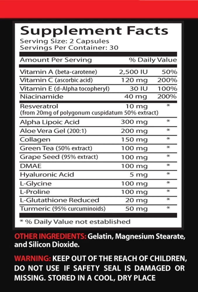 ANTI-WRINKLE COMPLEX - 60 Capsules: Elevate Your Skin to Timeless Beauty ANTI-WRINKLE COMPLEX ALL NATURAL FORMULA VIP Vitamins 1 Bottle 60 Capsules Made in USA Introducing our advanced Anti-Wrinkle Complex – a carefully crafted skincare solution designed to rejuvenate and revitalize your skin. Enriched with a powerful blend of key ingredients, this complex addresses various skincare concerns, promoting a more youthful and radiant complexion. Key Ingredients: Vitamin A: Renowned for promoting cell turnover, Vitamin A helps reduce the appearance of fine lines and wrinkles, contributing to a smoother skin texture. Vitamin C: A potent antioxidant, Vitamin C brightens the skin, shields against environmental damage, and stimulates collagen production for improved elasticity. Vitamin E: Nourishing and hydrating, Vitamin E supports skin health by moisturizing and protecting against free radicals, preventing premature aging. Niacin: Also known as Vitamin B3, Niacin enhances skin texture, reduces redness, and supports the skin's barrier function. Resveratrol: Derived from red grapes, Resveratrol boasts antioxidant properties, helping soothe the skin and combat signs of aging. Alpha Lipoic Acid: A powerful antioxidant, Alpha Lipoic Acid minimizes fine lines, wrinkles, and enlarged pores, promoting refined skin texture. Aloe Vera: Recognized for its soothing properties, Aloe Vera calms and hydrates the skin, promoting a healthy and radiant complexion. Collagen: Essential for skin elasticity, Collagen promotes firmness and reduces the appearance of sagging skin. Green Tea Leaf: Rich in antioxidants, Green Tea Leaf extract protects the skin from free radical damage, supporting a brighter and more even skin tone. Grape Seed: Packed with polyphenols, Grape Seed extract helps protect the skin against environmental stressors, reducing signs of aging. Benefits of Our Anti-Wrinkle Complex: Diminishes fine lines and wrinkles Boosts collagen production for increased elasticity Shields against environmental damage Nourishes and hydrates the skin Promotes a brighter, more even skin tone Experience the transformative power of our Anti-Wrinkle Complex and embrace a revitalized skincare routine with this comprehensive blend of skin-loving ingredients. Bid farewell to signs of aging and unveil a more youthful, radiant you. Supplement Facts: Serving Size: 2 Capsules Servings Per Container: 30 Per Serving * % Daily Value not established Vitamin C (ascorbic acid) 120 mg Vitamin E (d-Alpha tocopheryl) 30 IU Niacinamide 40 mg Resveratrol (from 20mg of polygonum cuspidatum 50% extract) 10 mg * 200% 100% 200% Vitamin A (beta-carotene) 2,500 IU 50% Alpha Lipoic Acid 300 mg * Aloe Vera Gel (200:1) 200 mg * Collagen 150 mg * Green Tea (50% extract) 100 mg * Grape Seed (95% extract) 100 mg * DMAE 100 mg * Hyaluronic Acid 5 mg * L-Glycine 100 mg * L-Proline 100 mg * L-Glutathione Reduced 20 mg * Turmeric (95% curcuminoids) 50 mg * Other Ingredients: Gelatin, Magnesium Stearate, and Silicon Dioxide. OTHER INGREDIENTS: Gelatin (bovine), vegetable agnesium stearate, rice flavour, and vegetable stearic