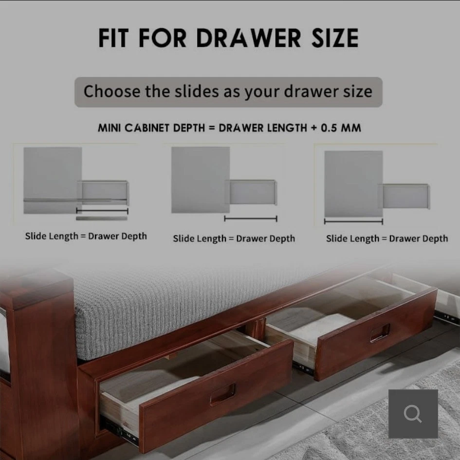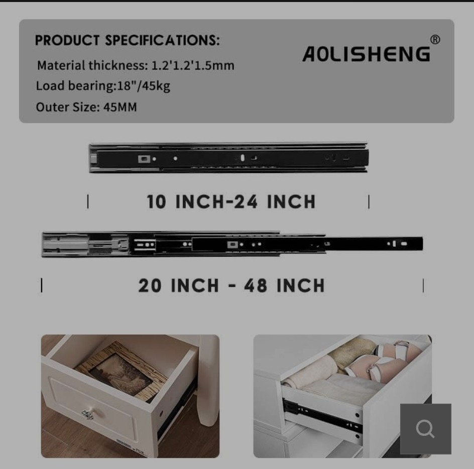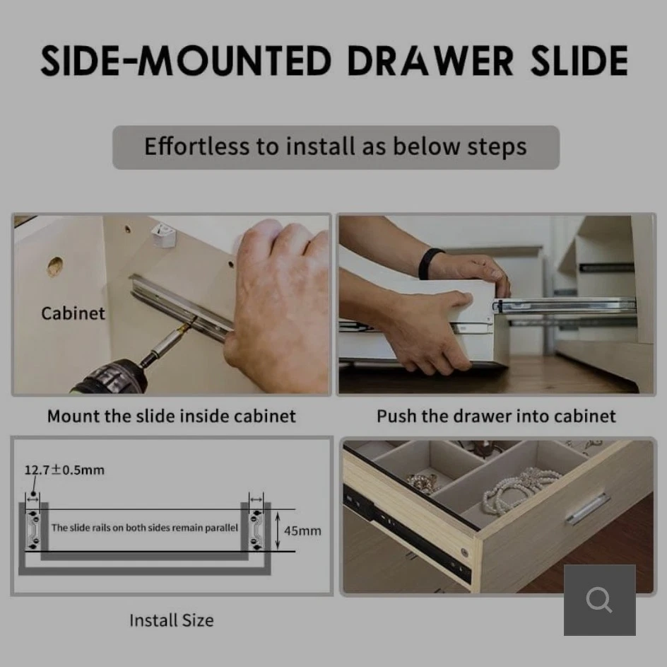Soft Close Drawer Slide AOLISHENG drawer slides have built-in damping silent devicesand the sound is as low as 25 decibels when closed, makingthe drawers smoother and quieter. Discover more about the Residential Drawer Slides New Brass Hydraulic Shock Absorbers: Automatic Soft-Close Drawer Slides Safe and Quiet Push open drawer slides can hold 100 lbs, 40 lbs more than regular slides. Fully extended and detachable slide rails for easy installation and storage The drawer slides are made of 1.2mm high quality cold rolled steel After testing, the number of opening and closing of the slide rail is as high as 150,000 times, and the service life is 30 years Aolisheng slide rail has excellent anti-rust and mute function Two rows of solid steel balls inside for smoother pulling Installation Guide: Slides Length: 11.81"(300mm), pull-out length:10.94"(278mm),suitable for drawers with internal depth ≥ 11.81". Left mounting clearance: 0.5" (12.7mm), right mounting clearance: 0.5" (12.7mm). 8 mounting screws are included in both ends of the product package. When installing, please push the inner ball bearing to the top of the slide rail first, then connect it with the slide rail, and finally complete the installation with a slight push.