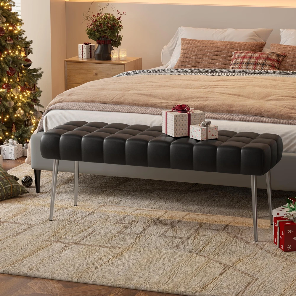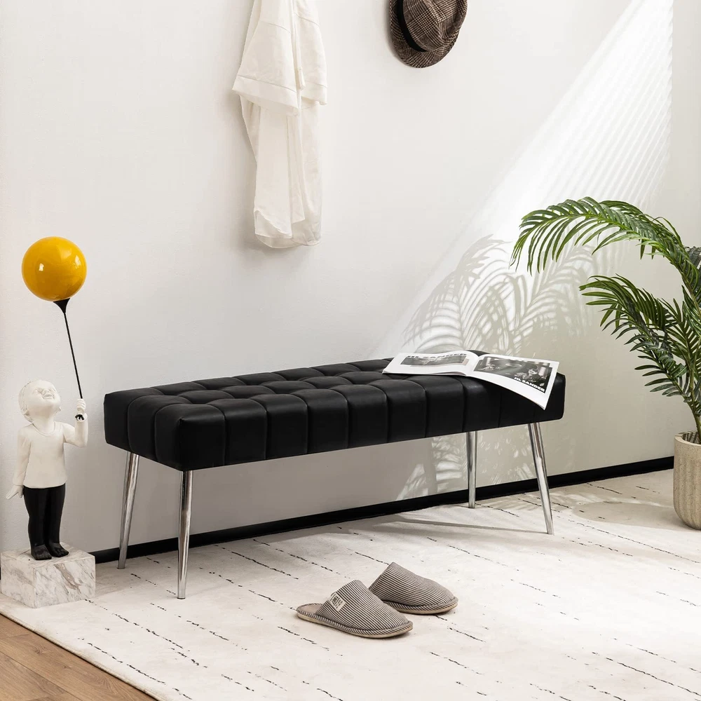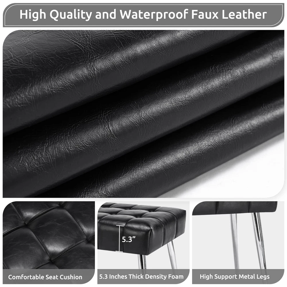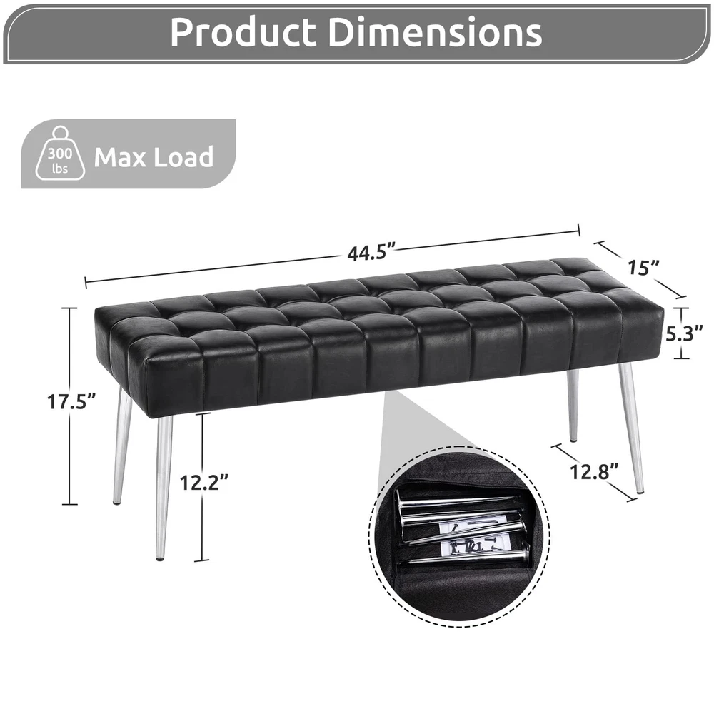【HIGH-QUALITY FABRIC】The bed bench is filled with high-density foam, comfortable and practical. Leather cushioning provides a soft but supportive seat. High-quality wooden frame without worrying about shaking, and metal feet highlight the sturdiness of this ottoman bench. 【MODERN DESIGN BENCH】Featuring a classic faux leather tufted with clean lines with stitched detailing works well with almost any look, tapered legs and trendy design, offers a chic atmosphere and flexible comfortable. 【WIDE APPLICABILITY】Extra bench seat in dining room when friends come over, or entryway bench to put on and take off your shoes, or modern bench to put clothes in the fitting room. The leather bench is a lovely addition to any room while making a luxurious, fashionable statement in a contemporary home. 【EASY TO ASSEMBLE】The metal legs, screws come stored in a well designed zippered compartment underneath. This ottoman comes with instruction and accessories, all you need is to screw the legs onto the seat and enjoy sitting in just 5 minutes. 【1-YEAR AFTER SERVICE】If you're not completely satisfied for any reason with your bench, please tell us and we will help you solve your problem within 24 hours.