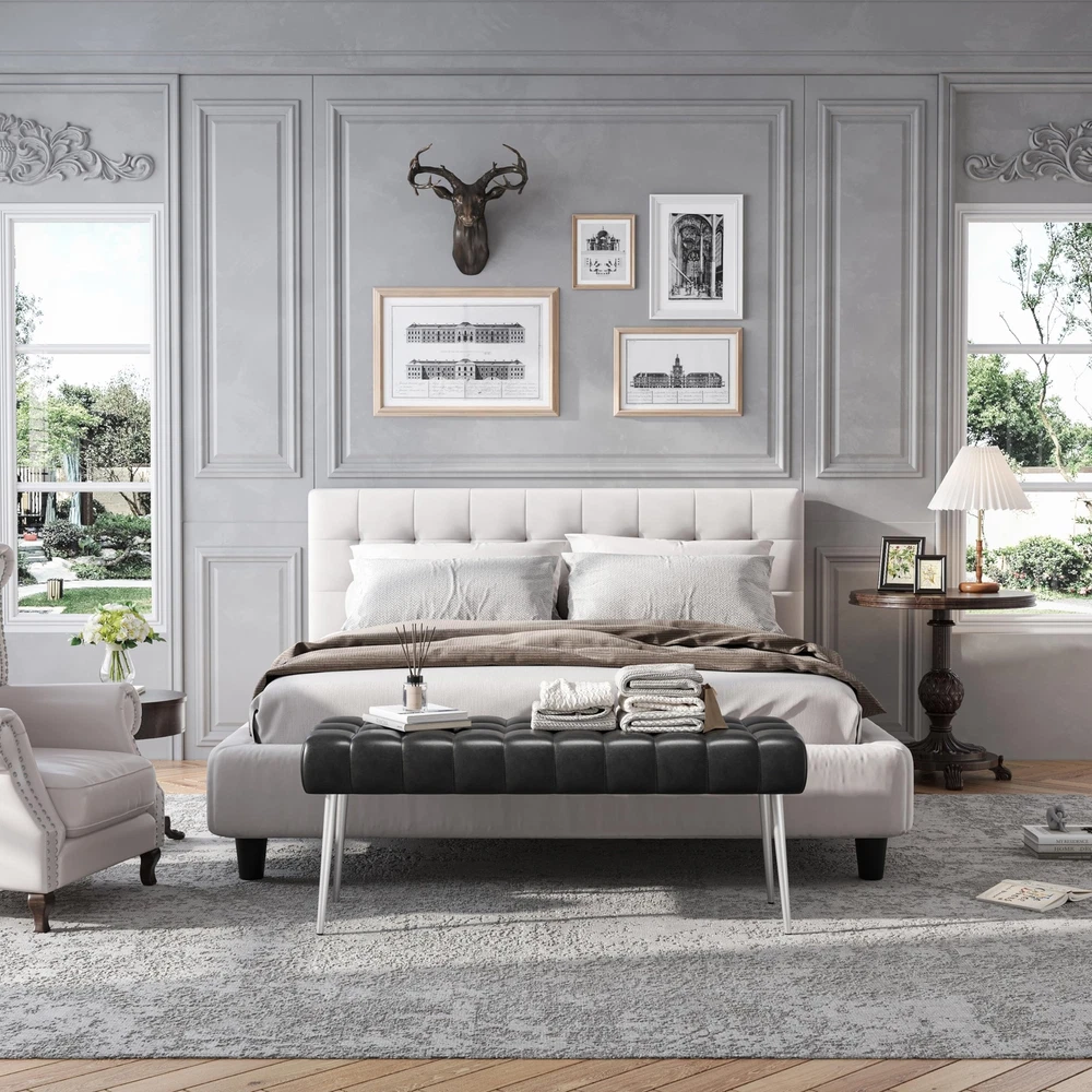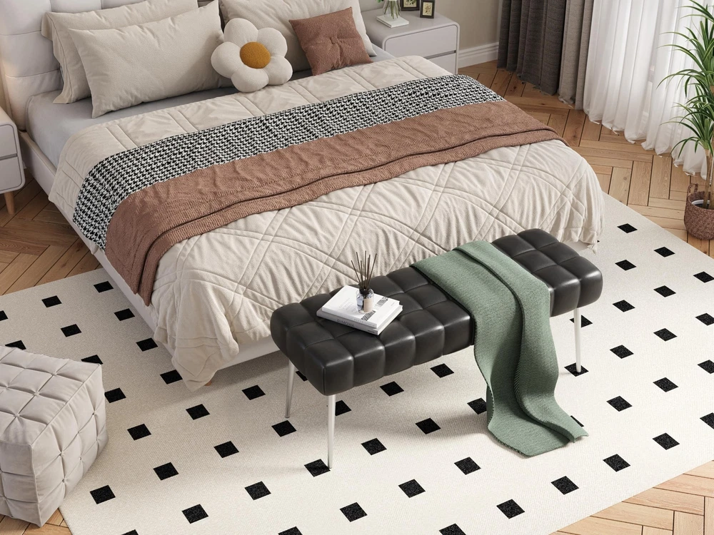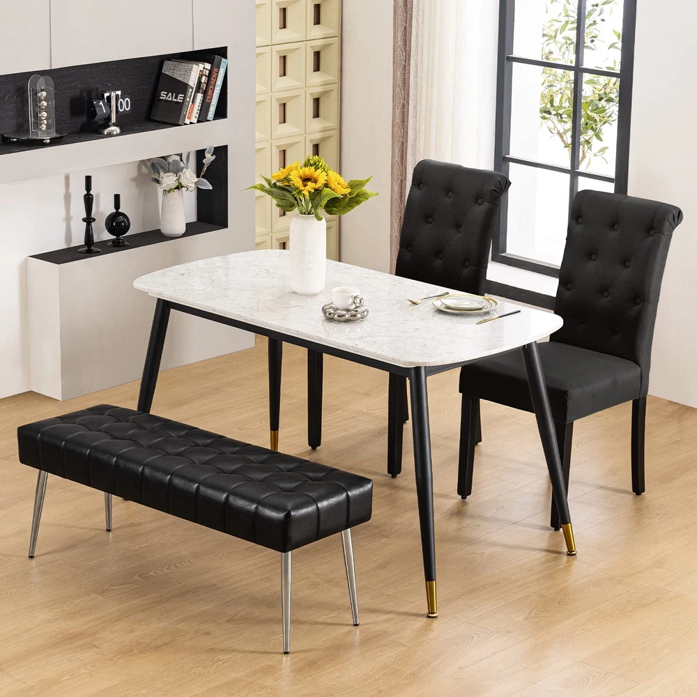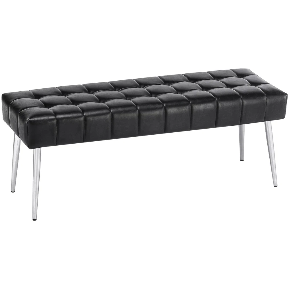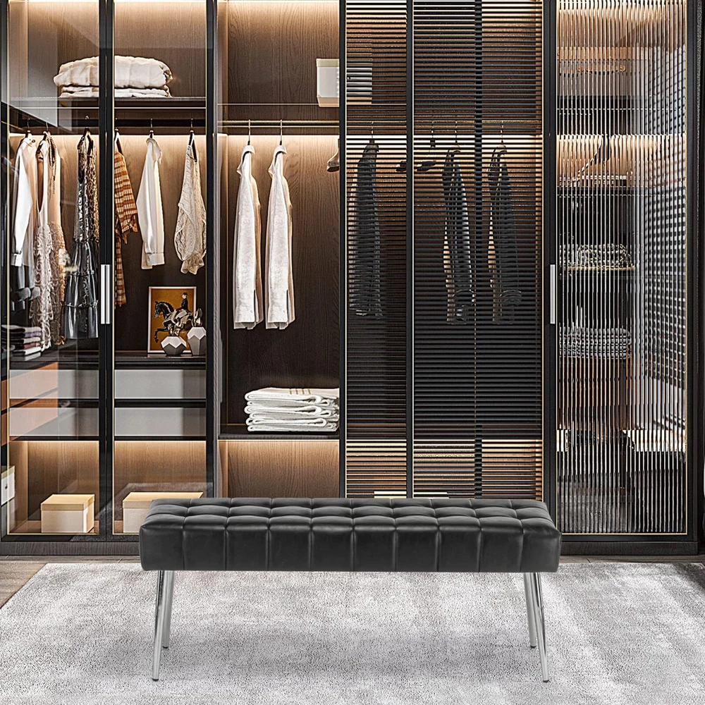 【HIGH-QUALITY FABRIC】The bed bench is filled with high-density foam, comfortable and practical. Leather cushioning provides a soft but supportive seat. High-quality wooden frame without worrying about shaking, and metal feet highlight the sturdiness of this ottoman bench. 【MODERN DESIGN BENCH】Featuring a classic faux leather tufted with clean lines with stitched detailing works well with almost any look, tapered legs and trendy design, offers a chic atmosphere and flexible comfortable. 【WIDE APPLICABILITY】Extra bench seat in dining room when friends come over, or entryway bench to put on and take off your shoes, or modern bench to put clothes in the fitting room. The leather bench is a lovely addition to any room while making a luxurious, fashionable statement in a contemporary home. 【EASY TO ASSEMBLE】The metal legs, screws come stored in a well designed zippered compartment underneath. This ottoman comes with instruction and accessories, all you need is to screw the legs onto the seat and enjoy sitting in just 5 minutes. 【1-YEAR AFTER SERVICE】If you're not completely satisfied for any reason with your bench, please tell us and we will help you solve your problem within 24 hours.
