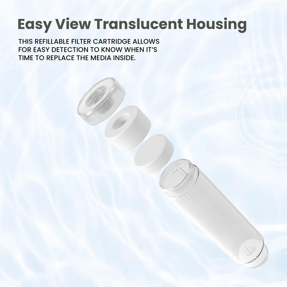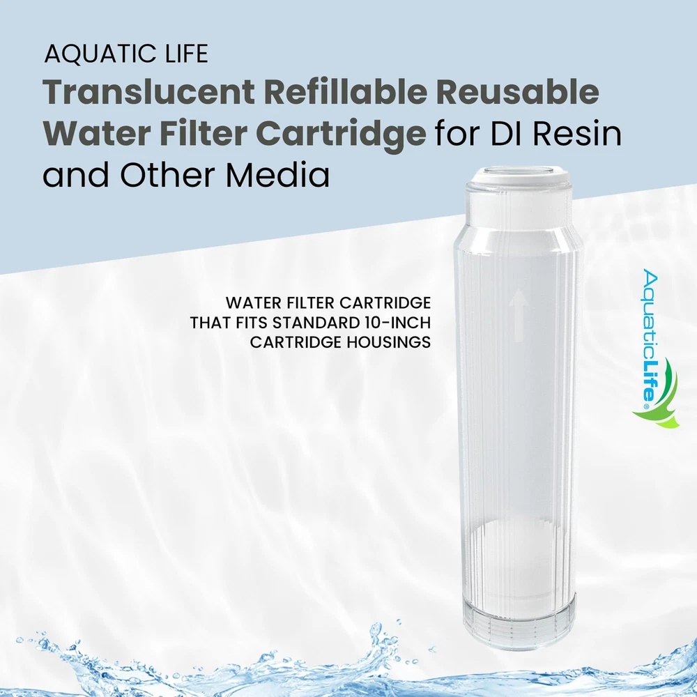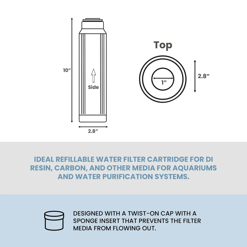 REFILLABLE WATER FILTER CARTRIDGE – Ideal refillable water filter cartridge for DI Resin, Carbon, and other media for aquariums and water purification systems. Reusable water filter cartridge, an environmentally friendly option. 10-INCH STANDARD SIZE – 10" x 2.5" water filter cartridge that fits standard 10-inch cartridge housings. Designed with a Twist-On Cap with a Sponge insert that prevents the filter media from flowing out. EASY VIEW TRANSLUCENT HOUSING – The translucent housing of this refillable filter cartridge allows for easy detection to know when it’s time to replace the media inside. When it’s exhausted, simply refill the cartridge with new media. WITH – Cartridge caps unscrew to allow for refilling with AquaticLife bulk resin. with Captive Purity, Kent , Seachem, Coralife, BRS, and most other residential or aquarium/hydro DI and RODI systems. UNSURPASSED QUALITY AND SATISFACTION – AquaticLife manufactures an assortment of water filtration equipment. Every product that goes out the door meets our highest standards and quality.