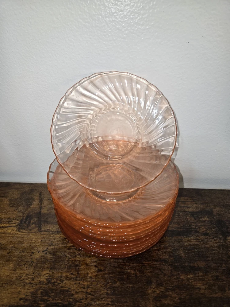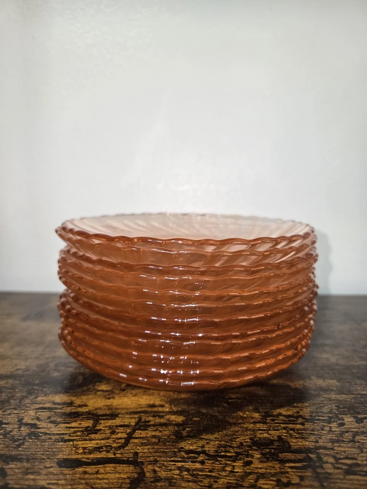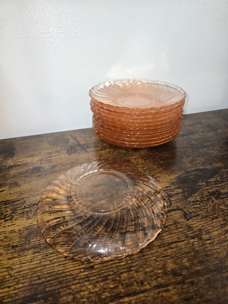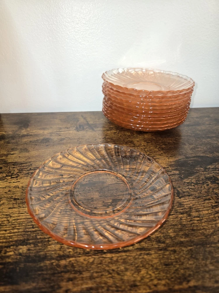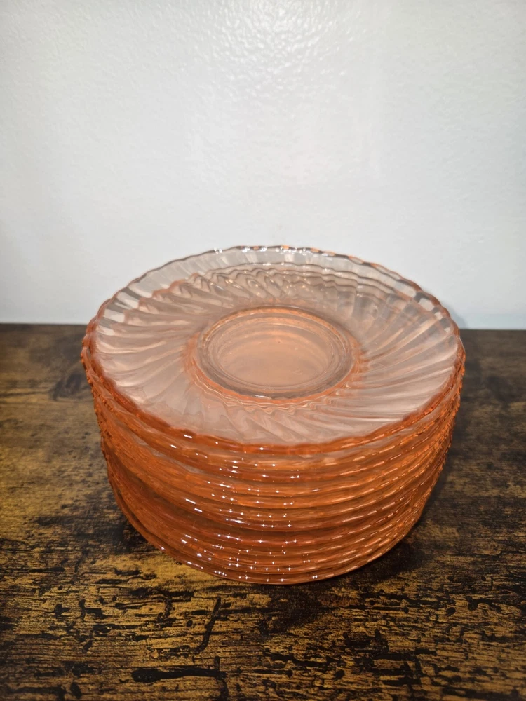 Add a touch of elegance to your tea time with this set of 12 Arcoroc France glass saucers. The Rosaline Swirl pattern, made of pink depression glass, adds a charming and vintage touch to any occasion. These round saucers are perfect for all occasions and are sure to impress your guests. The set includes tea glasses and is made of original, licensed reproduction glassware. The decorated features and the country of manufacture, France, make this set a unique addition to any glassware collection.