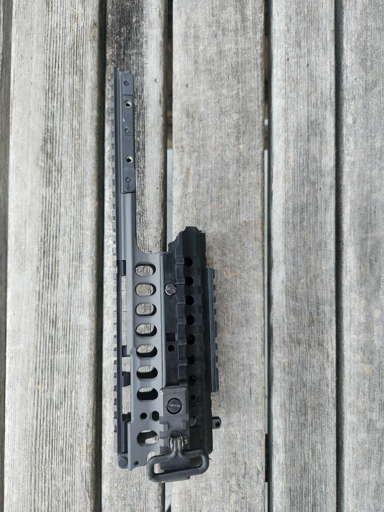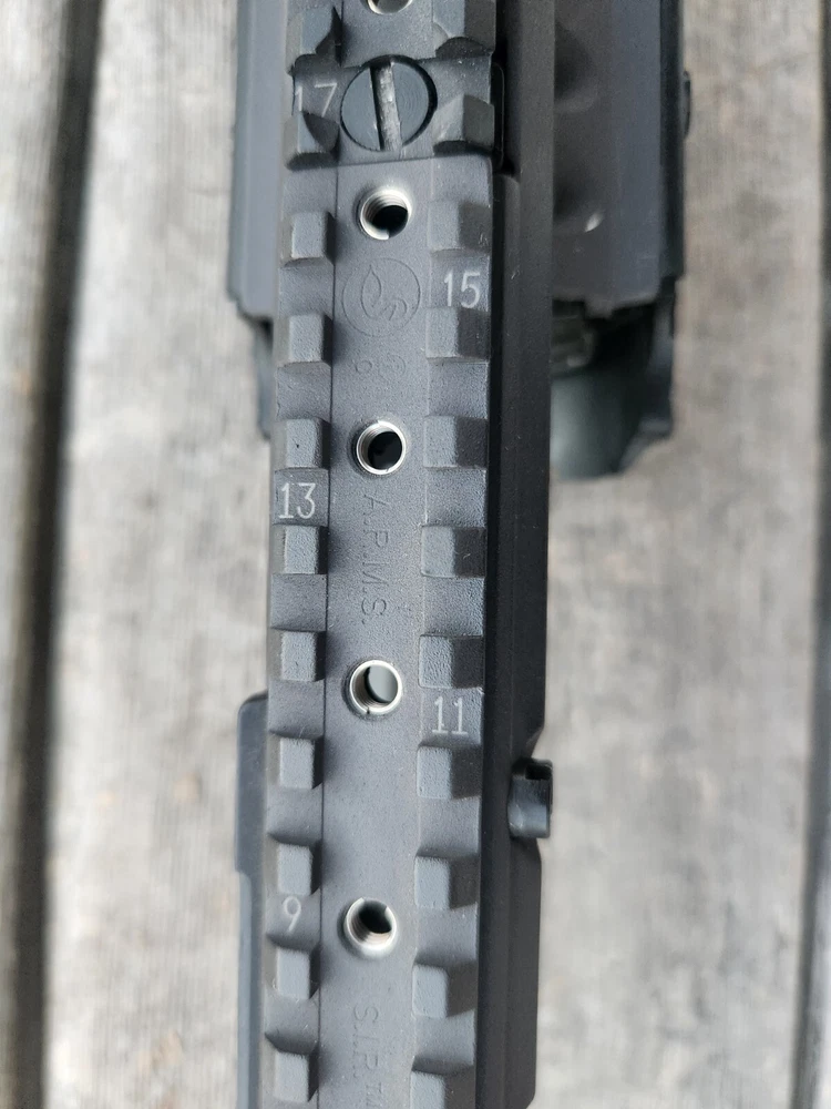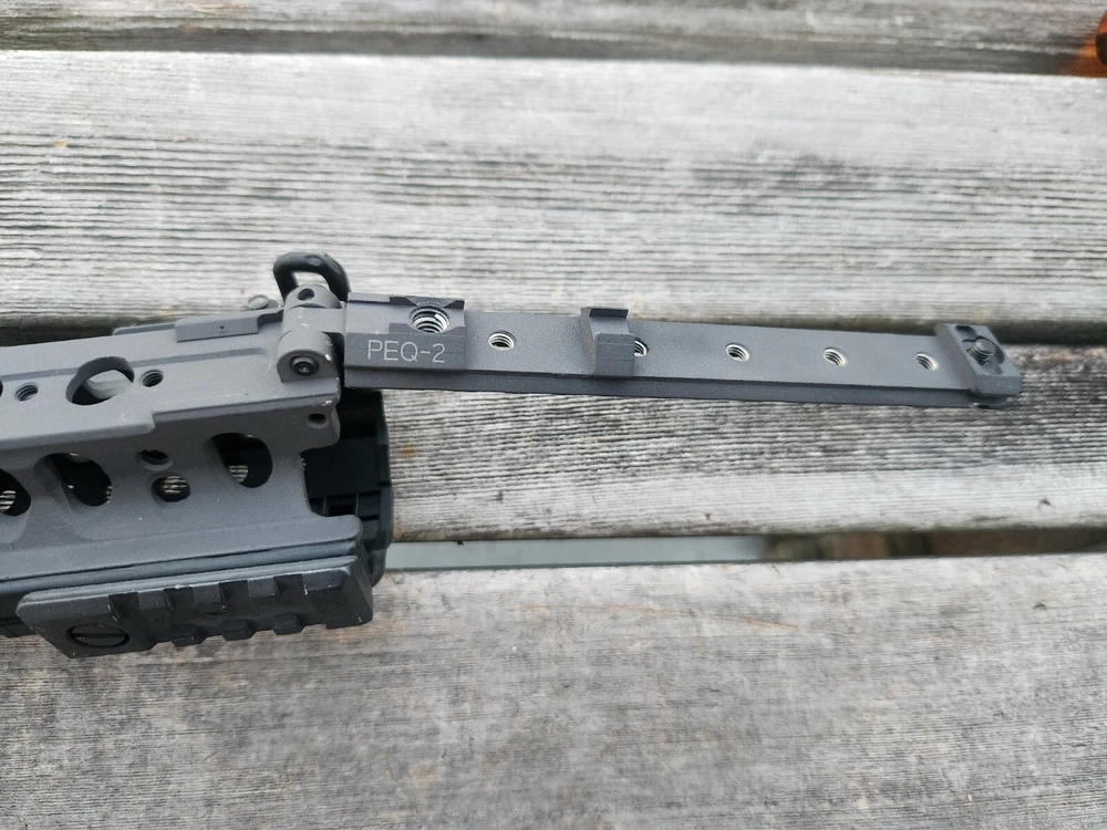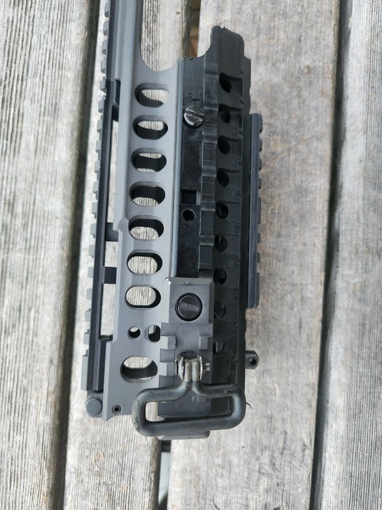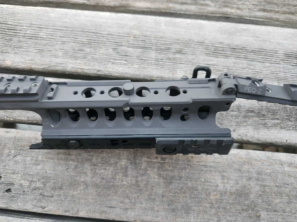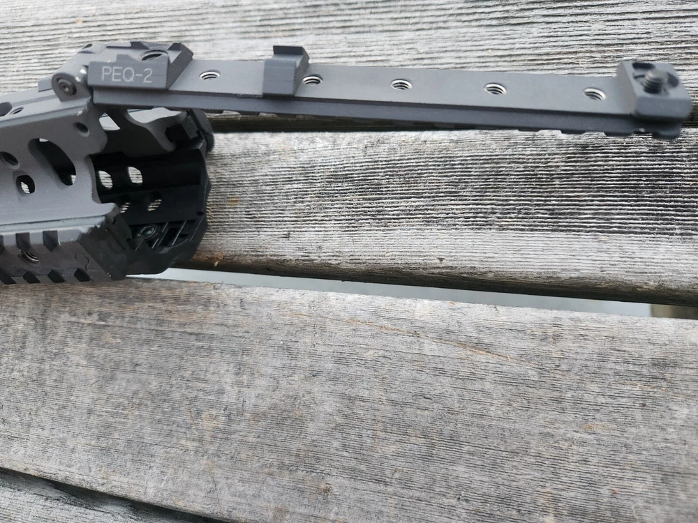 very hard to find ARMS 45C rail and mount. also has a PEQ-2 flip up section! these rail are very sought after. A.R.M.S flat top mount. Carbine length rail. all hardware is present to mount. look at photos for description and condition. thank you!