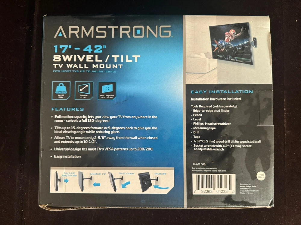 Brand:Armstronggtin13:792363642385Type:Wall MountMaximum Screen Size Fitment:17 - 42 inColor:BlackCountry/Region of Manufacture:ChinaUPC:792363642385VESA Hole Pattern:100 x 100 mm, 200 x 100 mm, 200 x 200 mmCompatible Brand:UNIVERSALMPN:64238Features:N/AYear Manufactured:2020Maximum Weight Fitment:66 lbsManufacturer Warranty:NONE