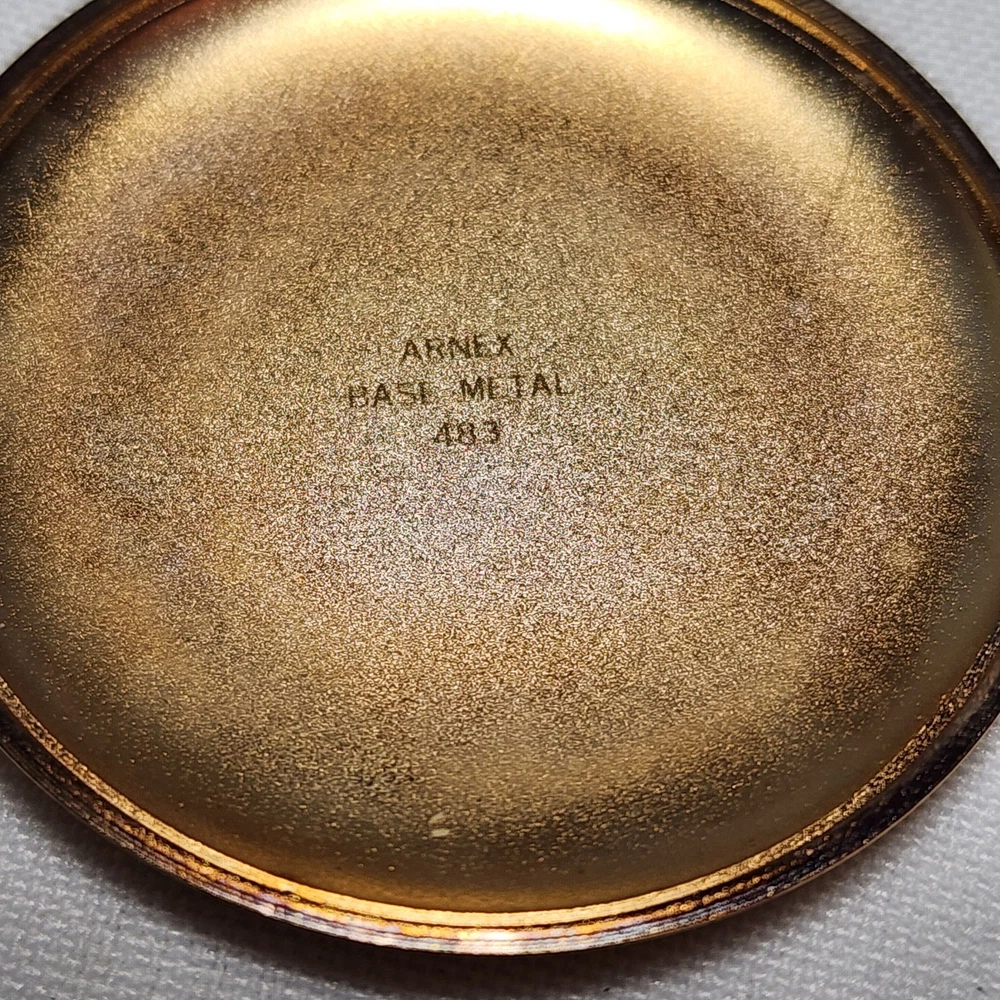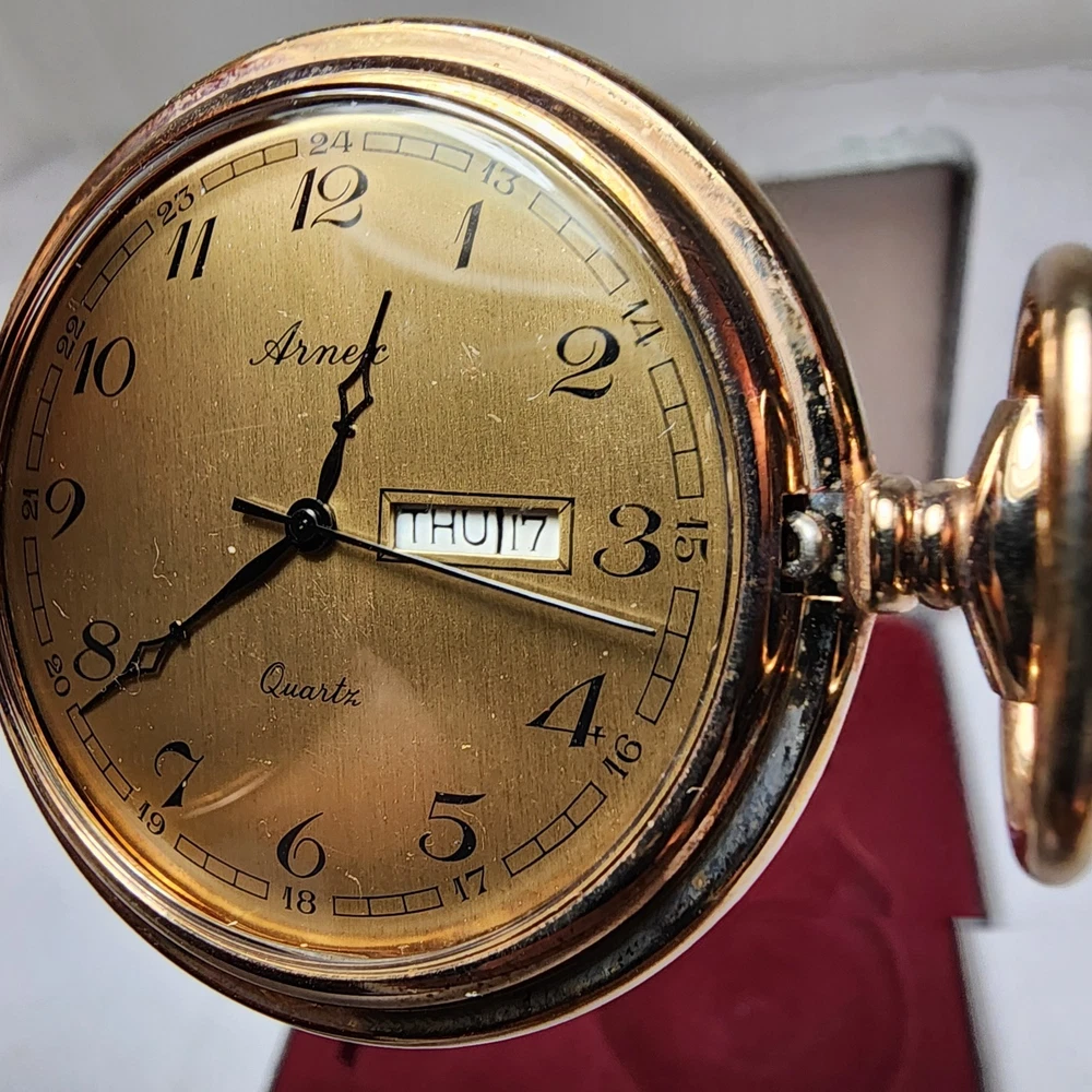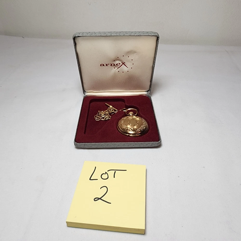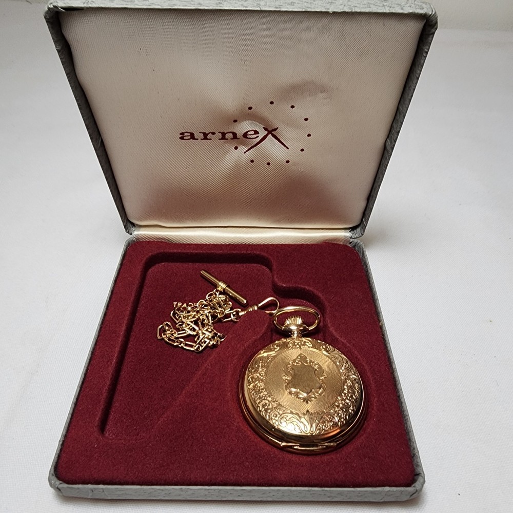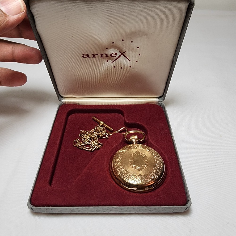 Features:12-Hour DialCustomized:NoType:Pocket WatchStyle:CasualBrand:ArnexCase Color:Yellow GoldCase Material:Gold PlatedDepartment:MenIndices:Roman NumeralsDisplay:AnalogWith Papers:NoPocket Watch Size:48MMClosure:FlowersMovement:QuartzVintage:NoWith Original Box/Packaging:NoSeller Notes:“Normal wear as shown in the photos. ** Untested** Needs Battery. SOLD AS IS>”