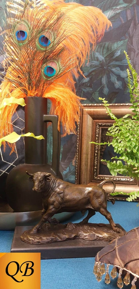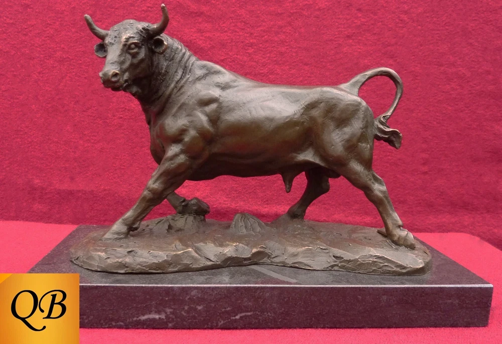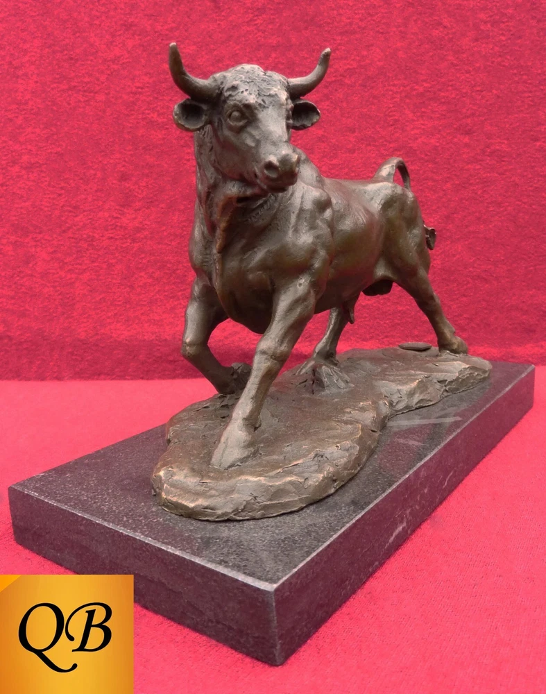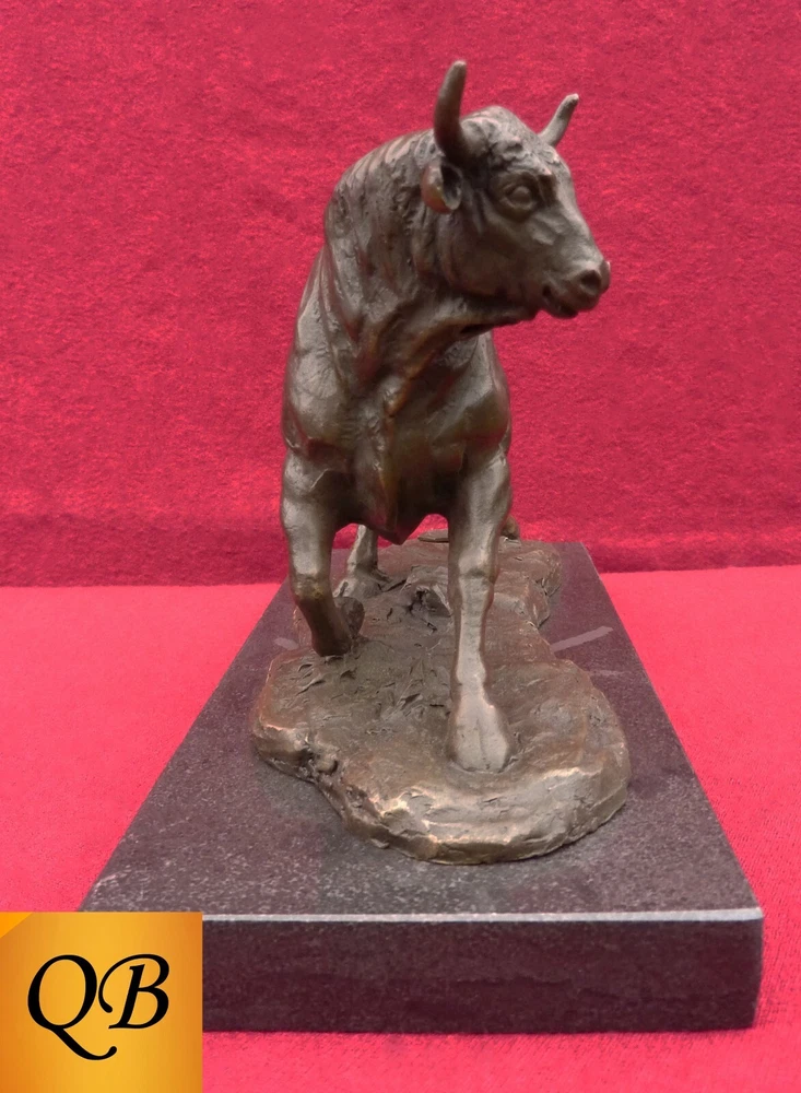 Magnificent bronze Bull, signed figurine, securely mounted on a black marble base. I am an established supplier of quality, pure bronze, statues & figurines, offering many of the standard bronzes sold within the UK, together with some of the rarer bronzes. This extremely high quality bronze, produced by the hot cast, lost wax technique is securely mounted on a solid marble base Dimensional Data The statue, overall, is 140 mm (5 1/2") high, around 160 mm (6 1/4") long, from horn tip to rear hoof and weighs 2,3 kgs (5 lbs) The rectangular black marble base is 210 mm (8 1/4") long x 100 mm (4") deep x 20 mm (3/4") thick General A stunning bronze piece, with incredible detail, adding distinction as either a centrepiece, or main attraction to any dwelling. A moving & powerful example of an Adult standing Bull, dynamically poised. This statue bears the name "Barye" & carries a foundry coin Stock photos, so slight colour variations may occur within either the marble or the patina All my bronzes are of pure metals, & not resin based products Customer Service & Support As a professional supplier, I will arrange for free collection in the event of any concerns with my product due to transit damage. Many thanks for looking at my bronze portfolio, If you have any specific requirements please feel free to contact me.