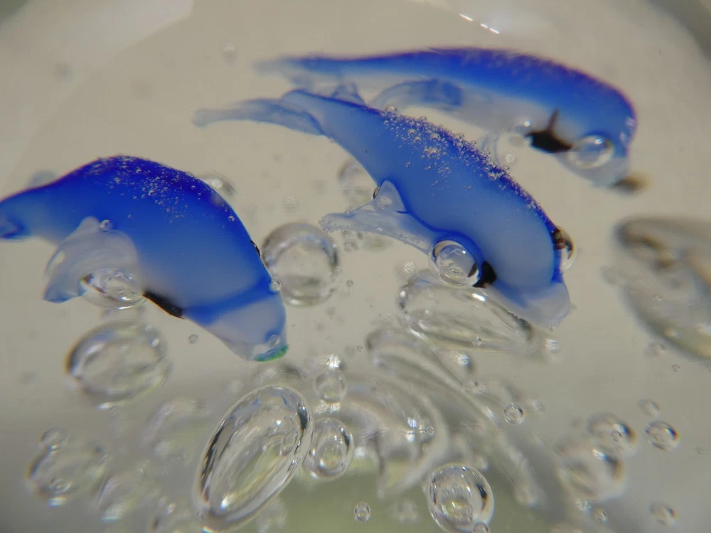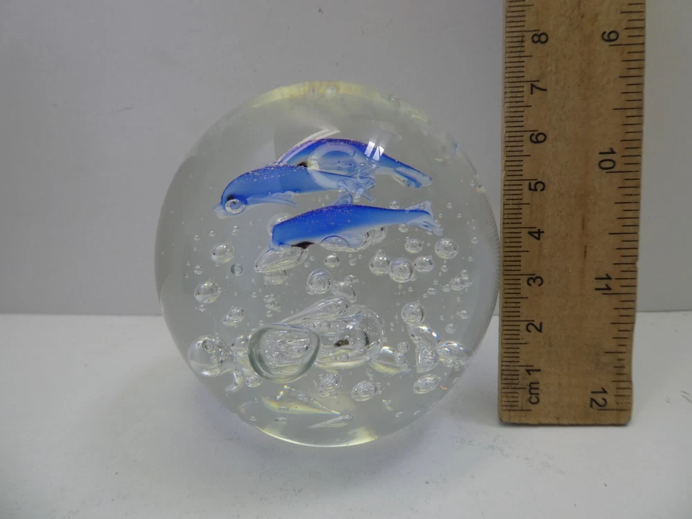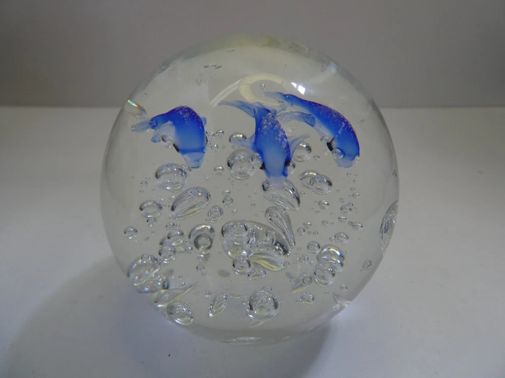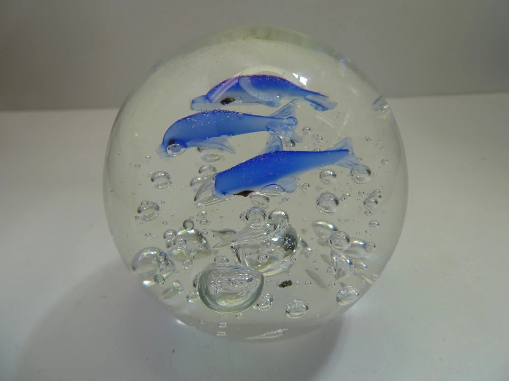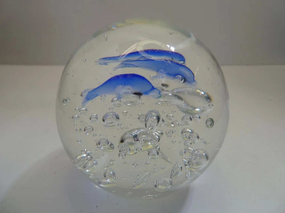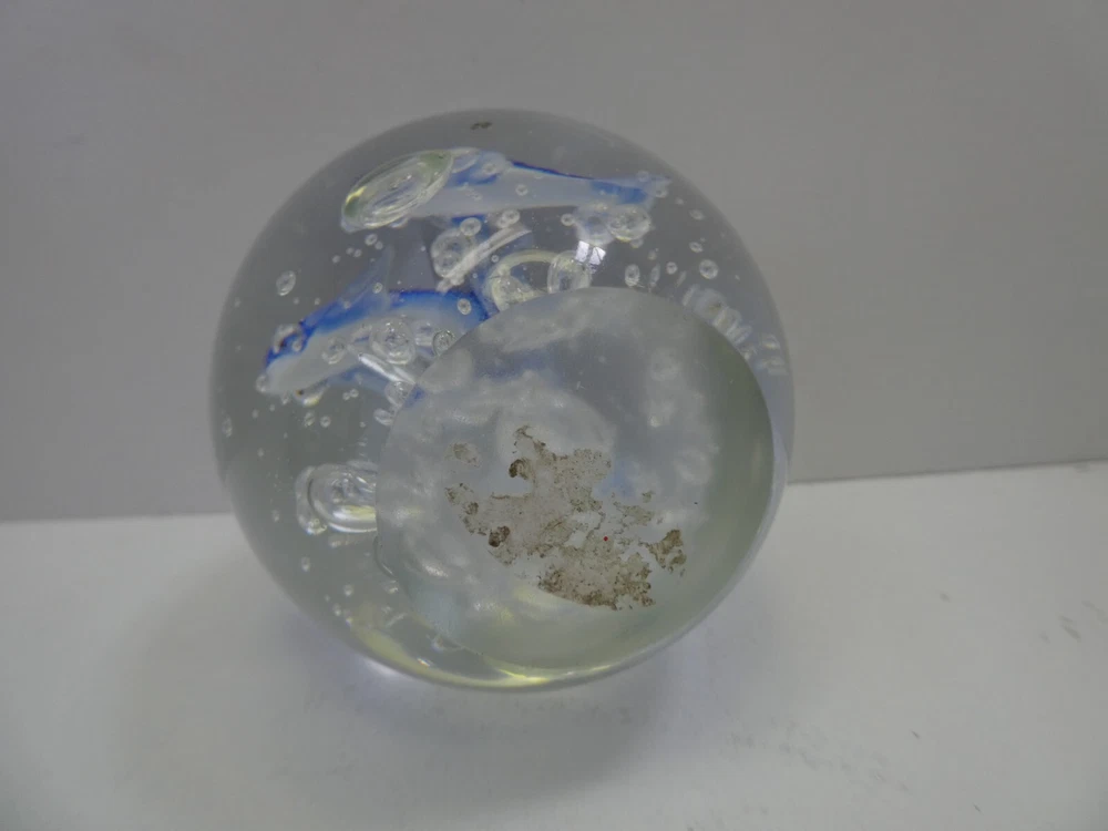 ART GLASS PAPER WEIGHT CASED DOLPHINS & AIR BUBBLES 7.5 CM HIGH GOOD CONDITION SEE PHOTOS FOR BEST GUIDE