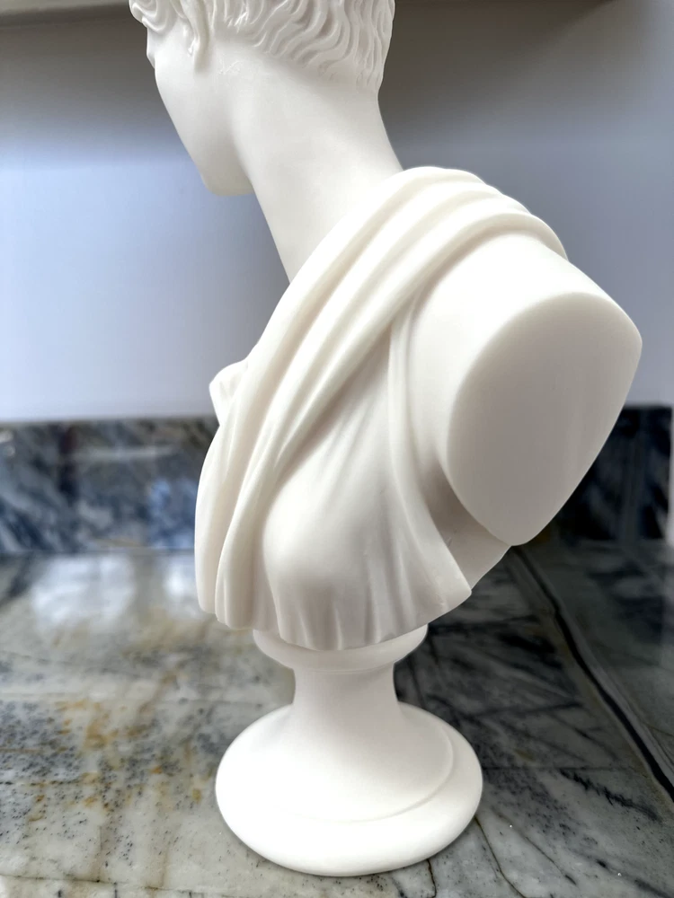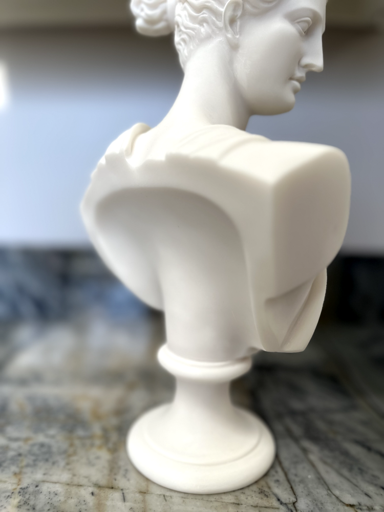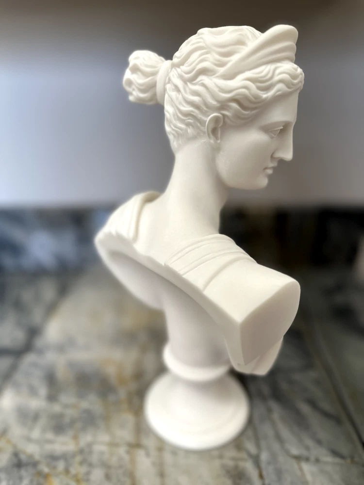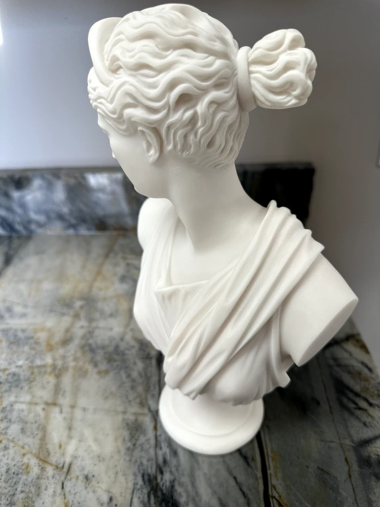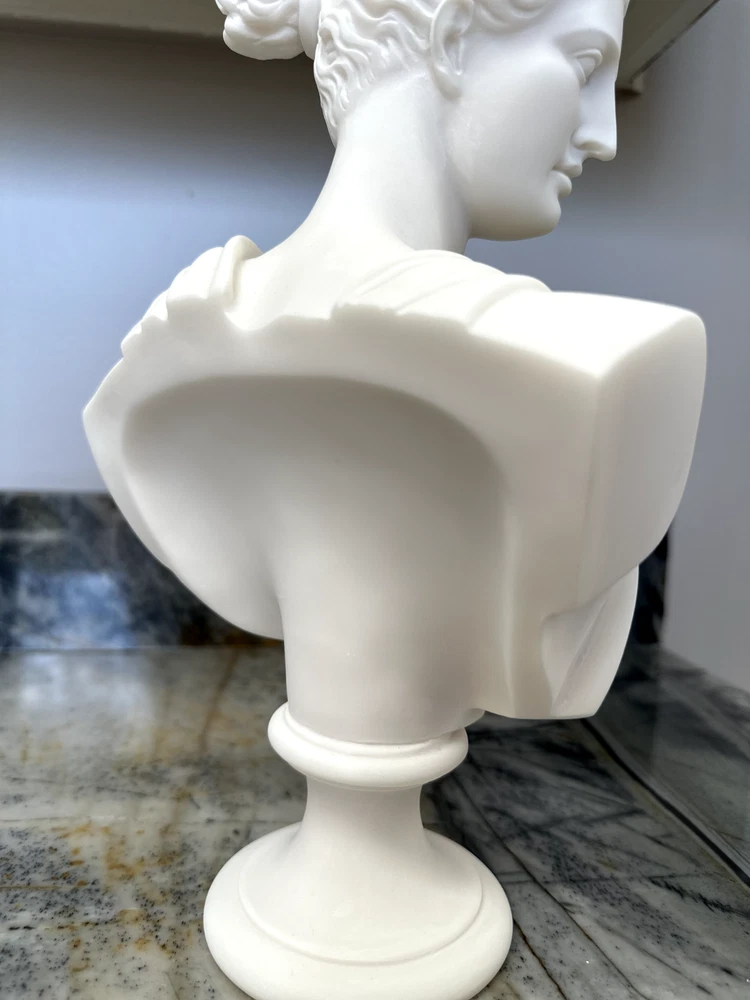 Elevate your space with the Artemis Diana Bust Head Greek Roman Goddess Statue, an exquisite representation of mythological artistry. In Greek mythology, Artemis was the daughter of Zeus and Leto and the twin sister of Apollo. In Roman mythology, she was known as Diana. She was the virgin moon goddess of the hunt, wild animals, healing, wilderness, chastity, and, ironically, childbirth (she was worshipped as a fertility/childbirth goddess mostly in cities). Carved with meticulous attention to detail, this 12.2-inch medium-sized bust brings the enigmatic allure of Greek culture directly to your table. The natural alabaster material provides a cool, understated texture and a touch of timeless elegance. This piece is an ideal addition for collectors and enthusiasts alike who value the intersection of cultures and ethnicities in their décor. Dimensions: Height - 12.2" / Width - 7.48" / Depth - 2.5" Finish: Cast Alabaster Cast Alabaster is a natural crushed stone that gives the feeling of marble; it's a solid, heavy-weight material that is water-resistant. It was first cast from a mold and finished by hand to ensure the finest quality. Made in Crete, Greece ******** I am a brand new seller on eBay, however you may contact me for FBMP reviews.