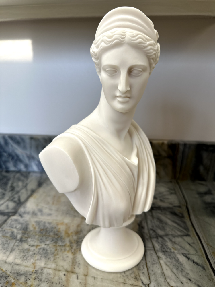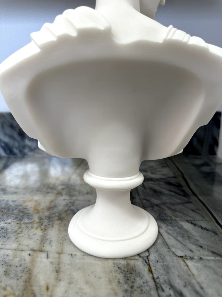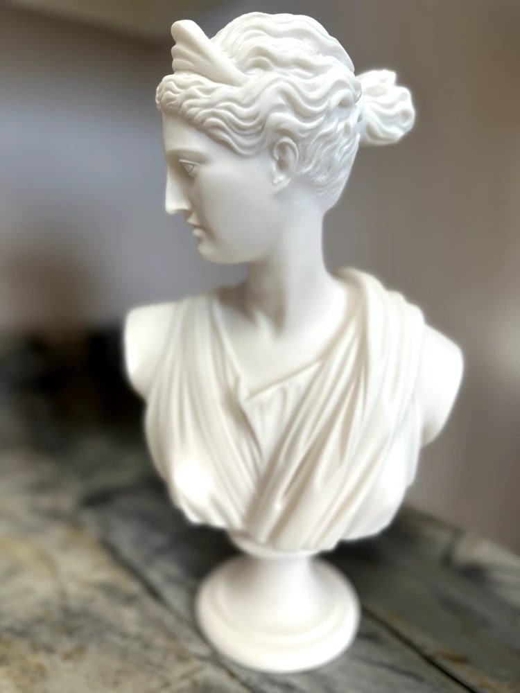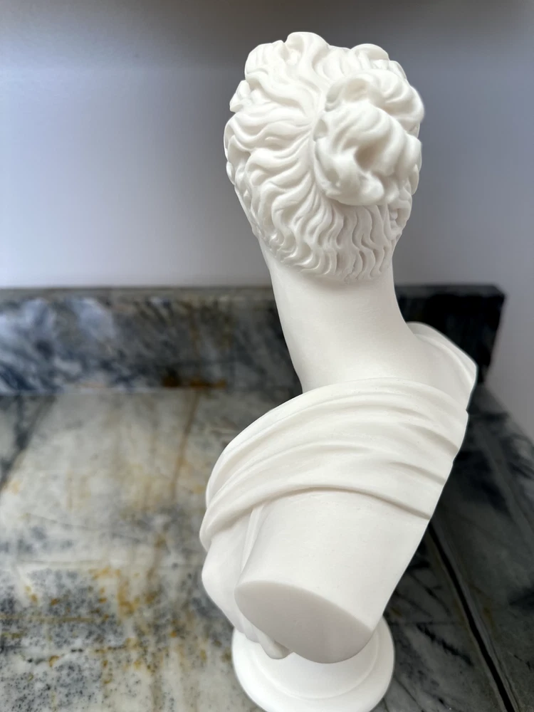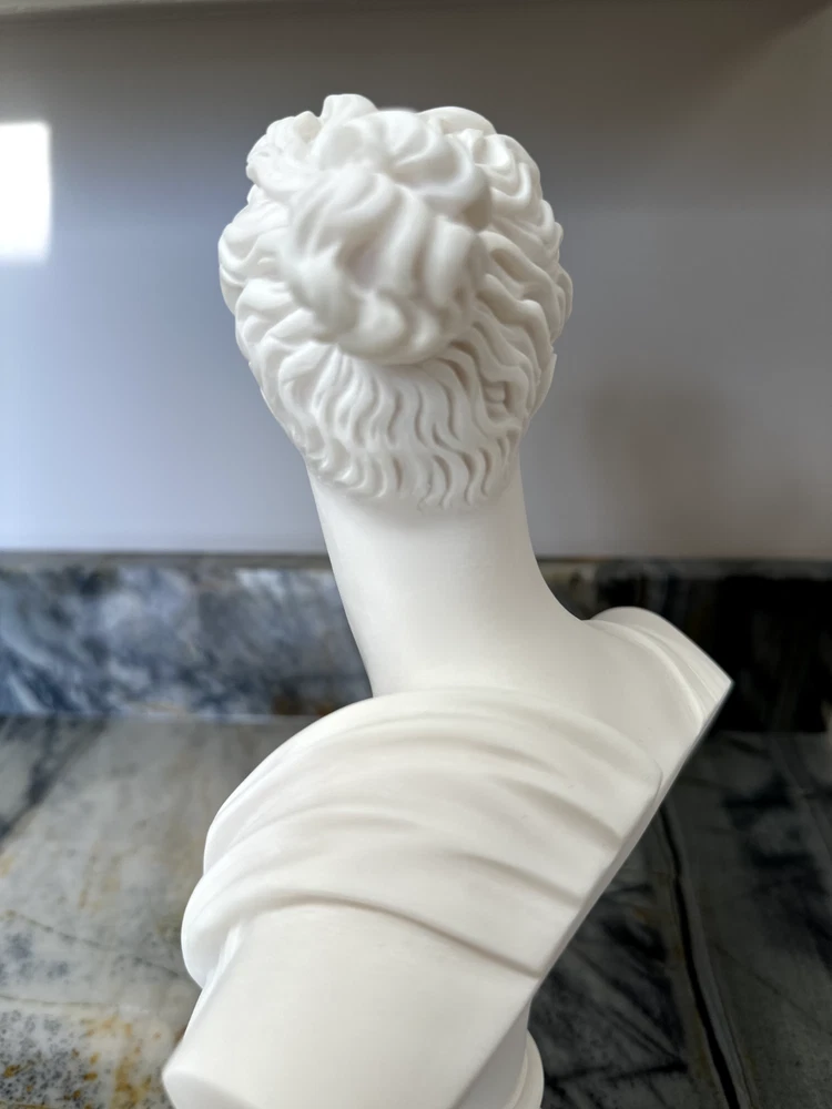 Elevate your space with the Artemis Diana Bust Head Greek Roman Goddess Statue, an exquisite representation of mythological artistry. In Greek mythology, Artemis was the daughter of Zeus and Leto and the twin sister of Apollo. In Roman mythology, she was known as Diana. She was the virgin moon goddess of the hunt, wild animals, healing, wilderness, chastity, and, ironically, childbirth (she was worshipped as a fertility/childbirth goddess mostly in cities). Carved with meticulous attention to detail, this 12.2-inch medium-sized bust brings the enigmatic allure of Greek culture directly to your table. The natural alabaster material provides a cool, understated texture and a touch of timeless elegance. This piece is an ideal addition for collectors and enthusiasts alike who value the intersection of cultures and ethnicities in their décor. Dimensions: Height - 12.2" / Width - 7.48" / Depth - 2.5" Finish: Cast Alabaster Cast Alabaster is a natural crushed stone that gives the feeling of marble; it's a solid, heavy-weight material that is water-resistant. It was first cast from a mold and finished by hand to ensure the finest quality. Made in Crete, Greece ******** I am a brand new seller on eBay, however you may contact me for FBMP reviews.