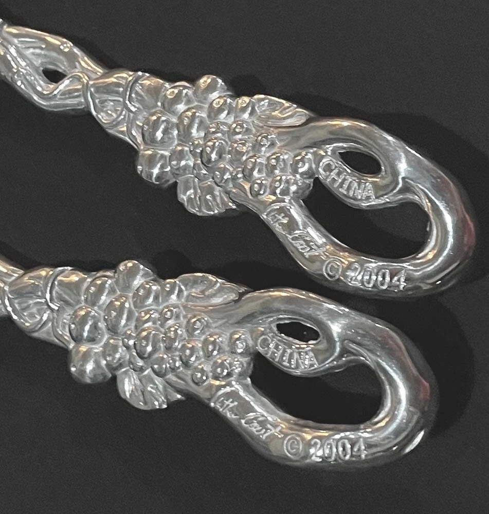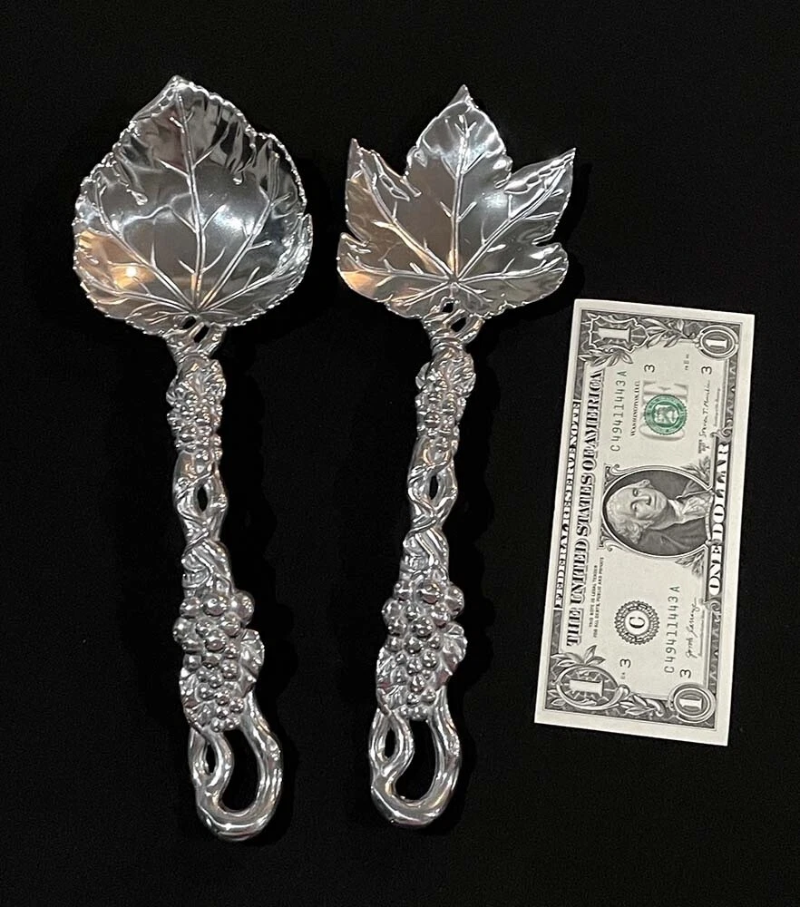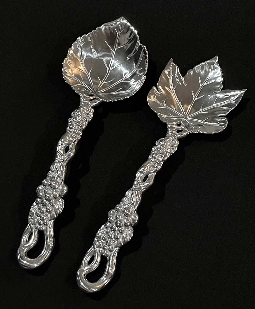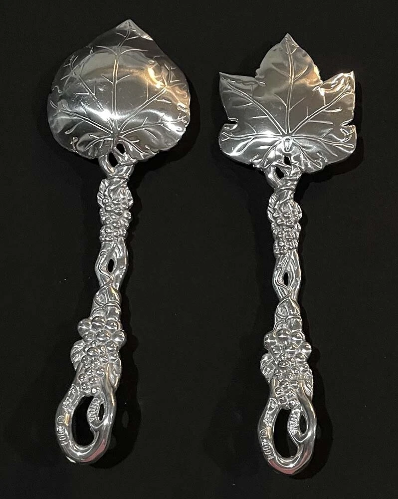 This is a set of salad serving set with Grapevine pattern by Arthur Court. Serving Fork - about 11.25 inches long Serving Spoon - about 11 inches long. Marking is "ARTHUR COURT © 2004". Condition is previously owned but appears to be unused and shiny as shown. The set weighs 8.8 oz. The material is aluminum and silver tone, any other colors are just light reflection. A $1 bill is placed for size reference and not included. Please review photos and description, ask all the necessary questions before making a purchase! All sales final as I do not wish to take return due to expensive postage! * * * Non-smoking environment! * * *