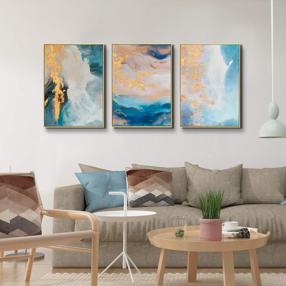 ARTLAND Teal Abstract Wall Art 3 Pieces with Turquoise Gold Marble Framed Art Wall Decor for Home Decor Living Room Bedroom Office Stretched and Framed Ready to Hang 24x48 inches ✓ Free 60 Day Returns ✓ Free Express Shipping Description: Abstact Art Painting This modern wall art also makes a great conversation piece for your guests.All of our artwork arrives completely ready to hang on the wall. Each piece is carefully packaged, in a sturdy corrugated box, to ensure your artwork arrives in perfect condition. Due to the handcrafted nature of these panels, each piece may have subtle differences. SPECIFICATION: Painting type:Hand-made Oil Painting. Subject:Abstract Decorative Artwork Materials: Canvas and wood Frame: Stretch with wood framed(Ready to hang). The framed back is cover by a narrow black satin. Customization: Accepted. Feel free to contact us. ABOUT SERVICES Each art workcomes with a 100% satisfaction guarantee. If you're not happy with it (for any reason!), you can return it for a full refund any time. If you have any problem, feel free to contact us! Features: Size of Colorful Painting: overall size:24x48inch(40x60cmx3),Total 3pcs a set;Color:Blue,Gold. READY TO HANG ABSTRACT CANVAS WALL ART: Hook is already mounted on the stretcher bar to make the placement on the wall more easier! This canvas wall art is ready for hanging as soon as it shows up. ENVIRONMENTAL MATERIAL WILL NOT FADE. We assure you that our modern canvas art is poison-free and odor-free performance,will last for years and look as stunning as it did on day one. PERFECT CHOICE OF GIFTS:Best choice gift idea for holiday, wedding, Christmas, Valentine's Day, Anniversary, Father's Day, Mother's Day, Birthday. Hand-painted high quality oil paintings by professional artist. Each canvas art is custom made. Actual artwork may be slightly different from the product image. Any questions just feel free to email us. Product Details: Product Dimensions: 48 x 24 x 0.04 inches Item Weight: 9.38 pounds Date First Available: October 10, 2019