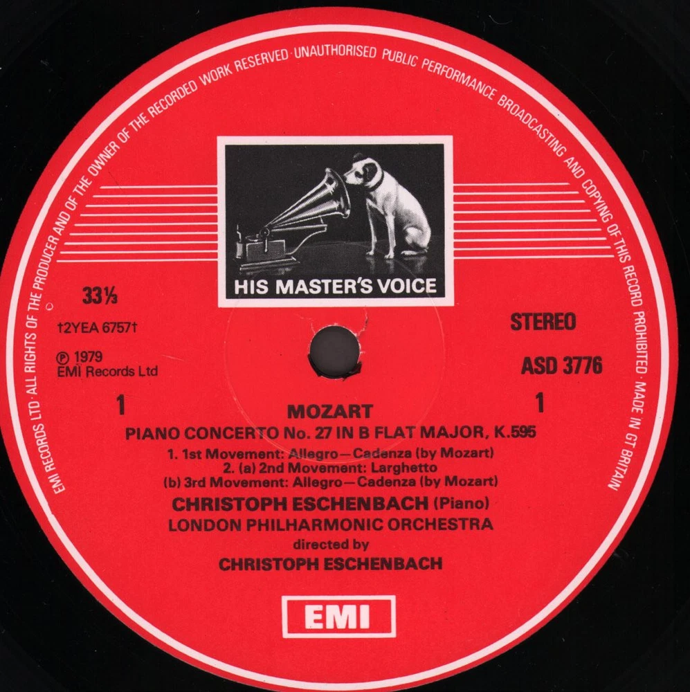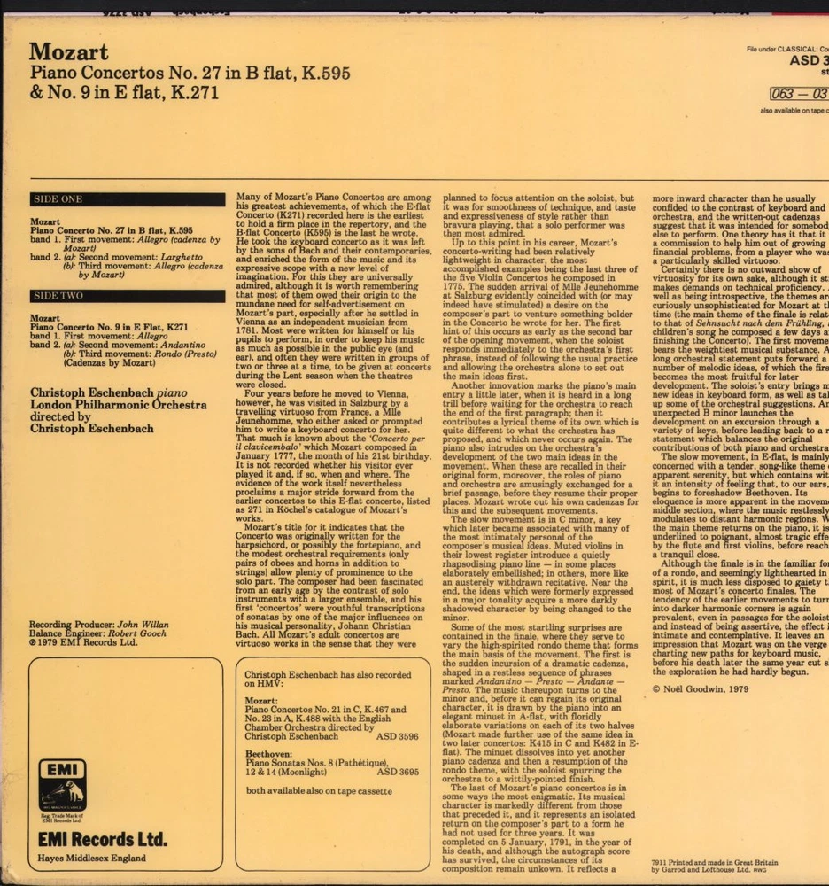 GRADING Our Grading System The table below is an overview of how our grading system works. The first grade is for the sleeve and second grade is for the media/disc, e.g. VG+/EX means that the item's sleeve is in Very Good Plus condition and the media/disc is in Excellent condition. If there is only one condition, e.g. /EX, it means that the item is not in a picture sleeve and that the media/disc is in excellent condition. Records that aren't in picture sleeves will either be in a company sleeve or a generic plain sleeve. If you have any questions, please get in touch. Condition Sleeve Media MINT (10/10) Mint, perfect Mint, perfect EX+ (9/10) Excellent plus, near mint Excellent plus, near perfect EX (8/10) Excellent, well looked after, clean, only slight signs of use Excellent, well looked after, clean, only slight signs of use EX- (7/10) Excellent minus, light wear and signs of use Excellent minus, light wear and signs of use VG+ (6/10) Very good plus, some moderate wear Very good plus, some scuffs, no deep marks VG (5/10) Very good, well used and worn Very good, well used and marked VG- (4/10) Very good minus, very worn Very good minus, very worn and marked GOOD (3/10) Good, some major wear Good, some major wear and scuffing FAIR (2/10) Fair, major wear Fair, major wear and scuffing POOR (1/10) Poor, severe wear Poor, severe wear and scuffing DELIVERY Combined Postage If you add all the items you wish to purchase from us to your shopping basket/cart, and then go to the checkout page from the shopping basket page, the shipping cost will be automatically combined. Packaging All of our items are parcelled using strong specially designed packaging, each vinyl in an order is placed in a clear plastic sleeve and plain paper white sleeve, and is separated from its cover (unless it is advertised as sealed), to prevent any damage during transit. If an item is sealed, and you would prefer the vinyl to be placed outside of its sleeve before dispatch, please let us know. Prices You can see all delivery options and prices for an item on the "Postage and payments" tab. Tracked delivery If you wish to have a tracking number with your order, please select the "Signed" or "Express" delivery option, "Standard" delivery does not include a tracking number. SHOP Click here to view our Ebay shop, with over 200,000 items in stock FAQ Does a used item include the original inner sleeve/insert/poster etc.? We will always include in the description if a used item includes any additional parts, e.g. "with inner" or "includes poster", if you know an item originally came with any additional parts, such as a printed inner sleeve, and it isn't mentioned in the description, then generally the used item won't include it, but please feel free to ask. New items will always be complete, unless otherwise specified. CATEGORIES Shop Home 10" Vinyl Records 12" Vinyl Records 7" Vinyl Records Cassettes (Tape) CDs (Compact Discs) LP Vinyl Records Music Memorabilia Other Artist Christoph Eschenbach / London Philharmonic Orchestra Title Mozart - Piano Concertos Nos. 9 & 27 Format LP Vinyl Country UK Label His Master's Voice Catalogue Number ASD3776 Year 1979 Description 6 track stereo Condition (Sleeve/Disc) EX-/EX Track List Piano Concerto No. 27 In B Flat, K.595 - A1. 1st Movement: Allegro - A2. 2nd Movement: Larghetto - A3. 3rd Movement: Allegro Piano Concerto No. 9 In E Flat, K.271 - B1. 1st Movement: Allegro - Cadenza - B2. 2nd Movement: Andantino - B3. 3rd Movement: Rondo DELIVERY INFORMATION If you wish to have a tracking number with your order, please choose the Signed or Express delivery option, the Standard delivery option does not include a tracking number. Please note, the Express option for delivery outside of the UK includes a tracking number, but has the same delivery time as the Standard option. WE HAVE MORE CHRISTOPH ESCHENBACH / LONDON PHILHARMONIC ORCHESTRA ITEMS IN STOCK We have more items in stock by this artist, click here to see them. ABOUT US Vinyl Tap has been in the business of selling music for over 30 years, and in that period we have supplied many thousands of collectors and music fans around the globe with vinyl, CDs and music memorabilia. You can check out the over 200,000 items that we have in stock on our Ebay shop, here . Artist: Christoph Eschenbach / London Philharmonic Orchestra - Title: Mozart - Piano Concertos Nos. 9 & 27 - Format: LP Vinyl - Country: UK - Label: His Master's Voice - Catalogue Number: ASD3776 - Year: 1979 - Description: 6 track stereo