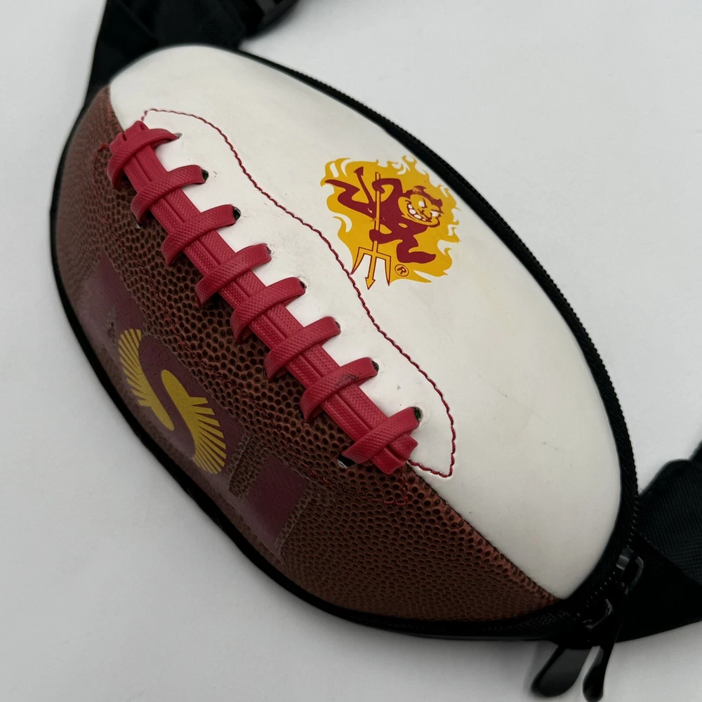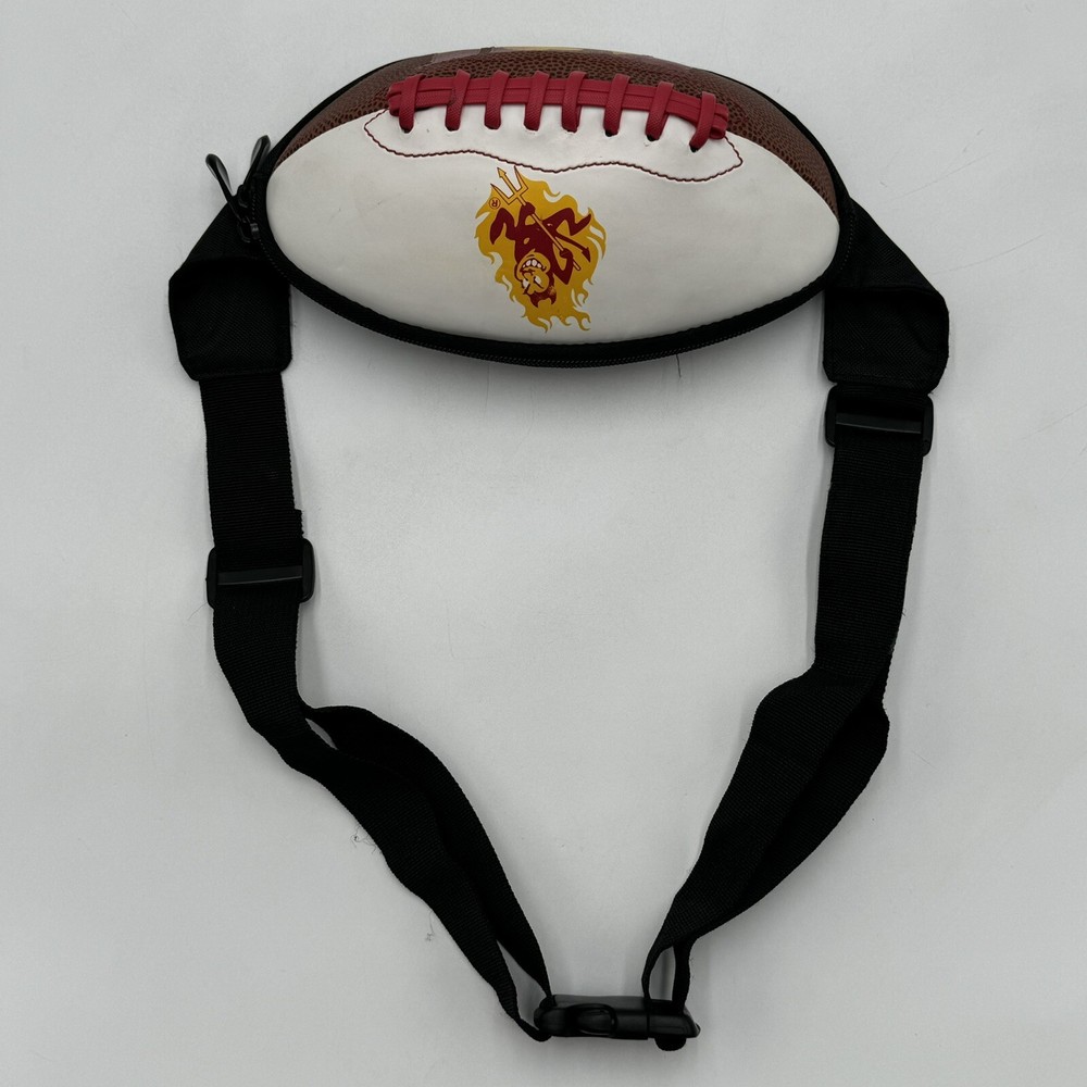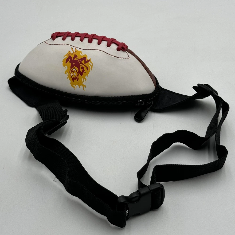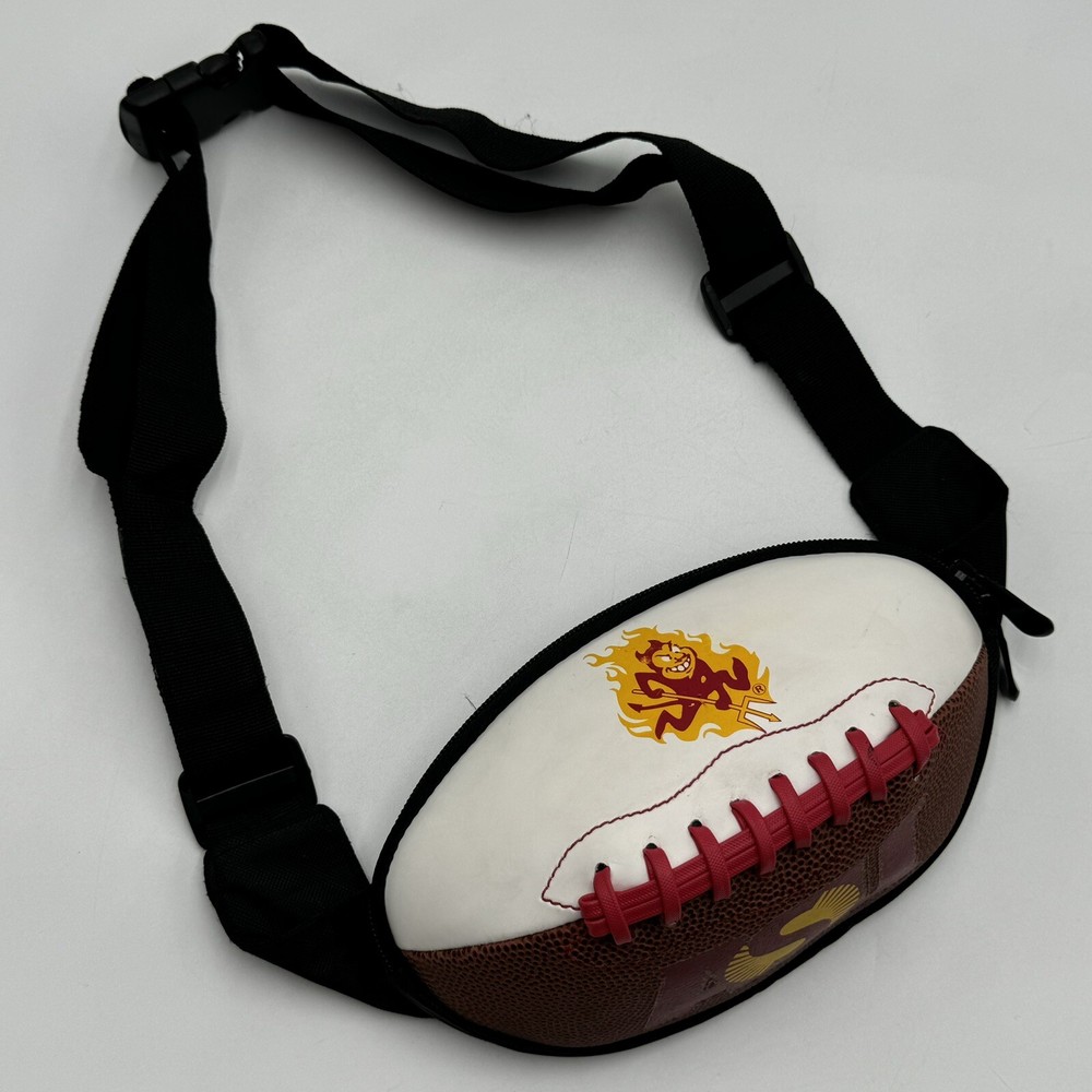 Show off your team spirit with this NCAA ASU Arizona State University Sun Devils Football Fanny Pack Body Bag/Purse. Perfect for game day or any day, this unisex adult-sized fanny pack is designed with the team's colors and logo. It's a great way to keep your essentials close while cheering on your favorite team. Made from high-quality materials, this collegiate licensed product is durable and built to last. The fanny pack is one size fits all, making it a versatile accessory for any fan. Whether you're heading to the stadium or just running errands, this Arizona State Sun Devils fanny pack is a must-have for any fan. The sun devil mascot is a little smudged, this fanny pack has been used but is still in good condition