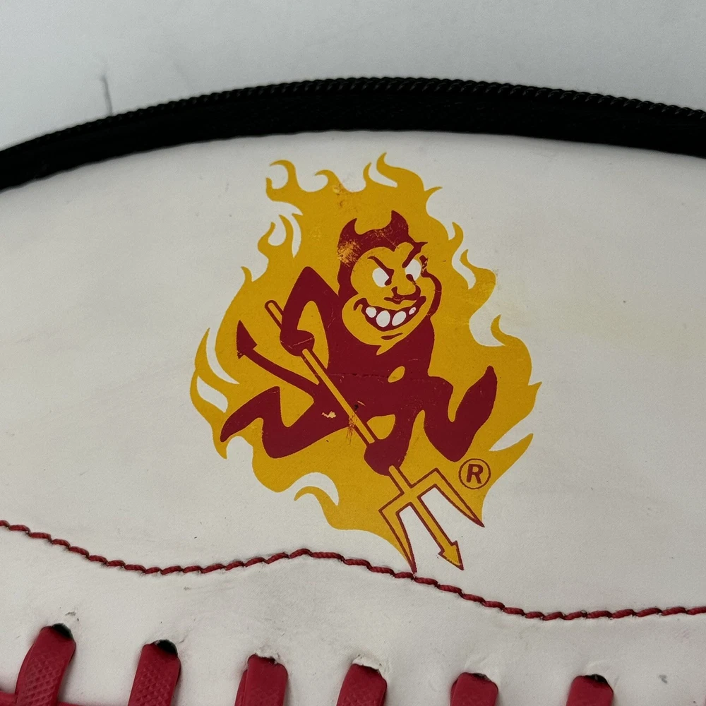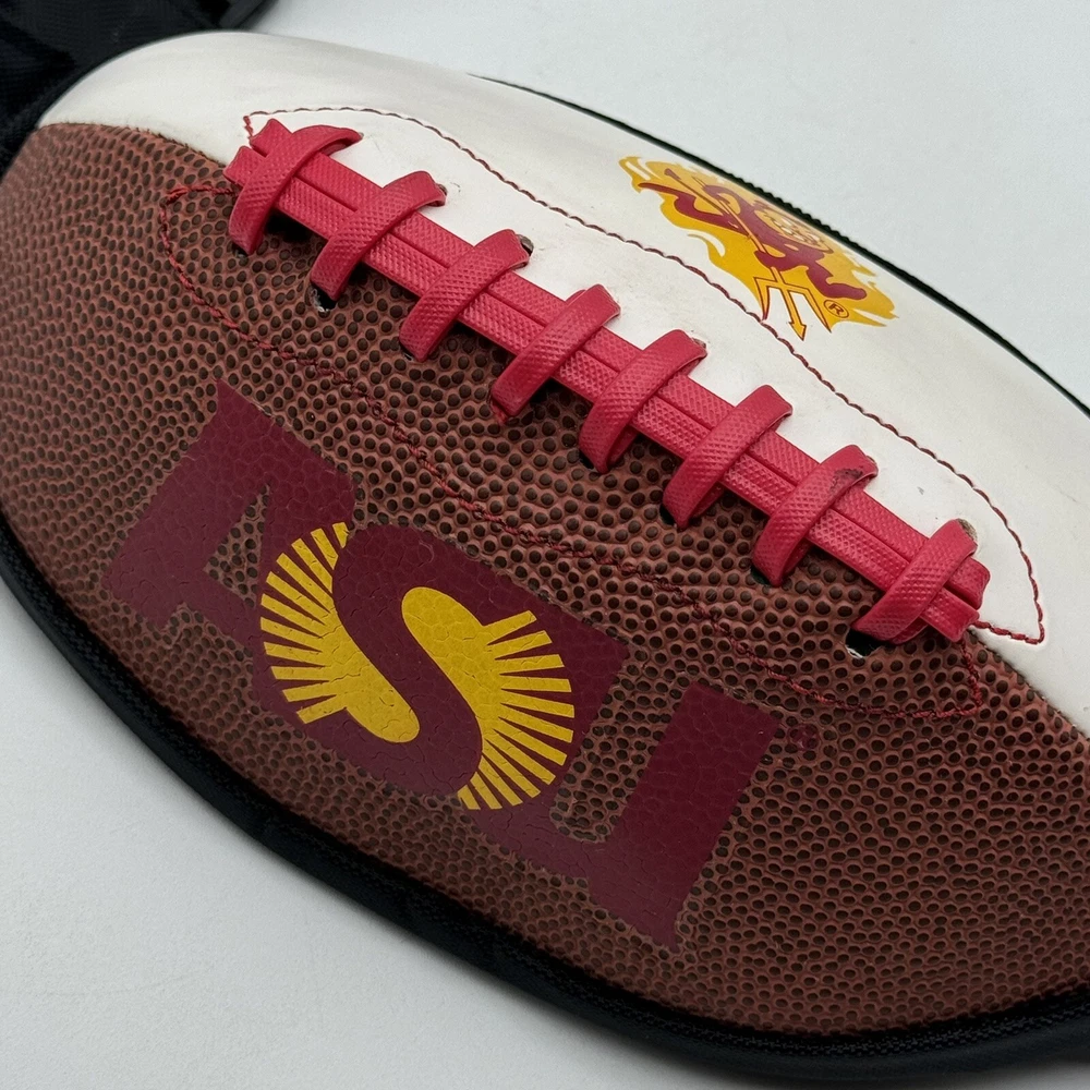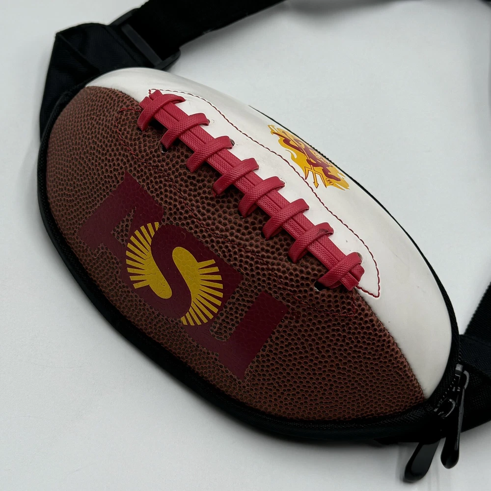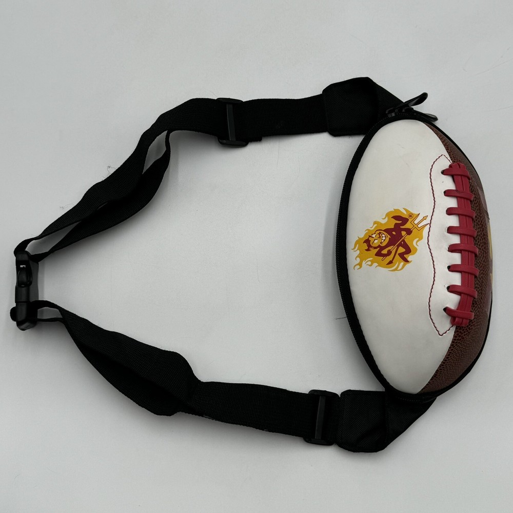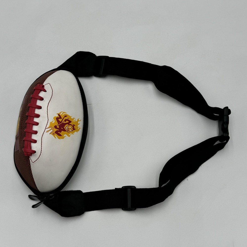 Show off your team spirit with this NCAA ASU Arizona State University Sun Devils Football Fanny Pack Body Bag/Purse. Perfect for game day or any day, this unisex adult-sized fanny pack is designed with the team's colors and logo. It's a great way to keep your essentials close while cheering on your favorite team. Made from high-quality materials, this collegiate licensed product is durable and built to last. The fanny pack is one size fits all, making it a versatile accessory for any fan. Whether you're heading to the stadium or just running errands, this Arizona State Sun Devils fanny pack is a must-have for any fan. The sun devil mascot is a little smudged, this fanny pack has been used but is still in good condition