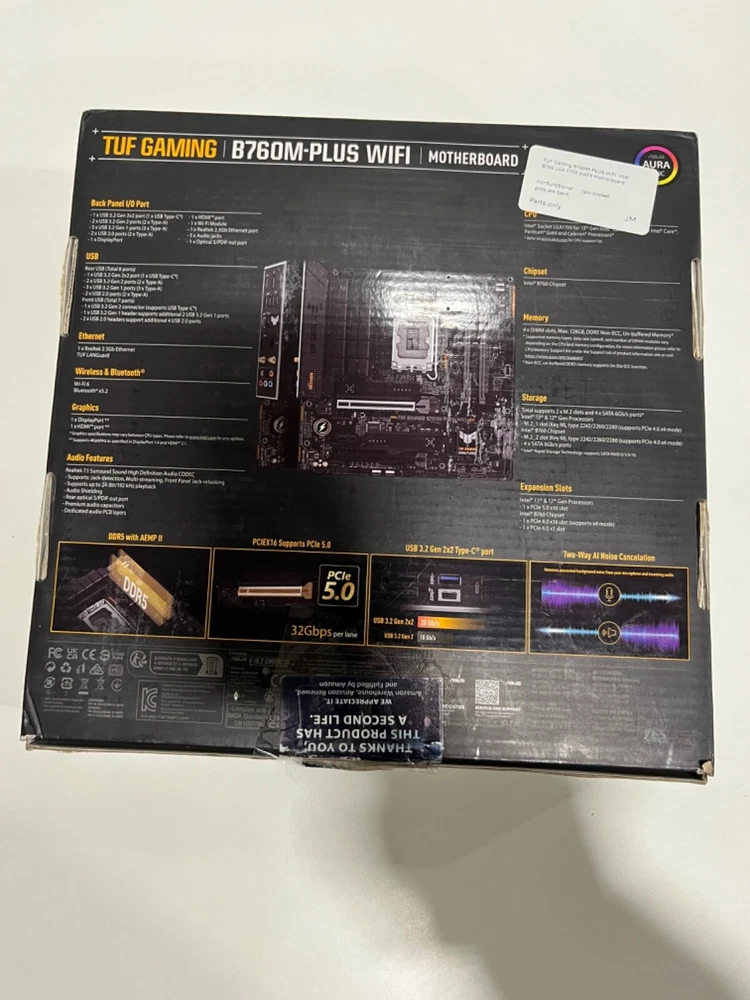 Brand: ASUS MPN: 90MB1ET0-M0AAY0 Number of Memory Slots: 4 UPC: 197105121331 Memory Type: DDR5 SDRAM Expansion Slots: M.2, PCI Express 5.0x16, PCI Express 4.0x1, PCI Express 4.0 x16 gtin13: 197105121331 Model: ASUS TUF Gaming B760M-PLUS WiFi Form Factor: MicroATX Input/Output Ports: DisplayPort, HDMI, Ethernet (RJ-45), USB 2.0, USB-C, USB 3.1 Compatible CPU Brand: Intel Most Suitable For: Gaming Socket Type: LGA 1700/Socket V