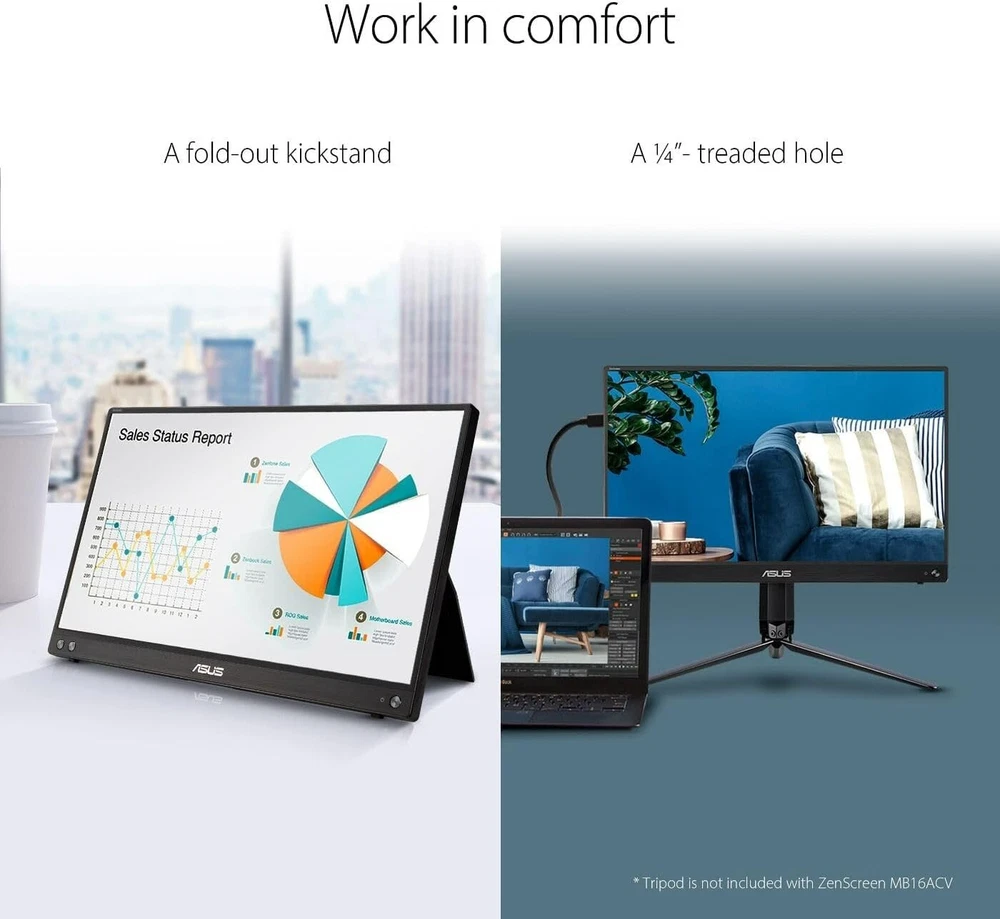 ASUS ZenScreen 15.6” 1080P Portable Monitor (MB16ACV) - Black DESCRIPTION ASUS ZenScreen 15.6” 1080P Portable Monitor (MB16ACV) - Black ASUS ZenScreen™ MB16ACV is ideal for life on the road. This sleek portable display weighs just 0.83kg and has an 10.5 mm slim profile, so it fits easily in any travel bag and is ready for productivity, anytime and anywhere. ZenScreen MB16ACV uses an innovative USB-C hybrid-signal connection that handles both power and video signals. Its reversible, any-way-up USB-C design allows for quick connections to compatible devices, and there's also a driver1 that enables support for USB Type-A connectors. A fold-out kickstand props the monitor up on any flat surface, enabling easy tilt adjustments to ensure comfortable viewing angles and working positions. A ¼”-threaded hole at the rear of the monitor lets you to attach ZenScreen MB16ACV to a conventional tripod2 or table-mount easily. With ASUS DisplayWidget software, ZenScreen MB16ACV can automatically sense its orientation and switch the display between landscape and portrait modes while connected to your laptop. Landscape mode is ideal for presentations and spreadsheets, while Portrait mode gives you a perfect view of items such as documents, books or websites. A proprietary antibacterial ionic silver treatment4 embedded in the bezels and rear of ZenScreen MB16ACV offers long-lasting protection, inhibiting up to 99.9% bacterial growth and adhesion to keep key areas of the monitor clean and hygienic. It potentially reduces the spread of harmful bacteria so you can feel safe while working on the go. ZenScreen MB16ACV features TÜV Rheinland-certified ASUS Flicker-free technology to reduce flicker, ensuring comfortable viewing experiences. This technology helps minimize eyestrain and other ailments typically associated with extended hours of viewing. 15.6-inch Full HD portable anti-glare IPS display with an ultraslim and thin design, perfect solution for travel, on-the-go meetings, or business trips Proprietary long-lasting antibacterial treatment to inhibit the growth of bacteria and fungi on the monitor Features a hybrid-signal solution which supports power and video transmission, and enables compatibility with any laptop with a USB Type-C or Type A port ASUS Eye Care monitors feature TÜV Rheinland-certified Flicker-free and Low Blue Light technologies to ensure a comfortable viewing experience Kickstand design to prop the monitor up in either portrait or landscape mode easily Proprietary long-lasting antibacterial treatment to inhibit the growth of bacteria and fungi on the monitor Inputs/Connections Signal Input USB Type-C Native Resolution and Aspect Ratio Full HD 1920 x 1080-Aspect Ratio 16:9 Response Time 5ms Refresh Rate 60Hz Contrast Ratio 800:1 contrast ratio provides great execution for displaying the darkest black and brightest white ITEM SPECIFICS Brightness: 250 cd/m² MPN: MB16ACV Most Suitable For: Casual Computing, Graphic Design Display Type: LCD Color: Black Brand: ASUS Refresh Rate: 60 Hz Contrast Ratio: 800:1 Features: Portable, Widescreen Screen Size: 15.6 in Aspect Ratio: 16:9 Maximum Resolution: 1920 x 1080 PAYMENT Prompt payment is mandatory for all Buy It Now purchases. Accepted Payment Methods: Credit/Debit Cards: We accept major credit and debit cards including Visa, Mastercard, and Discover. Mobile Payments: Enjoy quick and secure payment options with Venmo, Apple Pay, and Google Pay. Online Payments: We also accept payments through PayPal, providing a reliable option for secure online transactions. SHIPPING Same-day shipping is available for orders placed before 3 PM, following payment completion. Buyers will receive a shipment notification with a tracking number. Orders made on weekends will ship on Monday. Items are shipped via USPS, FedEx, or UPS, depending on location and package weight. RETURN 30-Day Return Policy We want you to be completely satisfied with your purchase. If for any reason you are not happy with your item, you can return it within 30 days of receiving it for a full refund. ABOUT US We are a team of e-commerce experts who believe in making shopping a delightful experience. Our extensive knowledge of market trends and consumer preferences drives us to offer you a wide selection of products, from everyday essentials to unique finds, all sourced with care and attention to detail at prices you can truly afford. FEEDBACK Logitech G733 Lightspeed Wireless RGB Gaming Headset PS4, PS5, PC $69.99 ASUS RT-AX3000 Dual Band WiFi 6 Router 802.11ax Lifetime Internet Security, VPN $69.99 ASUS RT-AX3000 Dual Band WiFi 6 Router 802.11ax Lifetime Internet Security, VPN $94.95 Never-Worn HBO Exclusive Merchandise Band of Brothers Leather Jacket Size XL $149.99 Wilsons Adventure Bound Heavy Suede Men's Leather Jacket Sherpa Lined M $69.95 Add suggested items to your listings - Check it out on 3Dsellers.com Powered By 3D sellers.com - Try for Free!