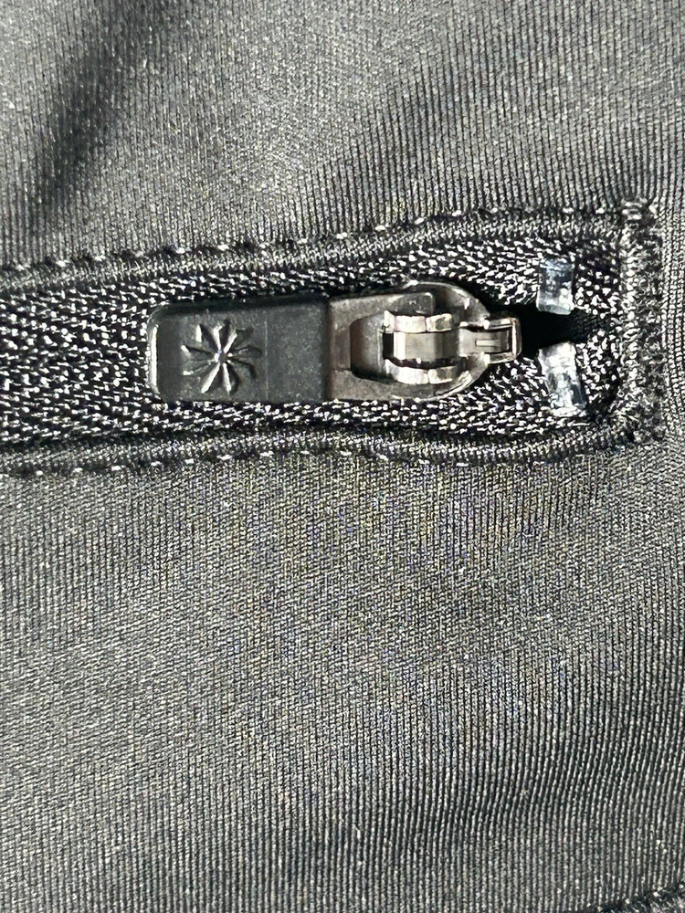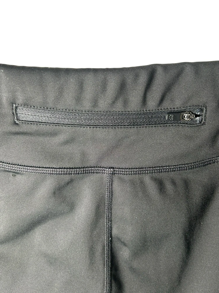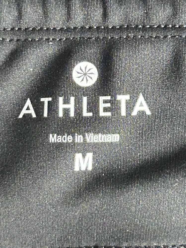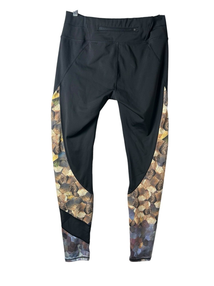 ATHLETA ASYM Mesh Sonar Leggings. Designed for women in size medium, these leggings are black with a light multi colored print in lower legs. One leg had a mesh opening across leg. Logo. Back zipper Pre ❤️. EXCELLENT CONDITION ✨