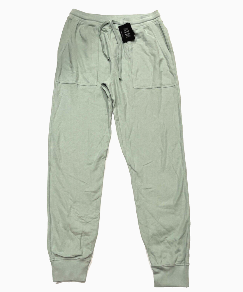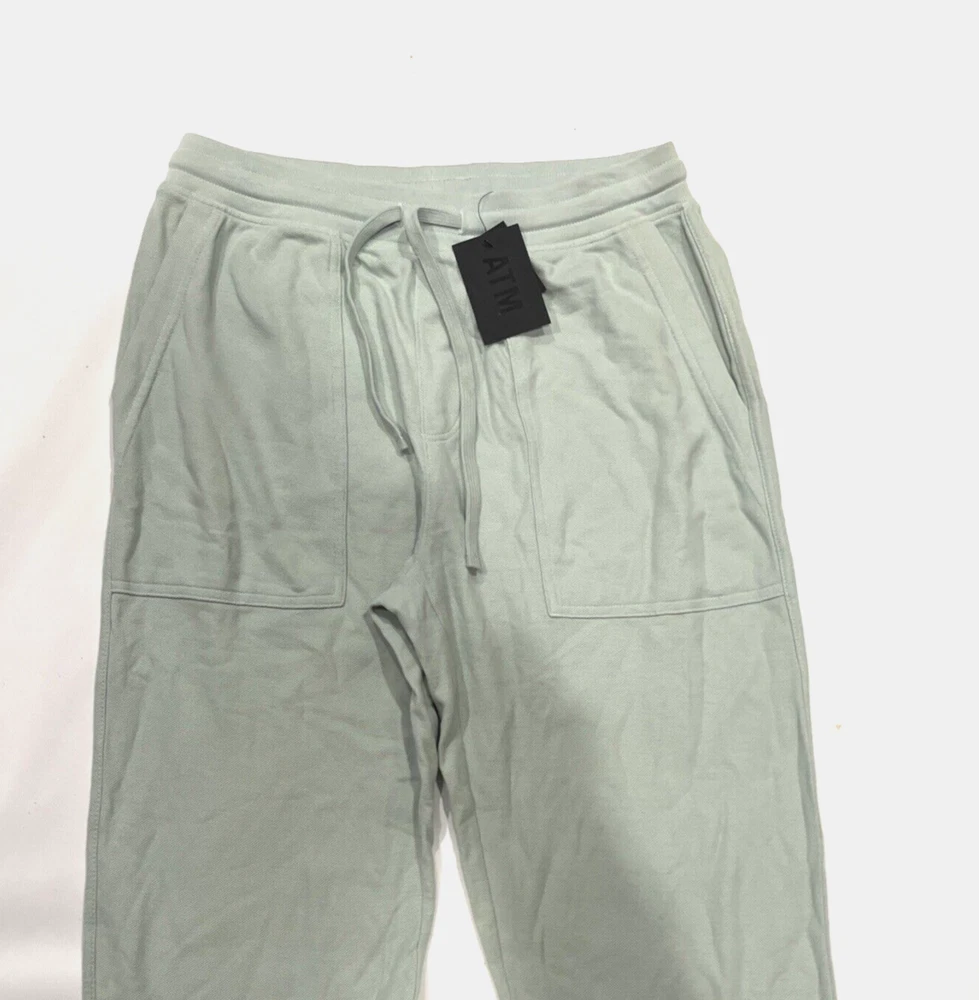 ATM Anthony Thomas Melillo men's Drawstring Jogger Pants size: Small color: Eucalyptus Green Elasticized drawstring waistband Faux front fly Hip patch pockets Back right patch pocket Banded cuffs Pull-on style 100% cotton inseam 31" Hand wash retail $195 R1106