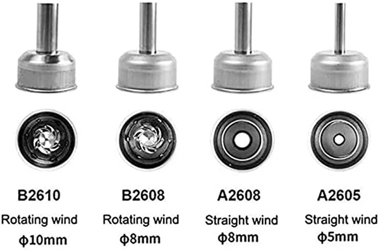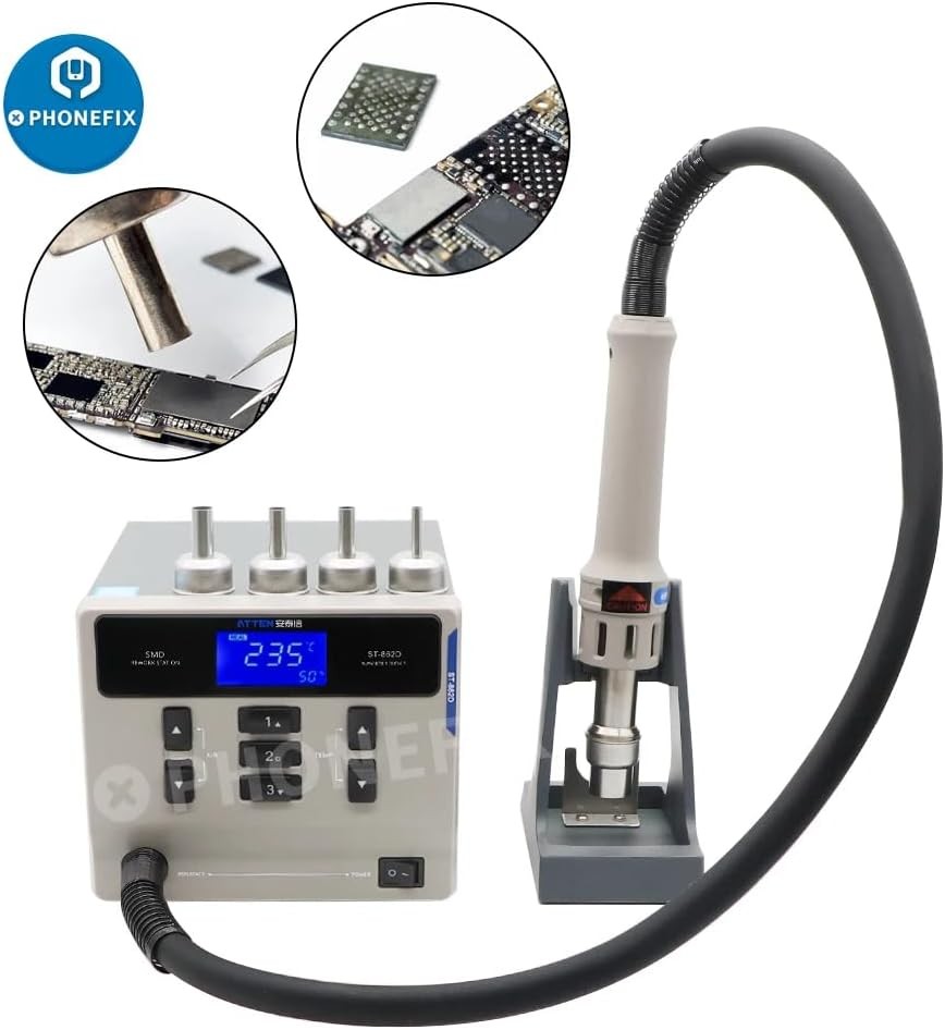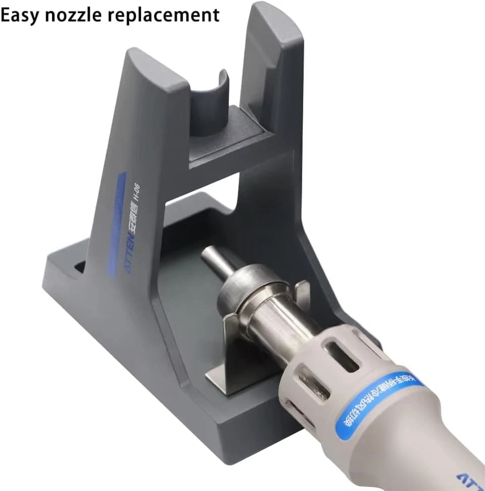 Intelligent constant temperature control system Intelligent constant temperature control, the hot air gun will automatically stop heating when it reaches the specified temperature. During use, it will collide with the air and the temperature will decrease. The hot air gun will automatically heat up and reach the specified temperature Magnetic induction automatic sleep mode The handle is equipped with a built-in magnetic induction device. When the handle is placed on the air gun bracket, the machine stops heating. When picked up and used again, press the switch on the handle to continue heating the air gun. Brushless eddy current fan The brushless vortex fan has a large air flow rate and strong air volume, making it easy to remove various components, including discrete, double row, and surface mount. Quickly replace the soldering iron bracket Quick replacement of air gun nozzle, user-friendly design, easy operation. Plug in heating element High heating efficiency, long lifespan, quick and convenient replacement of heating elements. High power transformer 1000W high power, suitable for high load areas, controllable temperature, able to work continuously, fast temperature recovery speed! Equipped with 4 air nozzles Equipped with 2 straight air nozzles and 2 cyclone air nozzles of different sizes to meet various welding needs. ATEEN 862D handle Ergonomic design, comfortable grip, lightweight and portable, with good insulation effect. LED display screen The large screen displays the working status and realizes visual human-machine operation. key Large buttons for easy operation Product size Compact and easy to place. Static grounding wire Plug and unplug design, with a wire length of about 1M, easy to use.