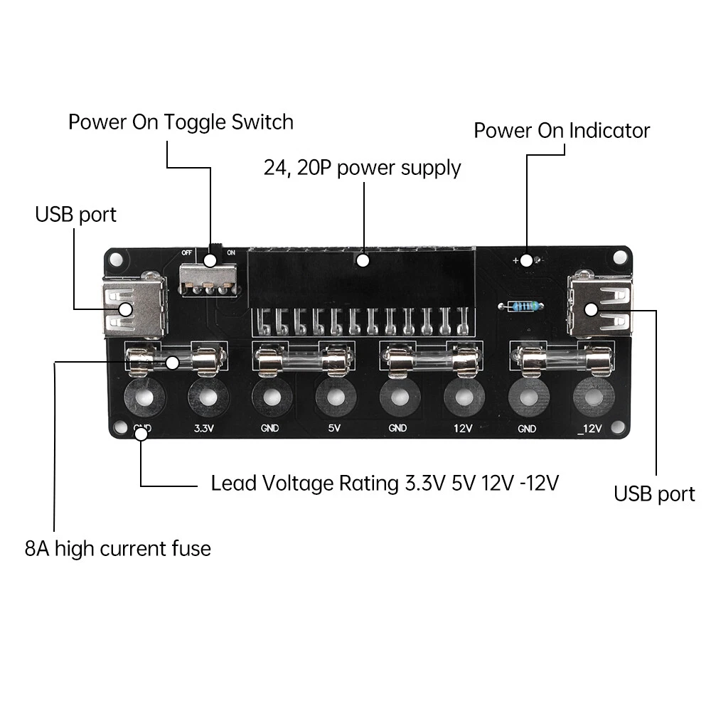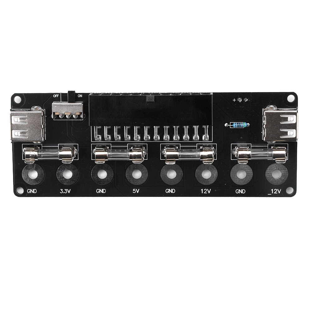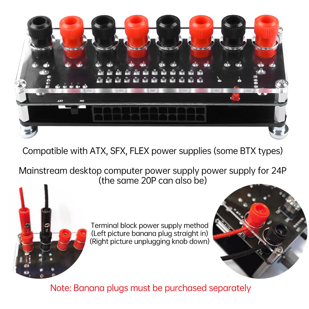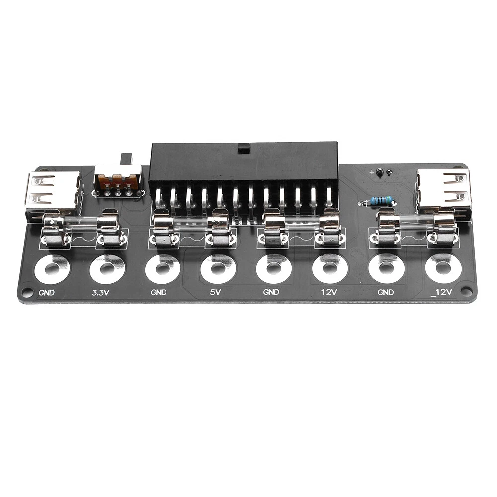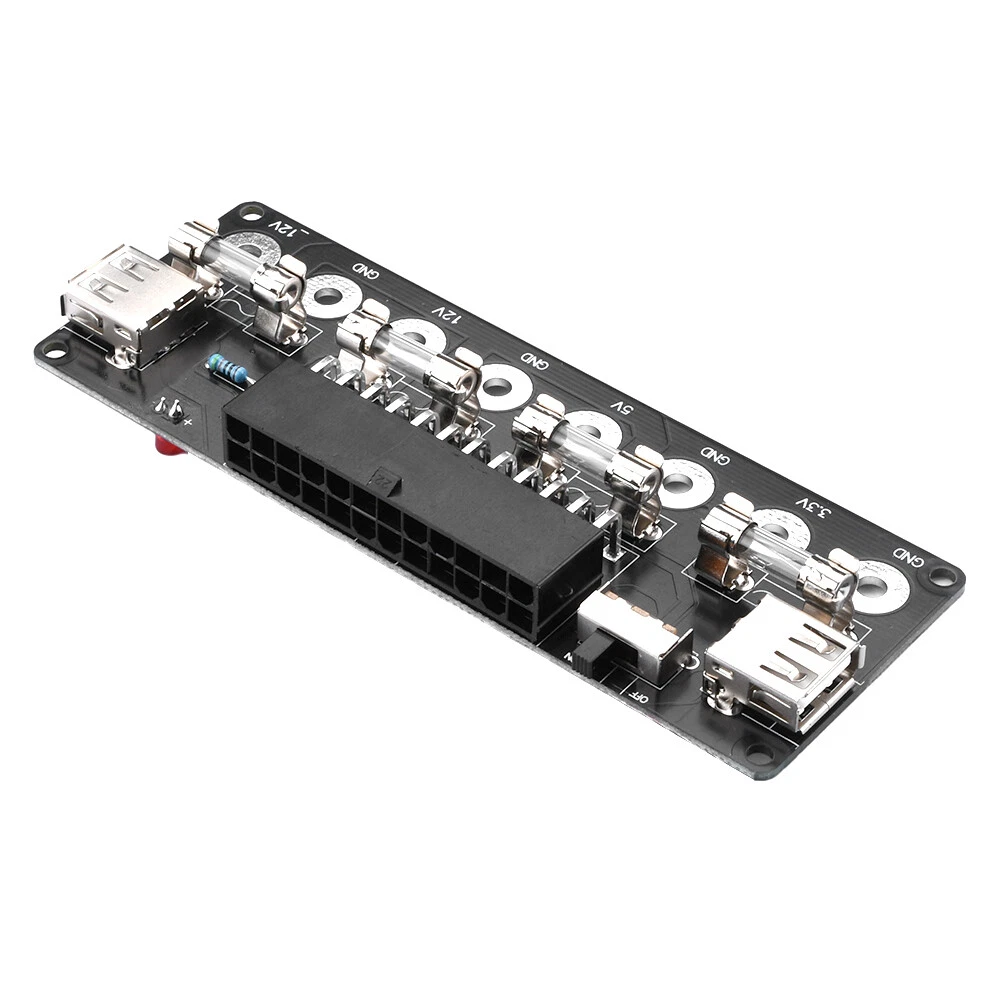 Features: 1. Easy to use, suitable for desktop computer power conversion to power on use. 2. Long service life, equipped with double-sided acrylic protective casing. 3. Safe to use, with anti electric shock and sandwich design. 4. Multiple power supplies are compatible, compatible with ATX, SFX, and FLEX power supplies (some BTX types). 5. Mainstream desktop computers support 20P and 24P interfaces for power supply. Parameter: Interface: 2 USB interfaces Power supply: 20Pin, 24Pin power supply Current: 8A (MAX) Lead out voltage levels: 3.3V, 5V, 12V, -12V Panel design: double-layer acrylic Compatible with computer power supplies: ATX, SFX, FLEX power supplies (some BTX types) Switch: toggle switch Package include: 1X power board (shipped as loose parts, customer needs to assemble it themselves) 2X acrylic board 1X accessory package